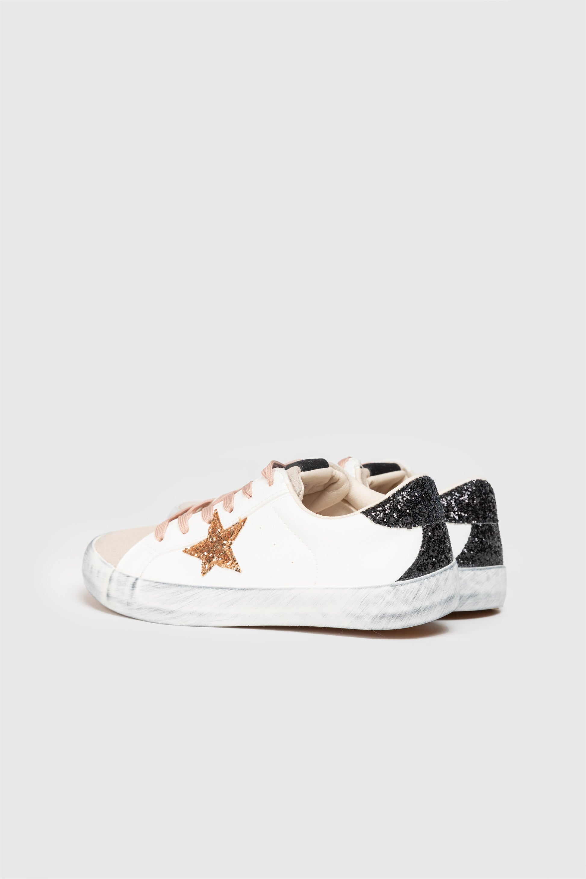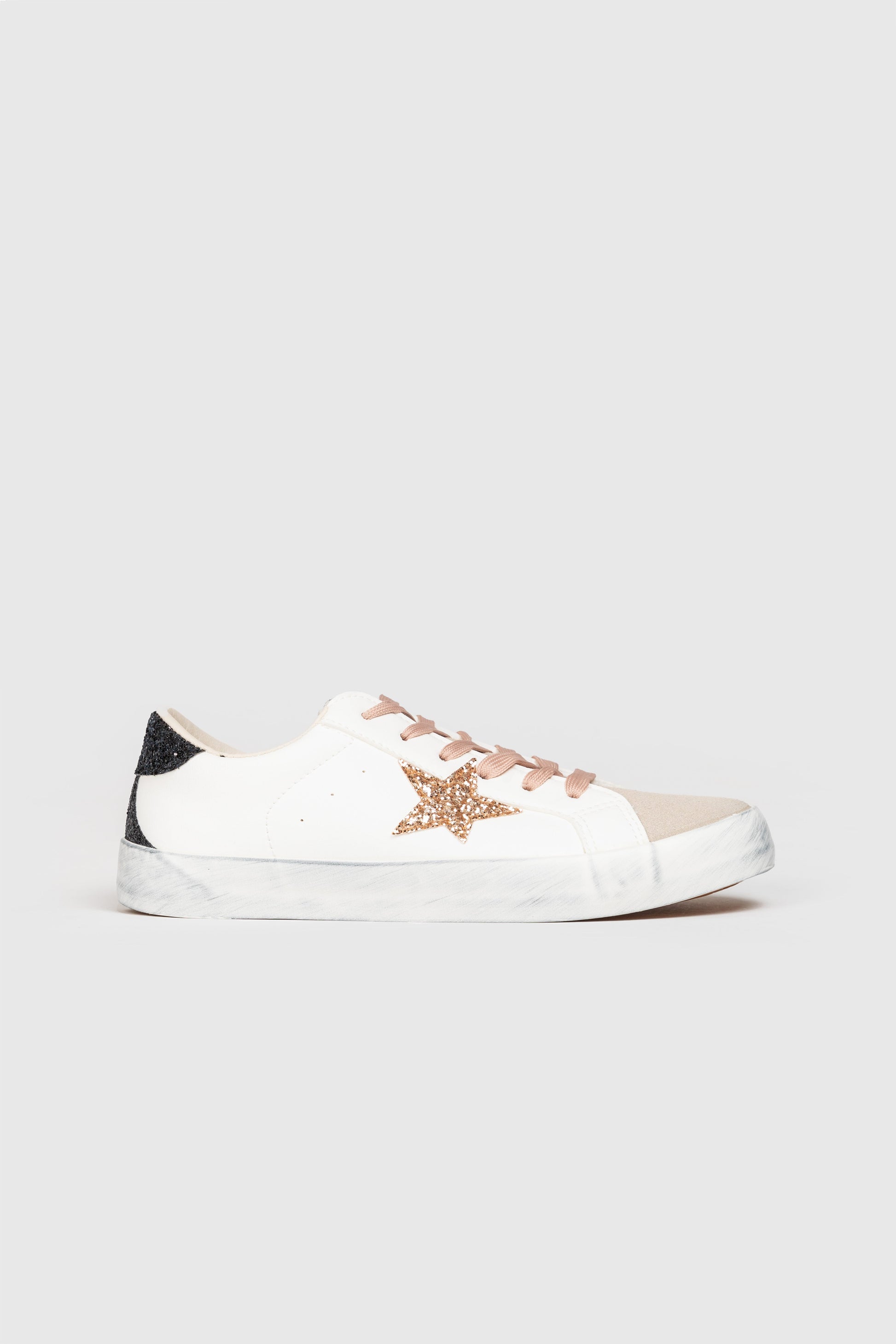 Zapato tipo deportiva. Tejido combinado. Diseño flat. Cierre de cordones. Suela raspada y manchada. Suela plana y antideslizante. Estrella brillo lateral rosa. Panel trasero brillo negro. Altura plataforma: 2.5 cm.