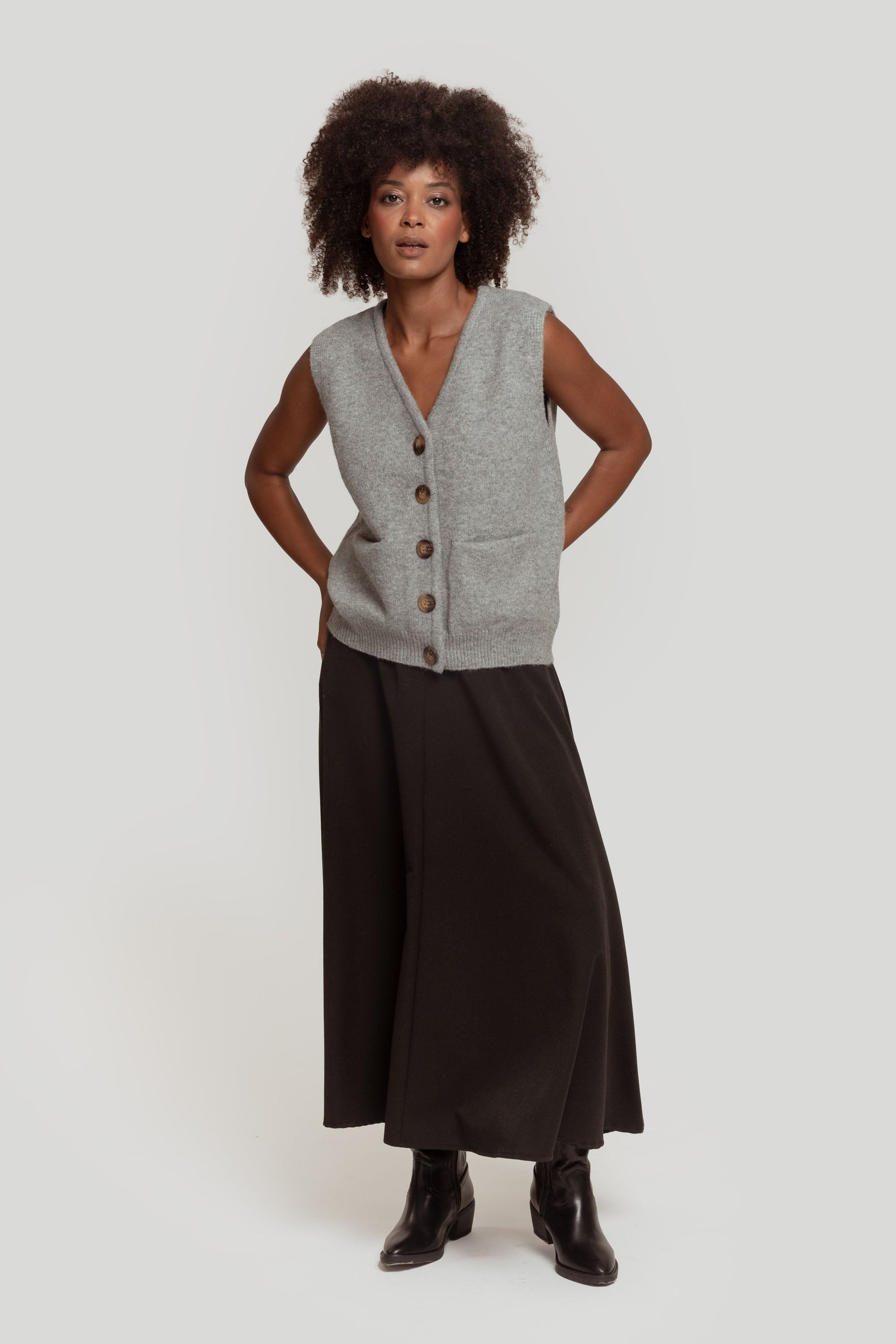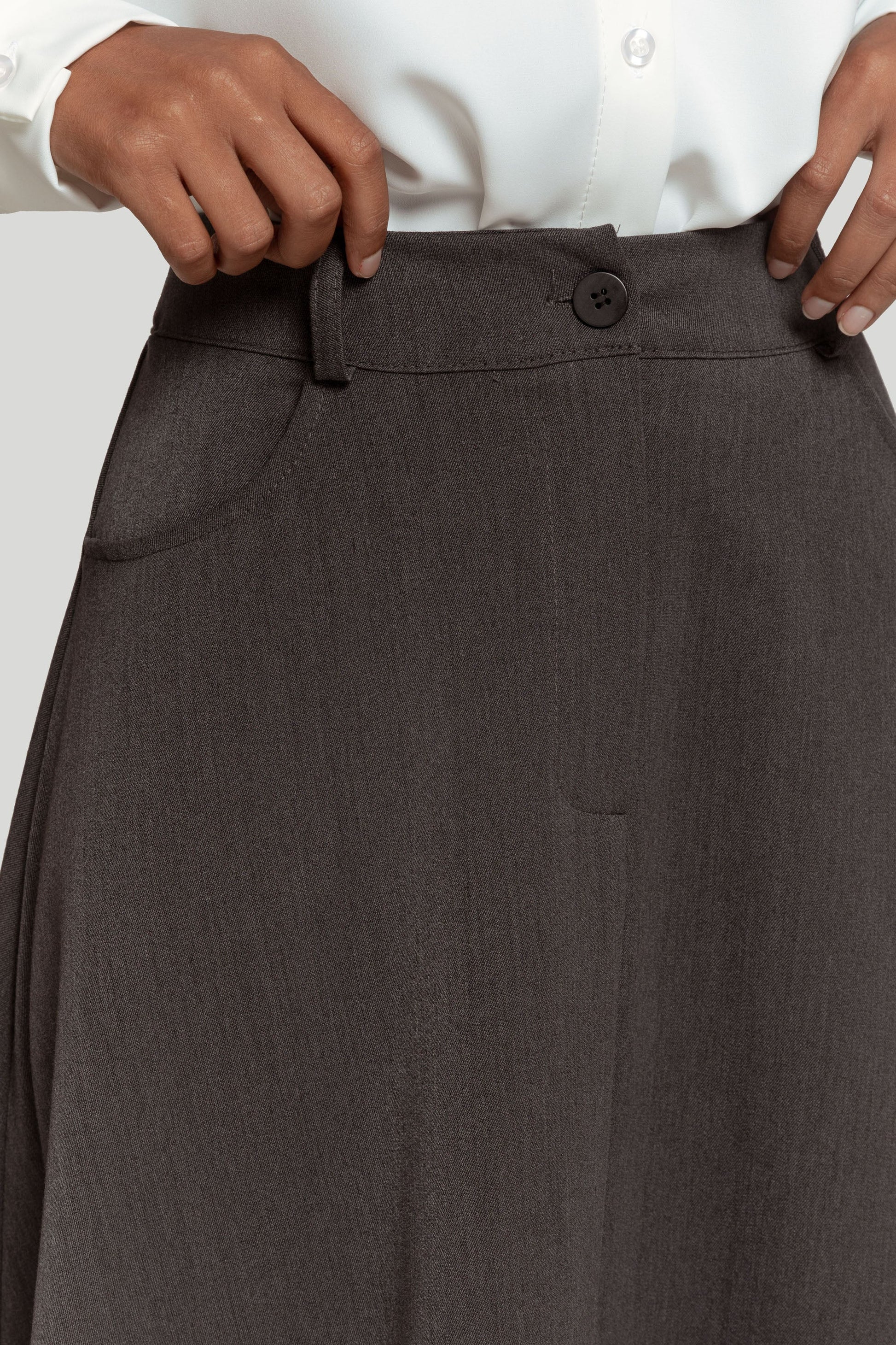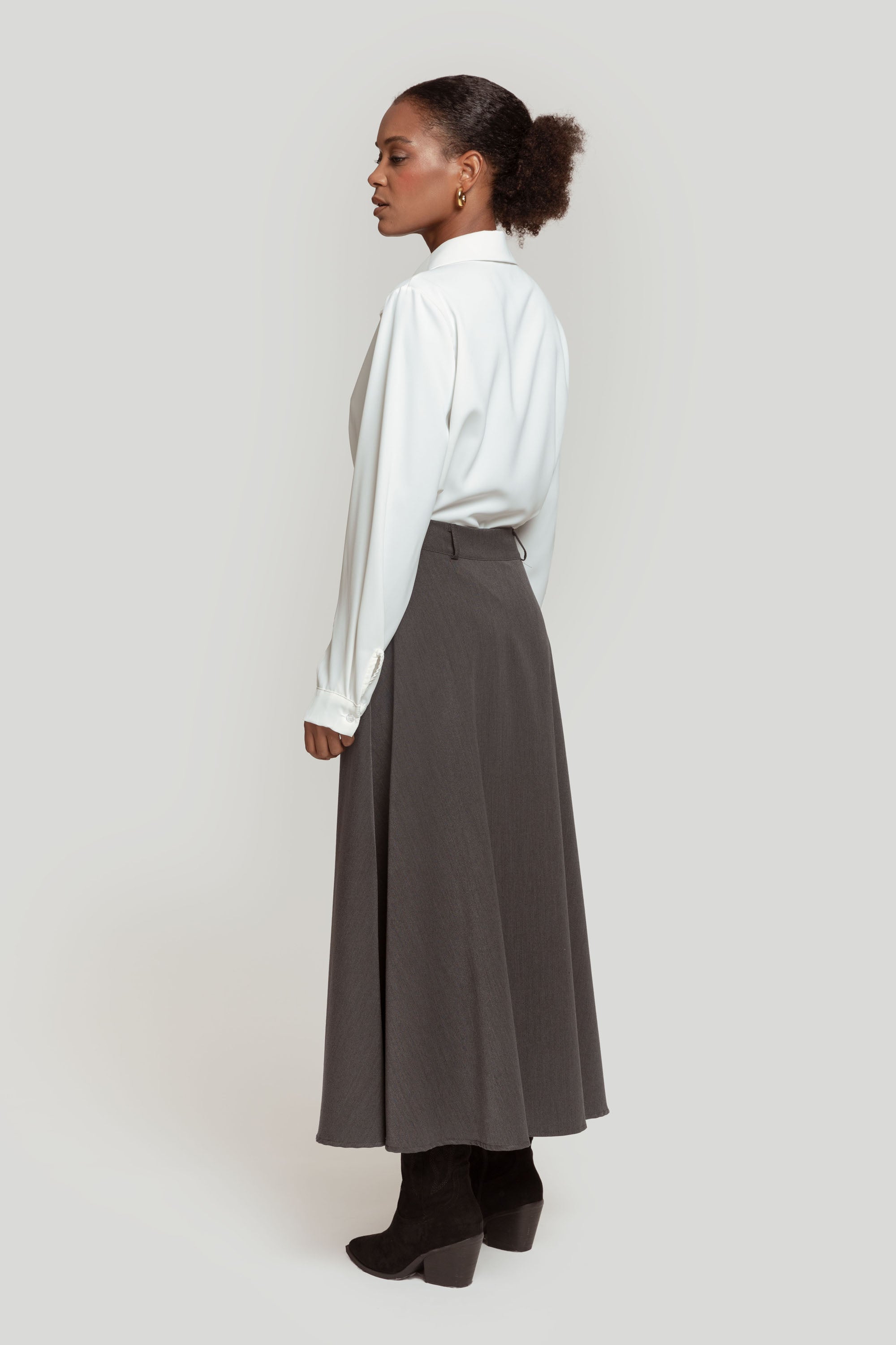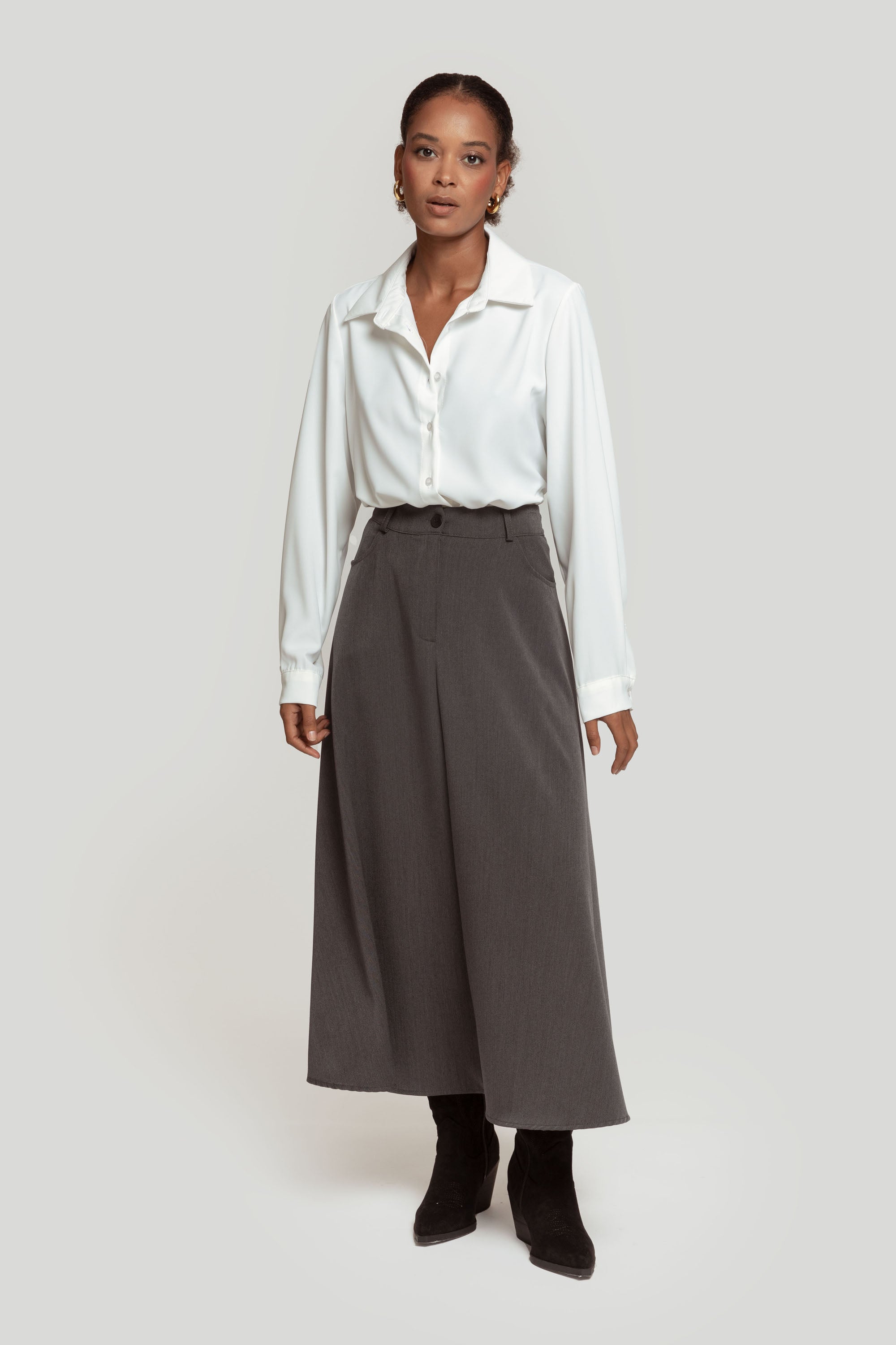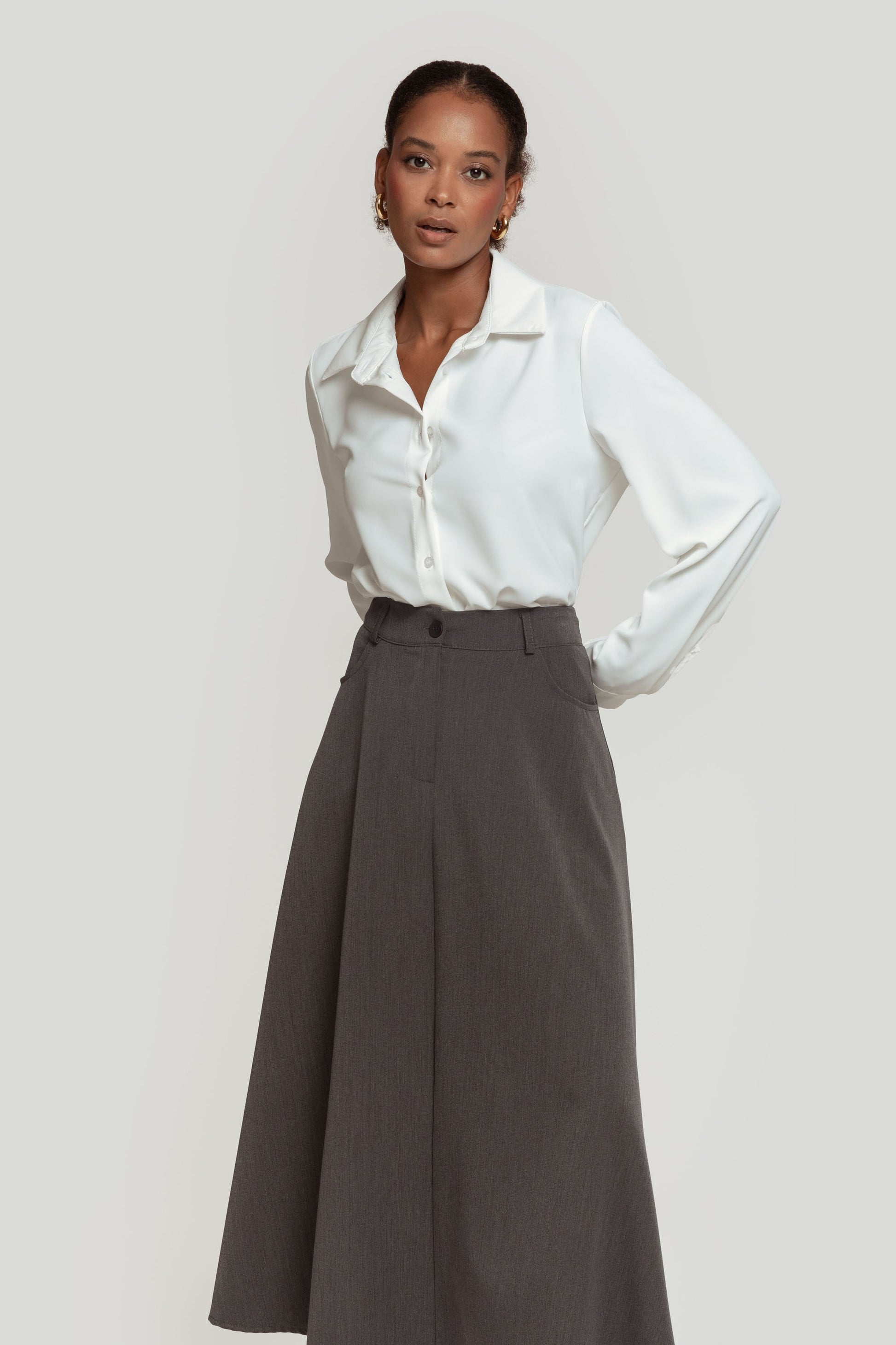 Tejido fluido. Diseño midi. Diseño evasé. Tiro alto. Cierre de cremallera y boton. Bolsillos laterales. Bajo acabado con vuelo. Trabillas. Talla modelo: S. Altura modelo 1,66 m.