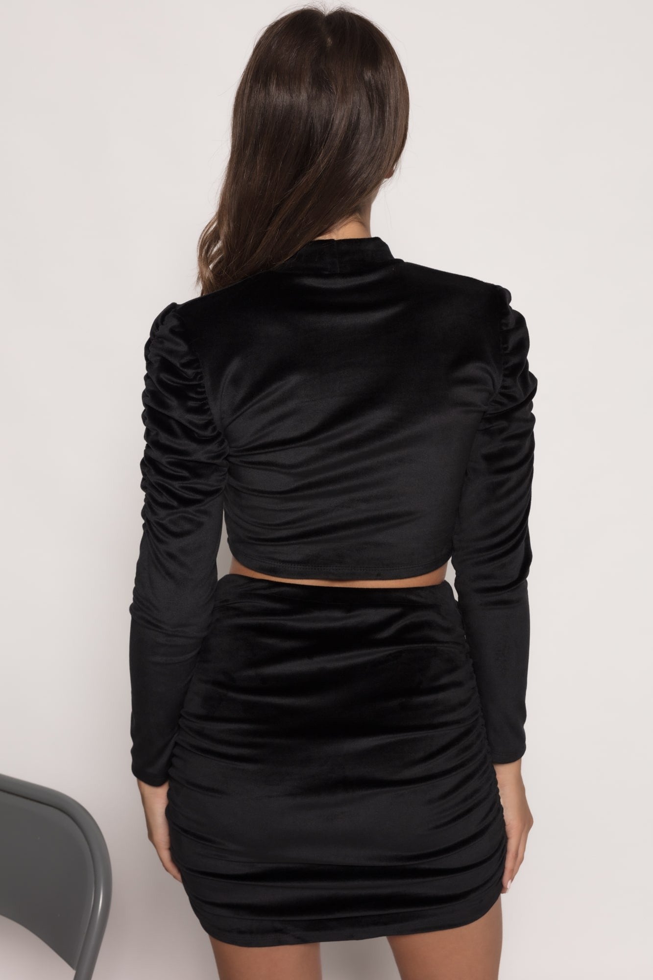 Falda de tiro alto. Cintura elástica. Detalle frunces laterales. Talla modelo: S. Altura modelo: 1,75 m.