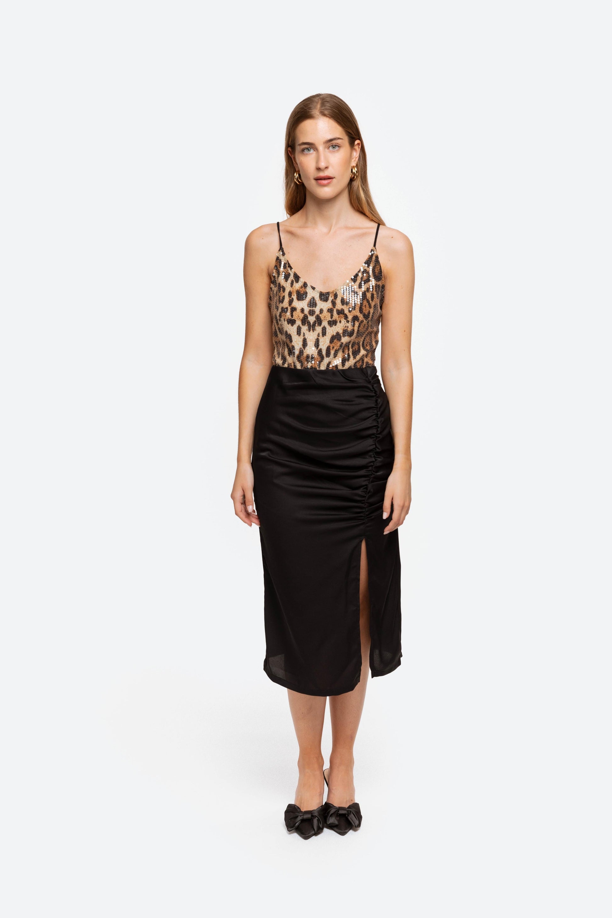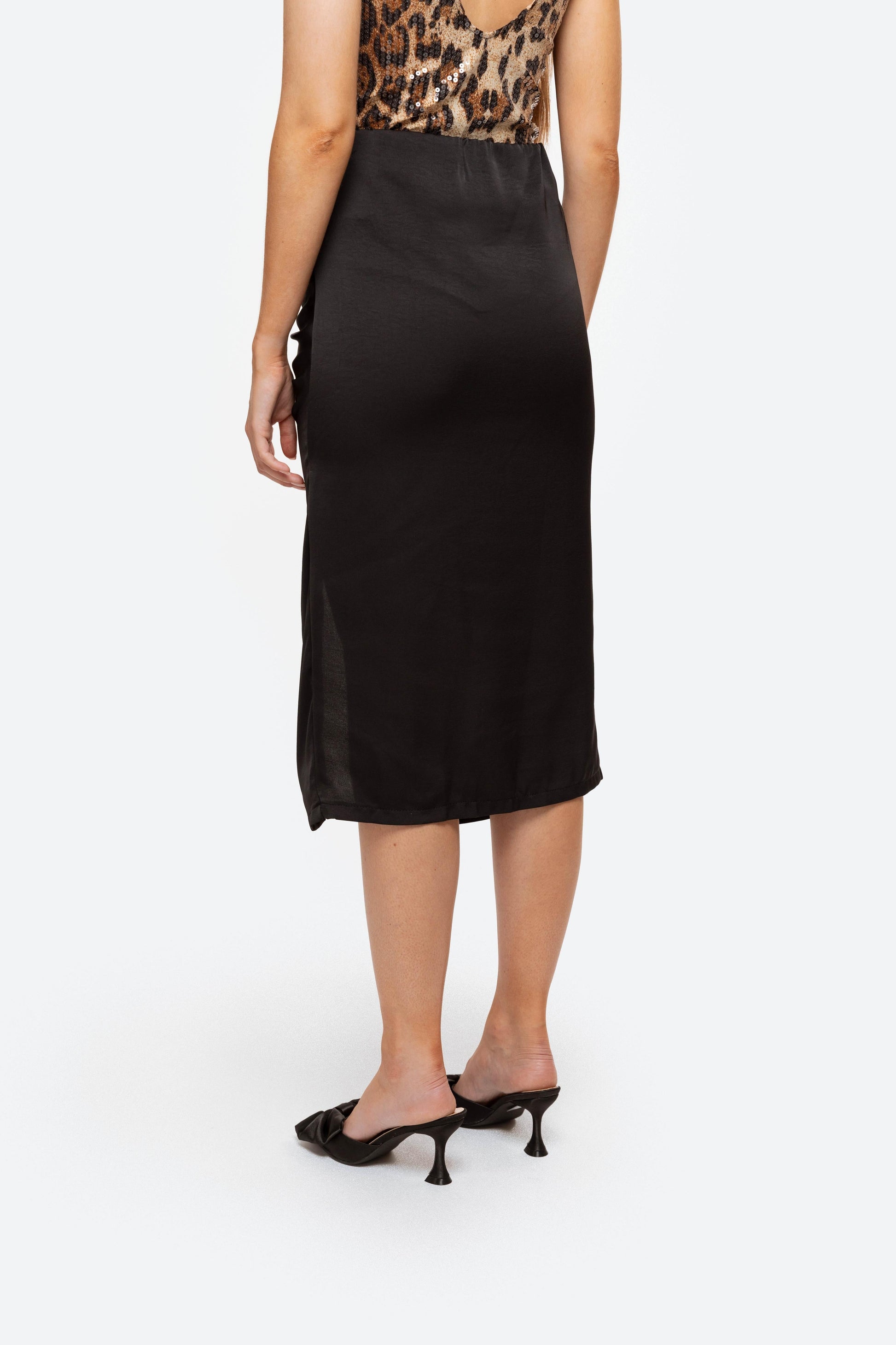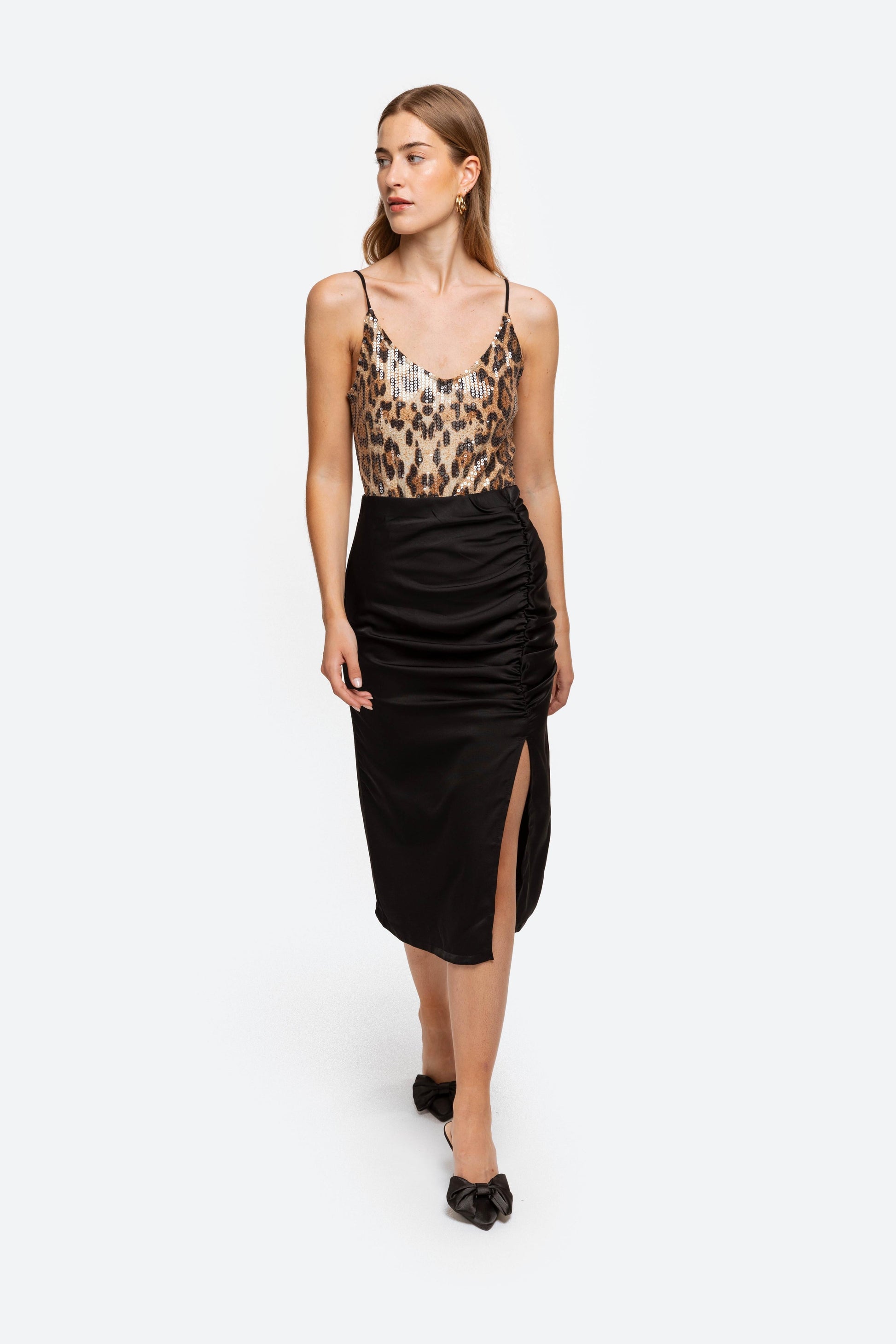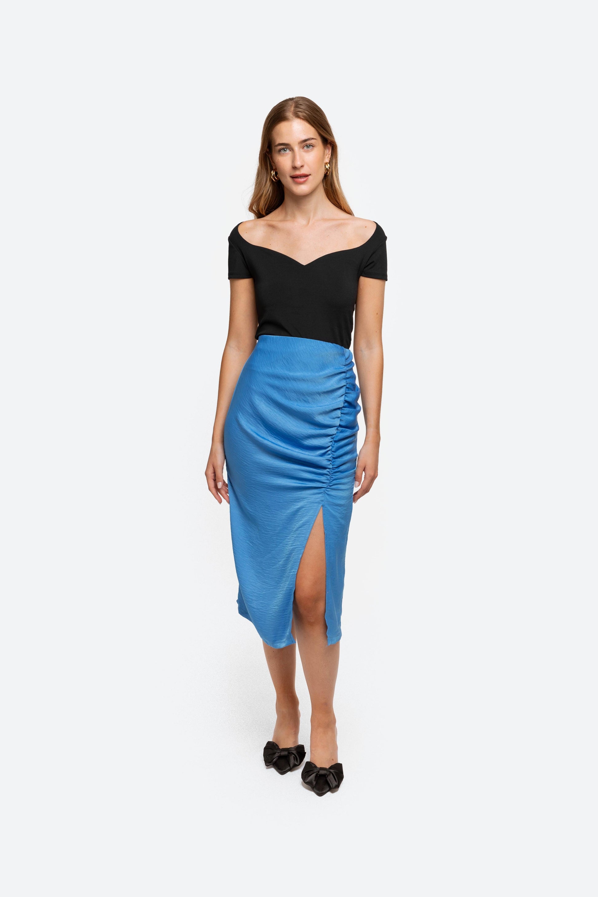 Falda midi. Tejido de acabado suave. Diseño cruzado. Tiro medio, cintura elástica. Amplia abertura. Talla modelo: S. Altura modelo: 1,73 m.