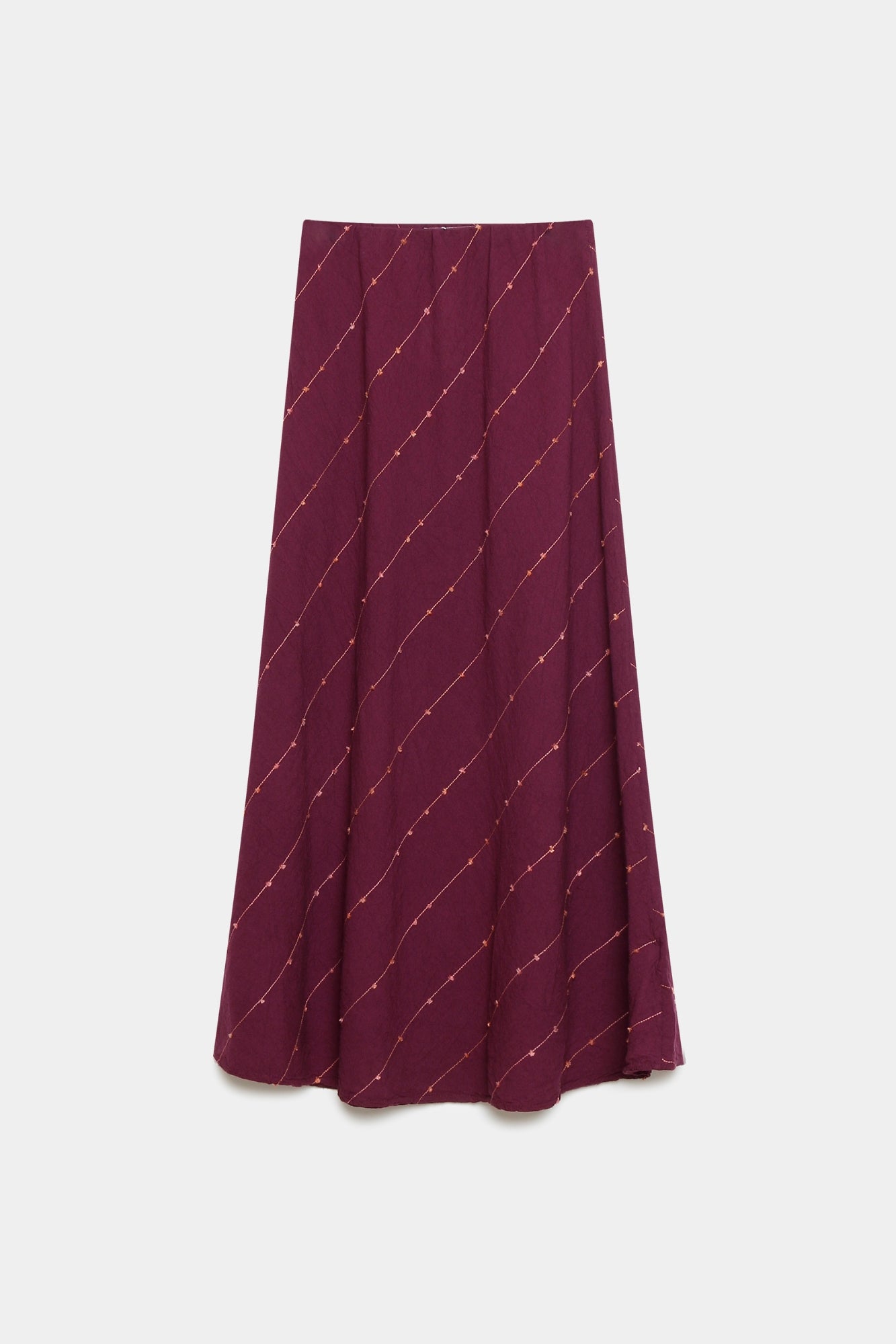 Tejido mezcla lino y algodón. Diseño midi. Cintura elástica. Detalle rayas.