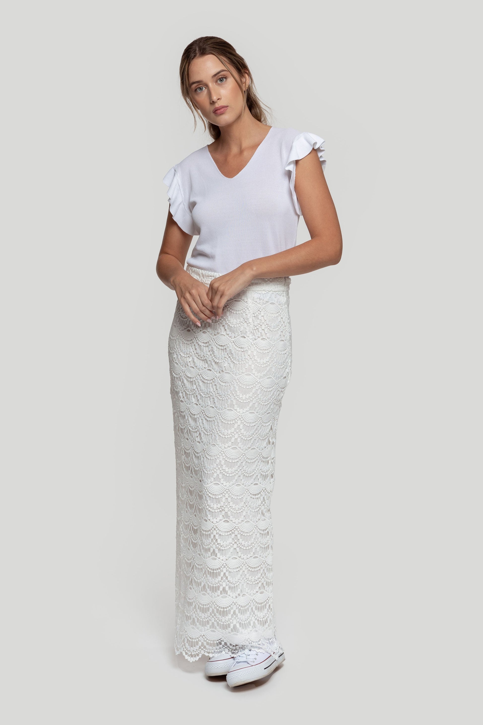 Falda larga. Tejido de punto. Tejido de crochet. Diseño recto. Cierre de cremallera lateral. Forrada. Talla modelo: S. Altura modelo 1,66 m