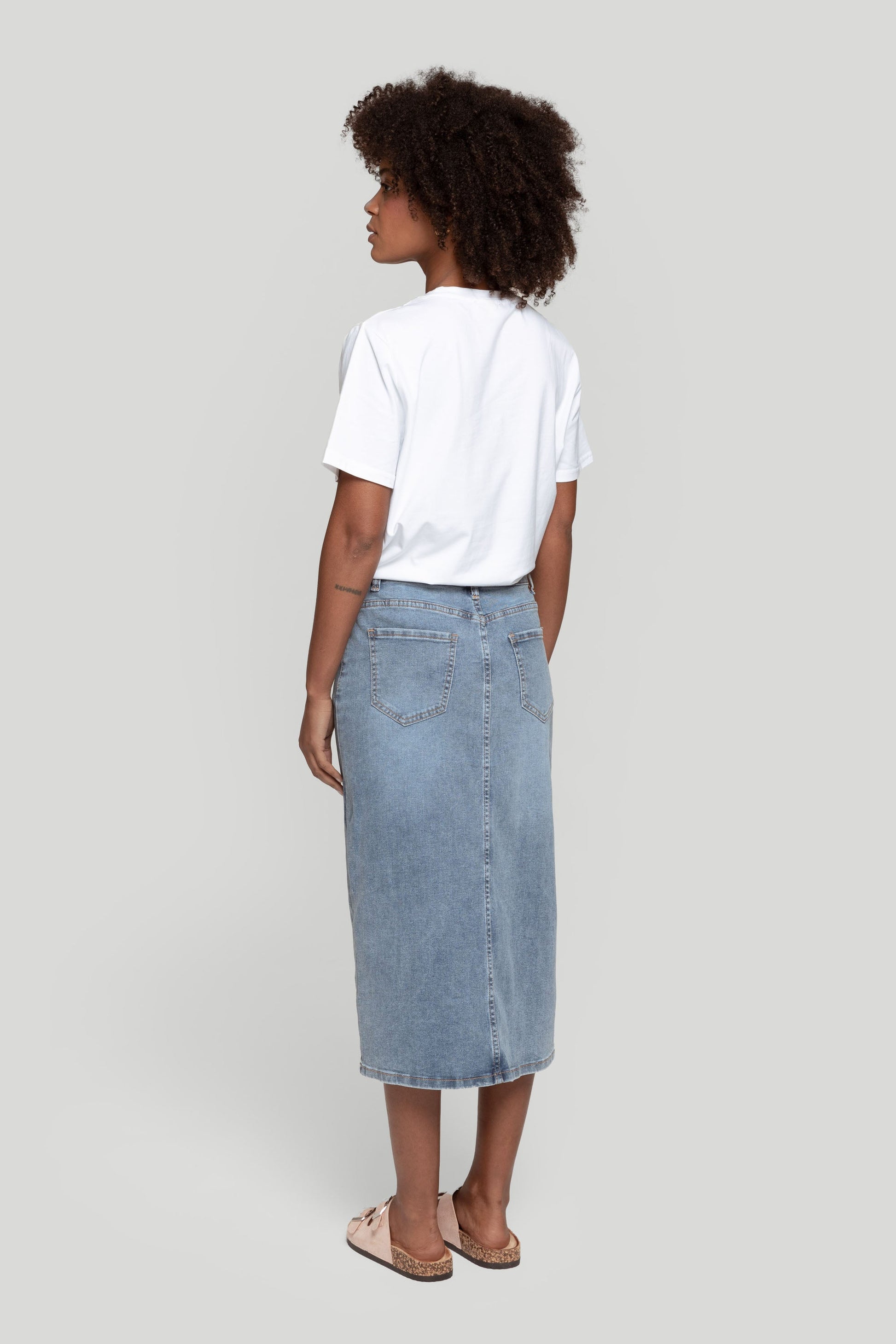 Tejido mezcla de algodón. Estilo tejano vaquero. Diseño midi. Diseño recto. Tiro alto. Cuatro bolsillos. Cierre de cremallera y botón. Trabillas. Bajo con abertura frontal. Talla modelo: 36. Altura modelo 1,75 m.