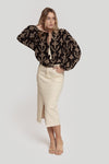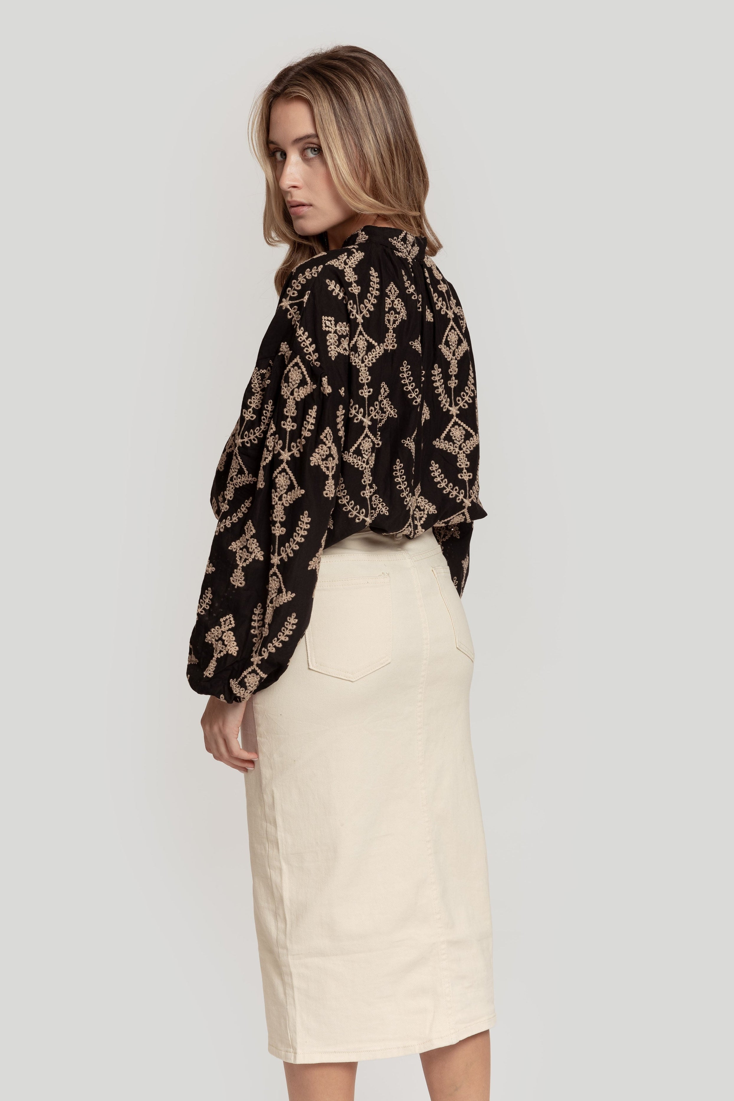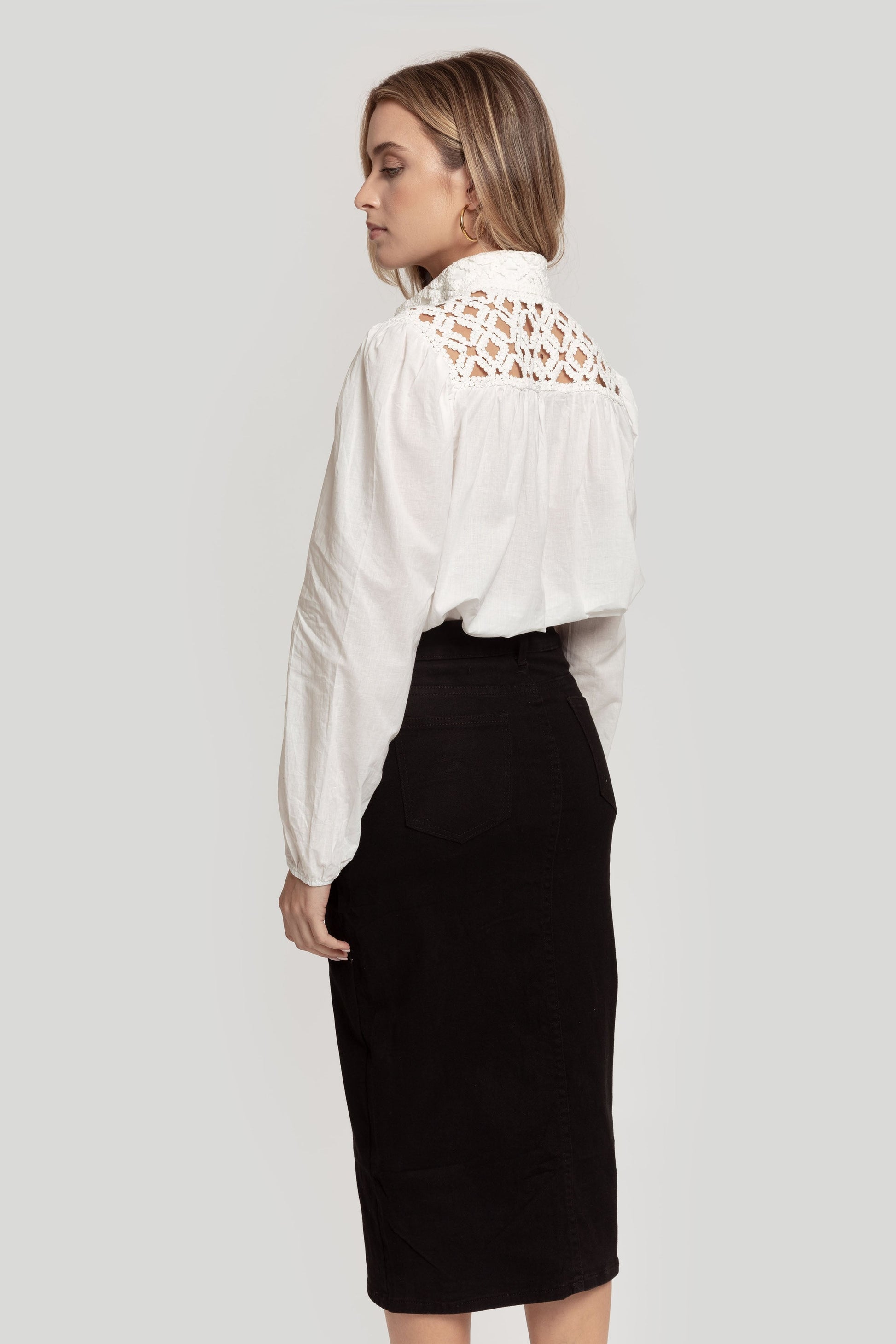 Tejido mezcla de algodón. Estilo tejano vaquero. Diseño recto. Diseño midi. Tiro medio. Cinco bolsillos. Trabillas. Cierre de cremallera y botón. Abertura posterior en el bajo. Talla modelo: S. Altura modelo 1,66 m.