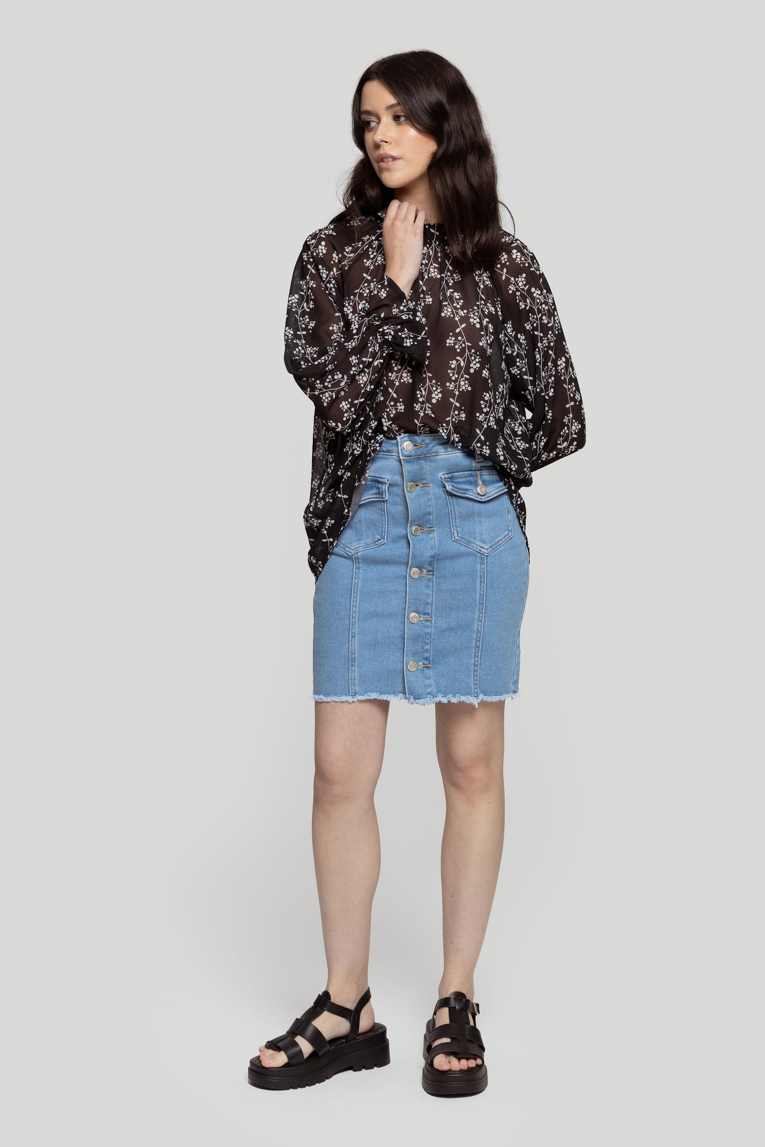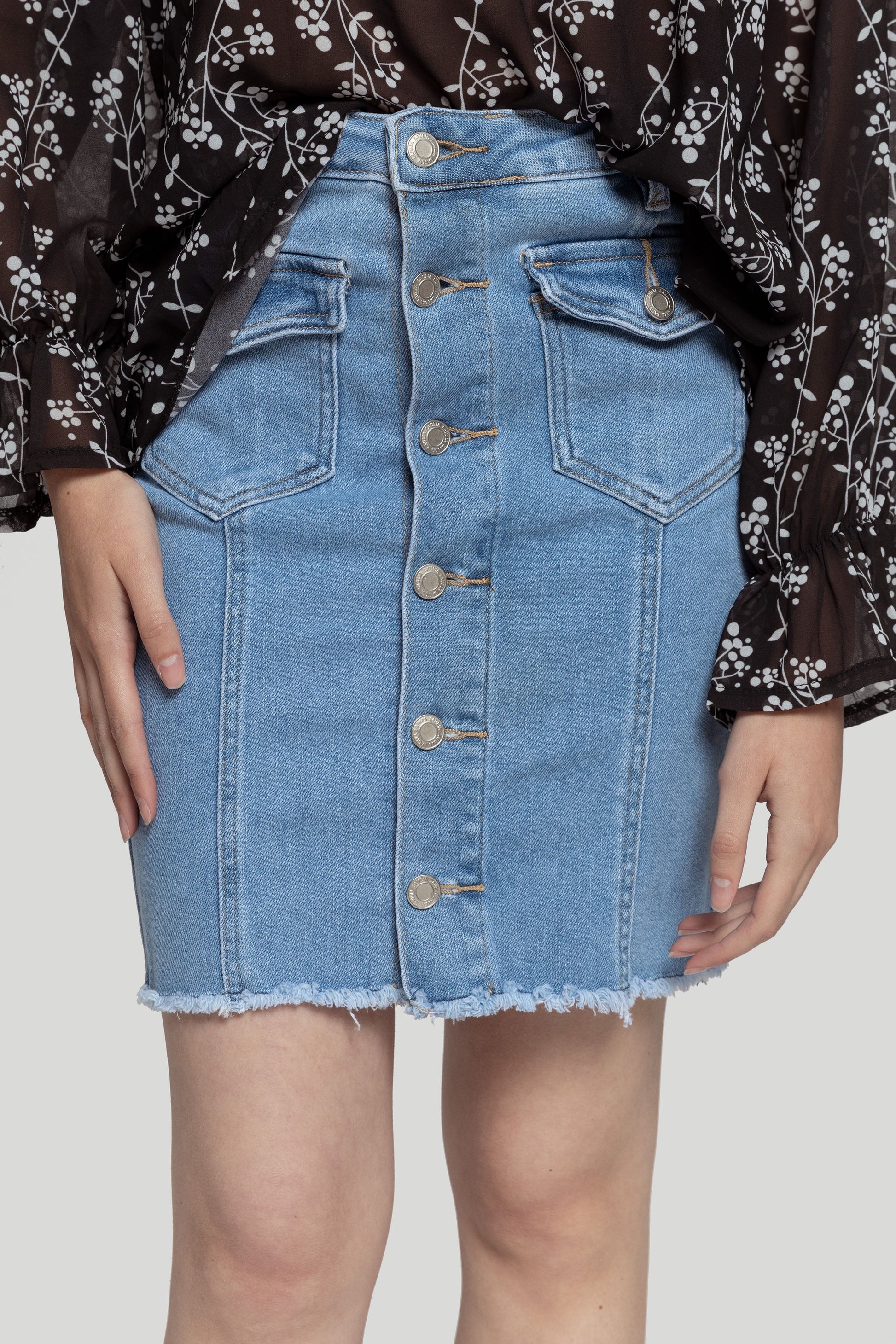 Falda corta. Tejido de algodón estilo tejano vaquero. Tejido mezcla de algodón. Diseño de botones. Diseño recto. Trabillas. Dos bolsillos con tapeta. Cierre de botón. Bajo deshilachado. Talla modelo: 34. Altura modelo: 1,67 m.