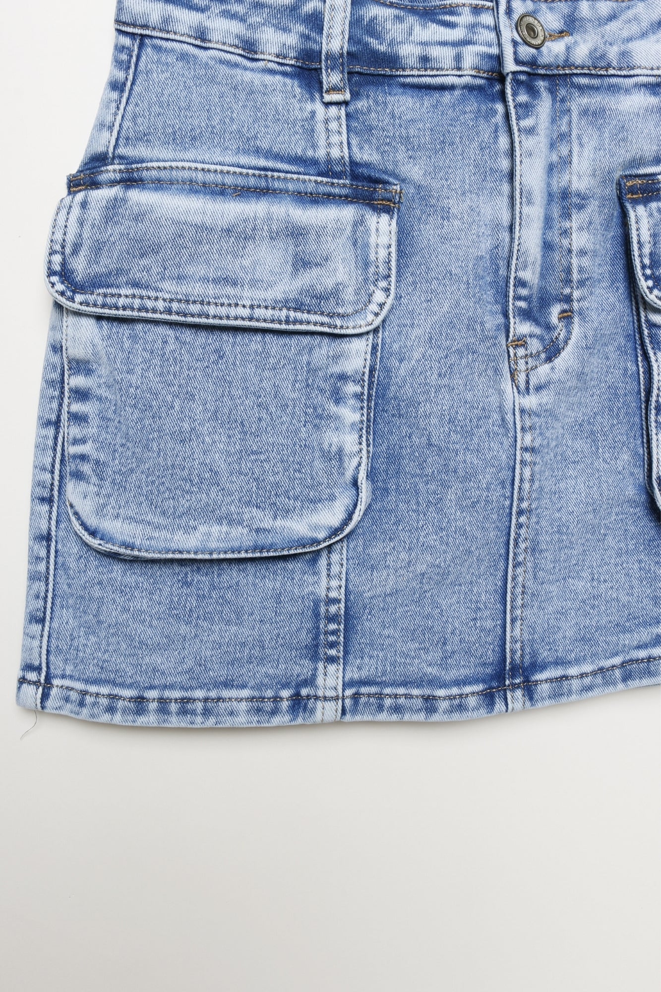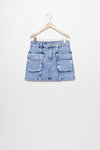Tejido mezcla de algodón. Tejido tejano vaquero. Tiro medio. Diseño corto. Dos bolsillos cargo. Cierre de cremallera y botón. Trabillas. Talla modelo: 36.