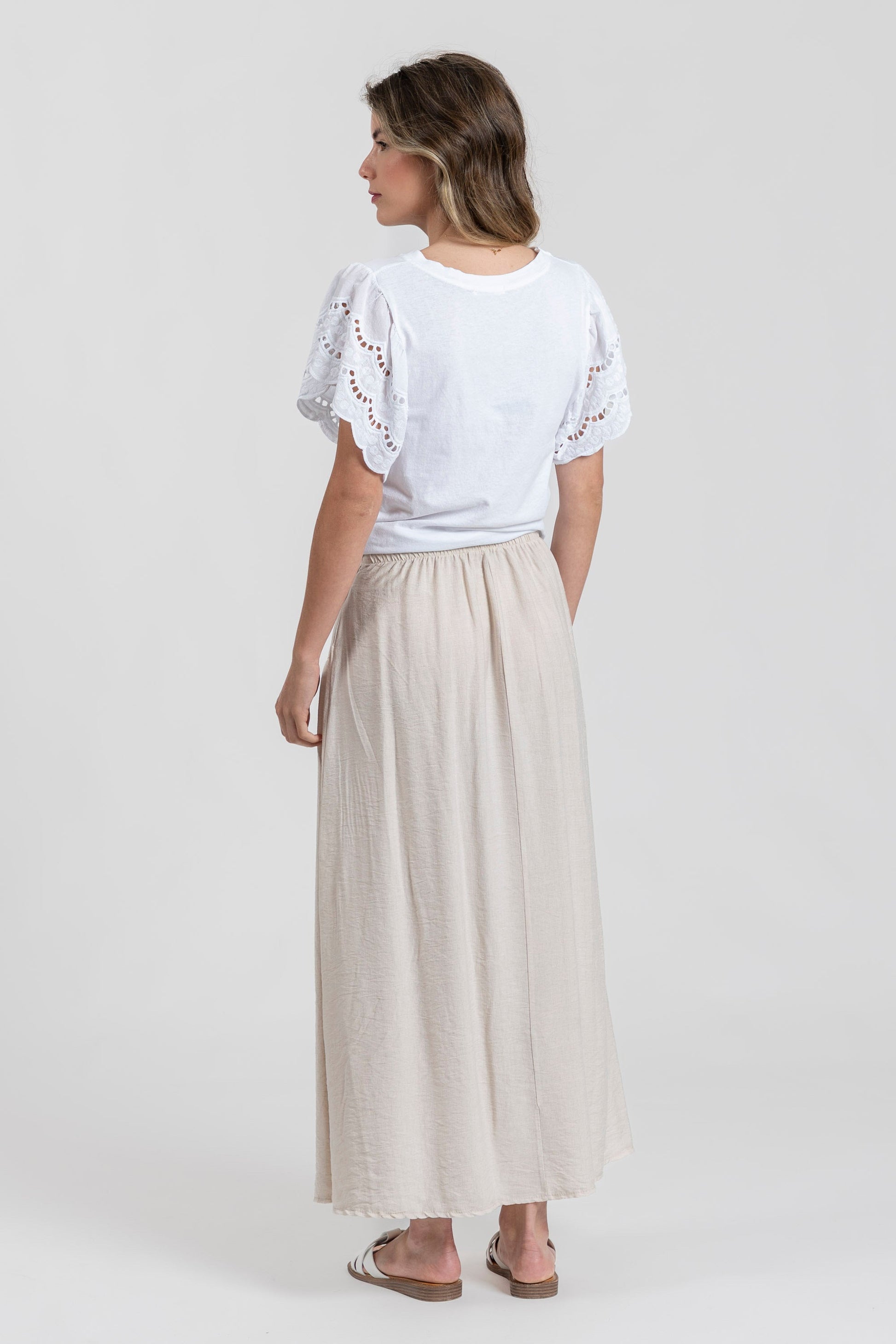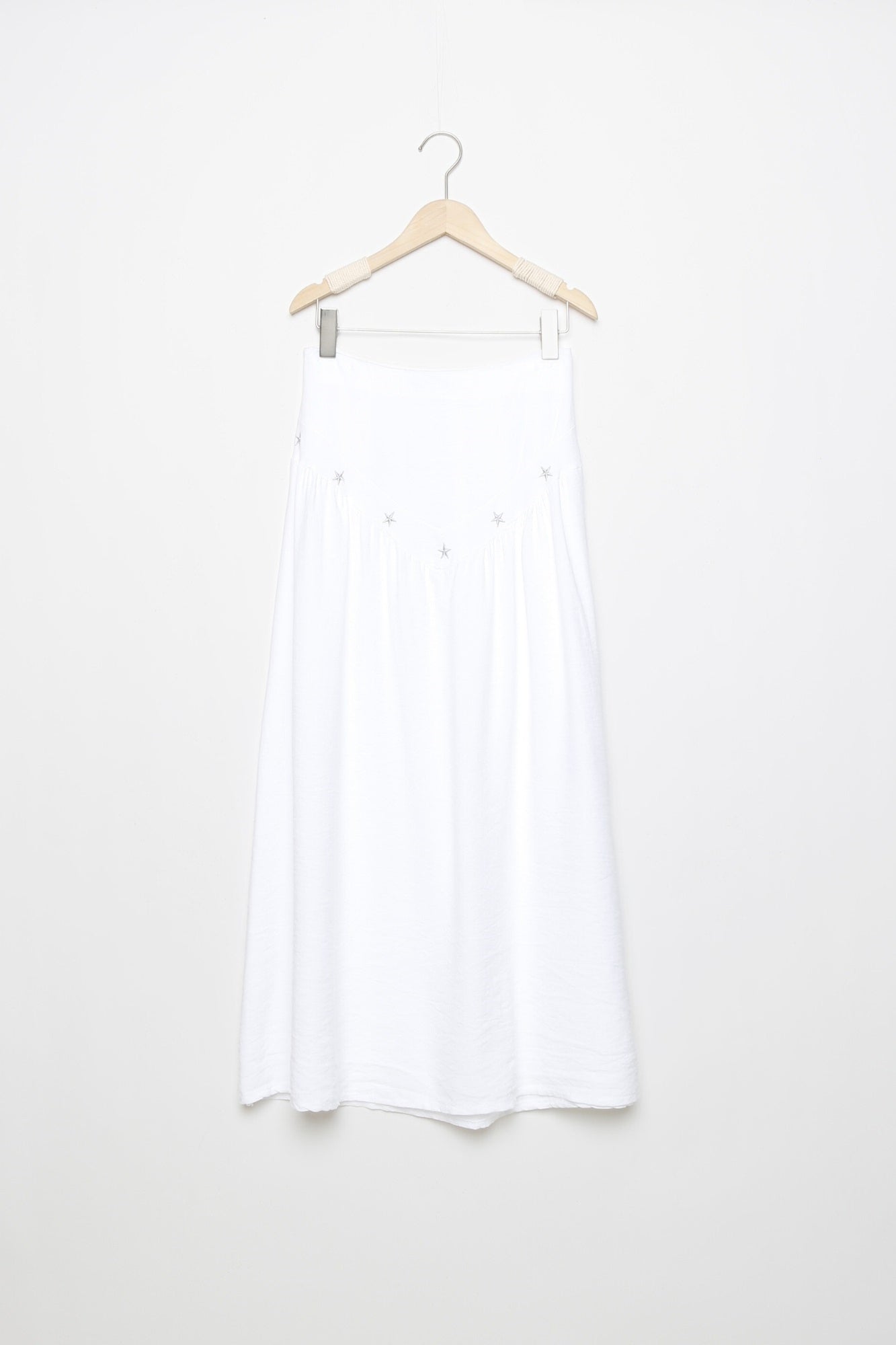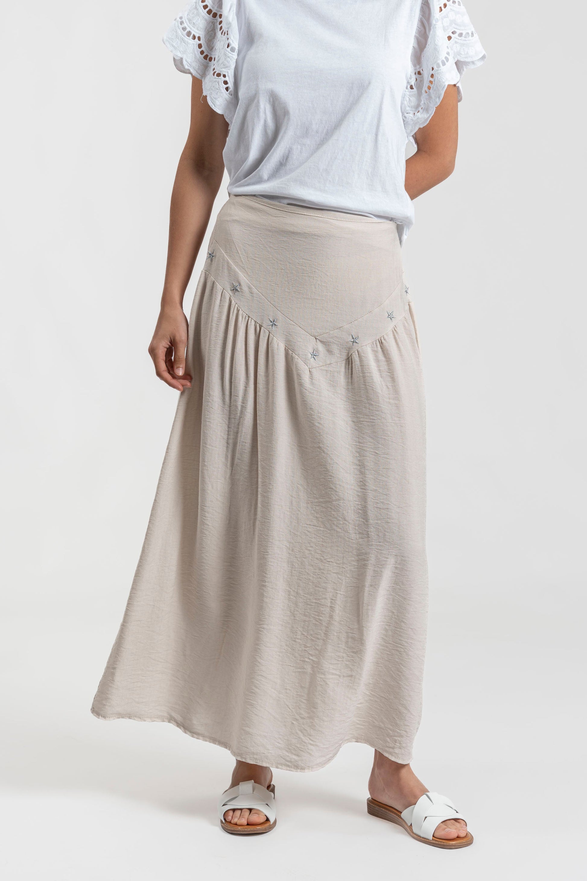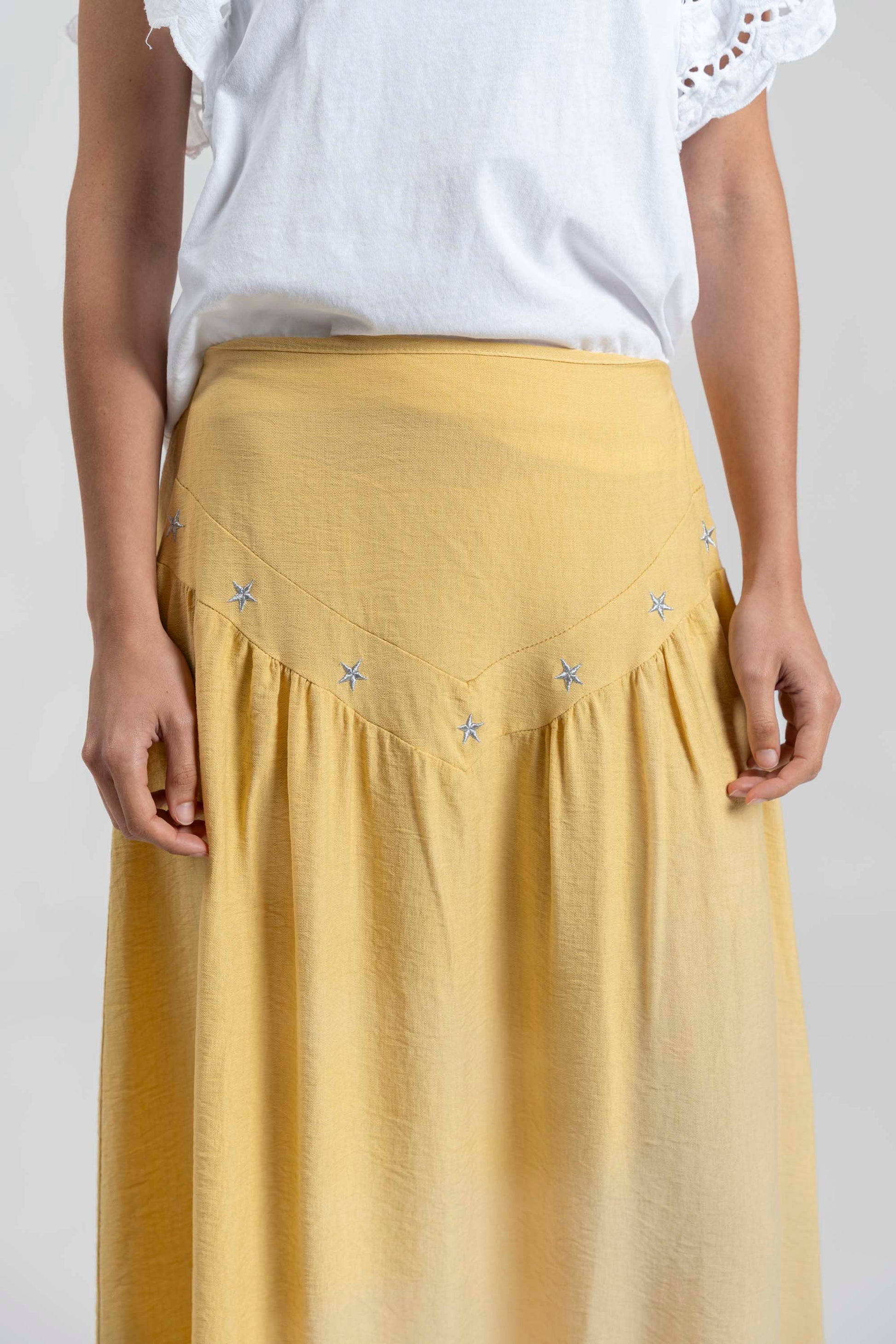 Tejido fluido. Diseño midi. Diseño vuelo. Diseño midi. Cintura elástica. Detalle bodados. Talla modelo: S.
