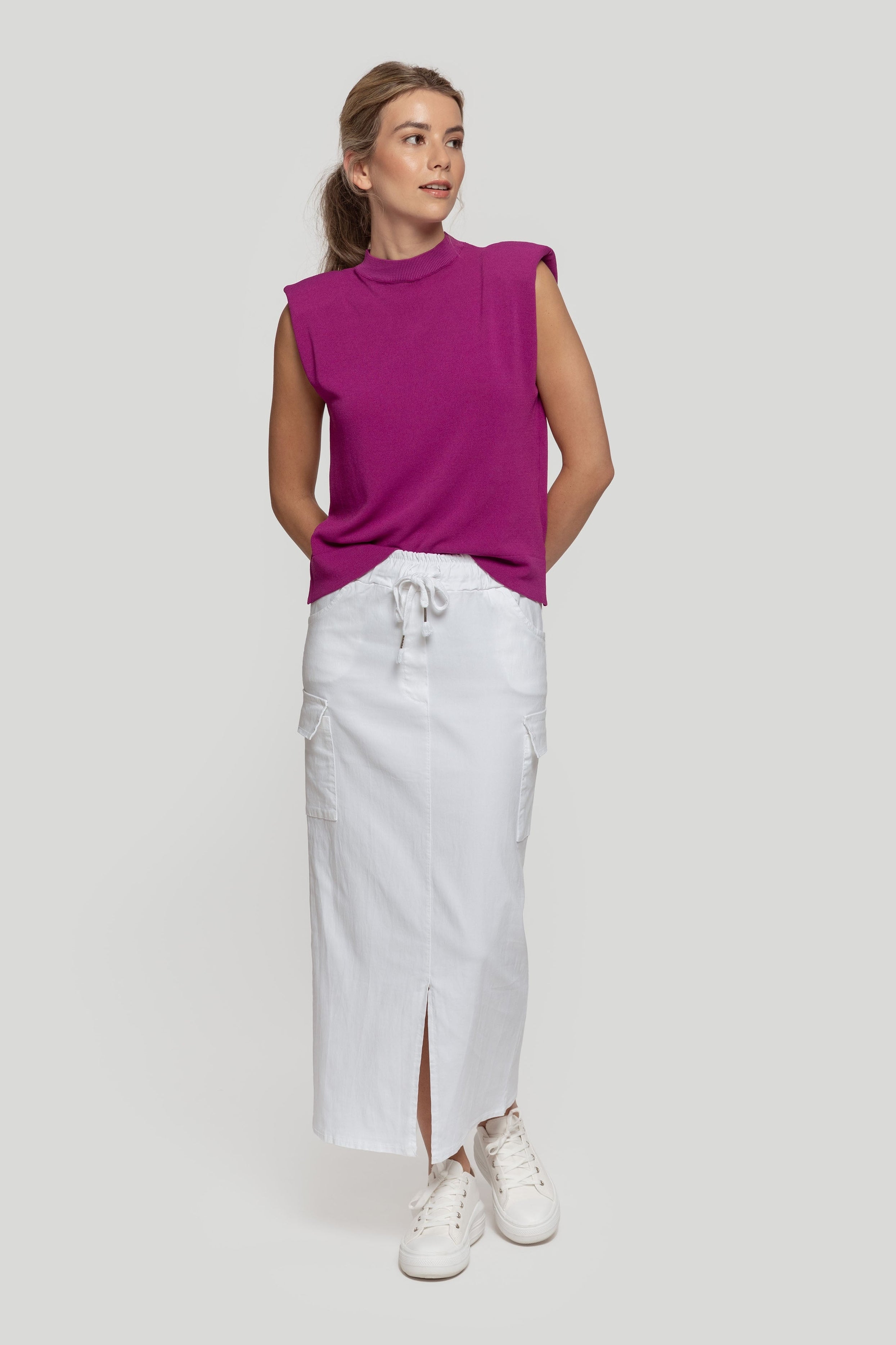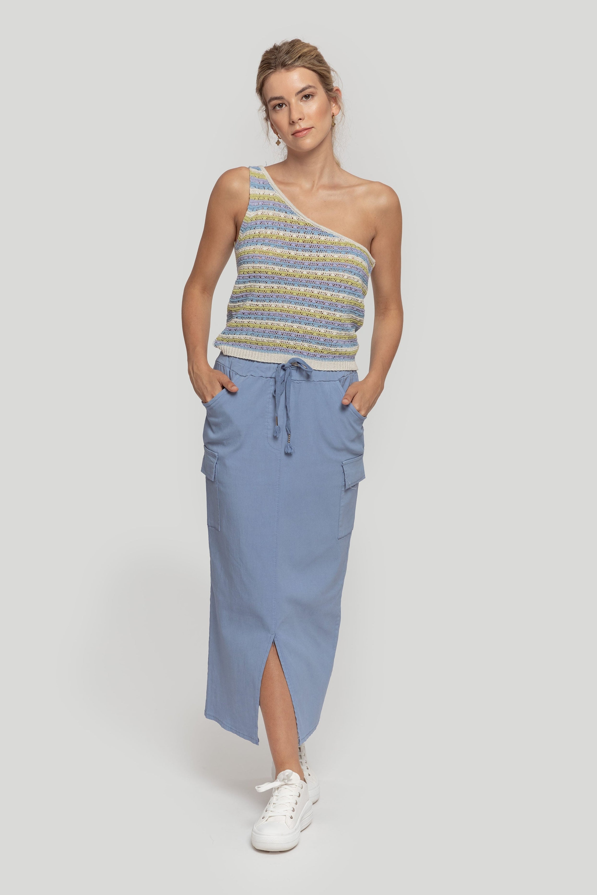 Falda cargo. Diseño básico. Diseño recto. Diseño midi. Tiro medio. Cuatro bolsillos. Cintura elástica. Corsdón ajustable. Cierre de cremallera y botón. Abertura posterior en el bajo. Talla modelo: S. Altura modelo 1,70 m.