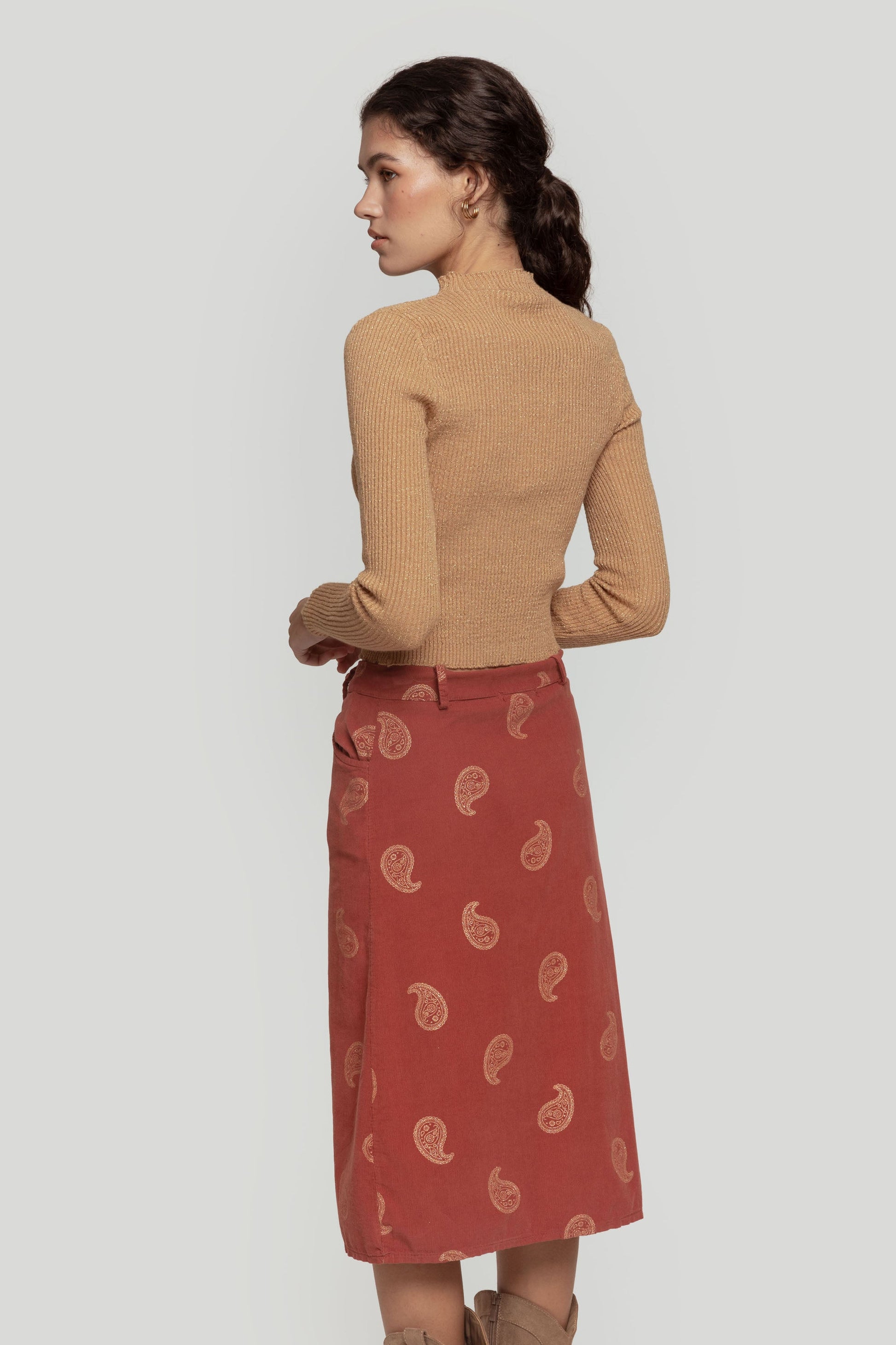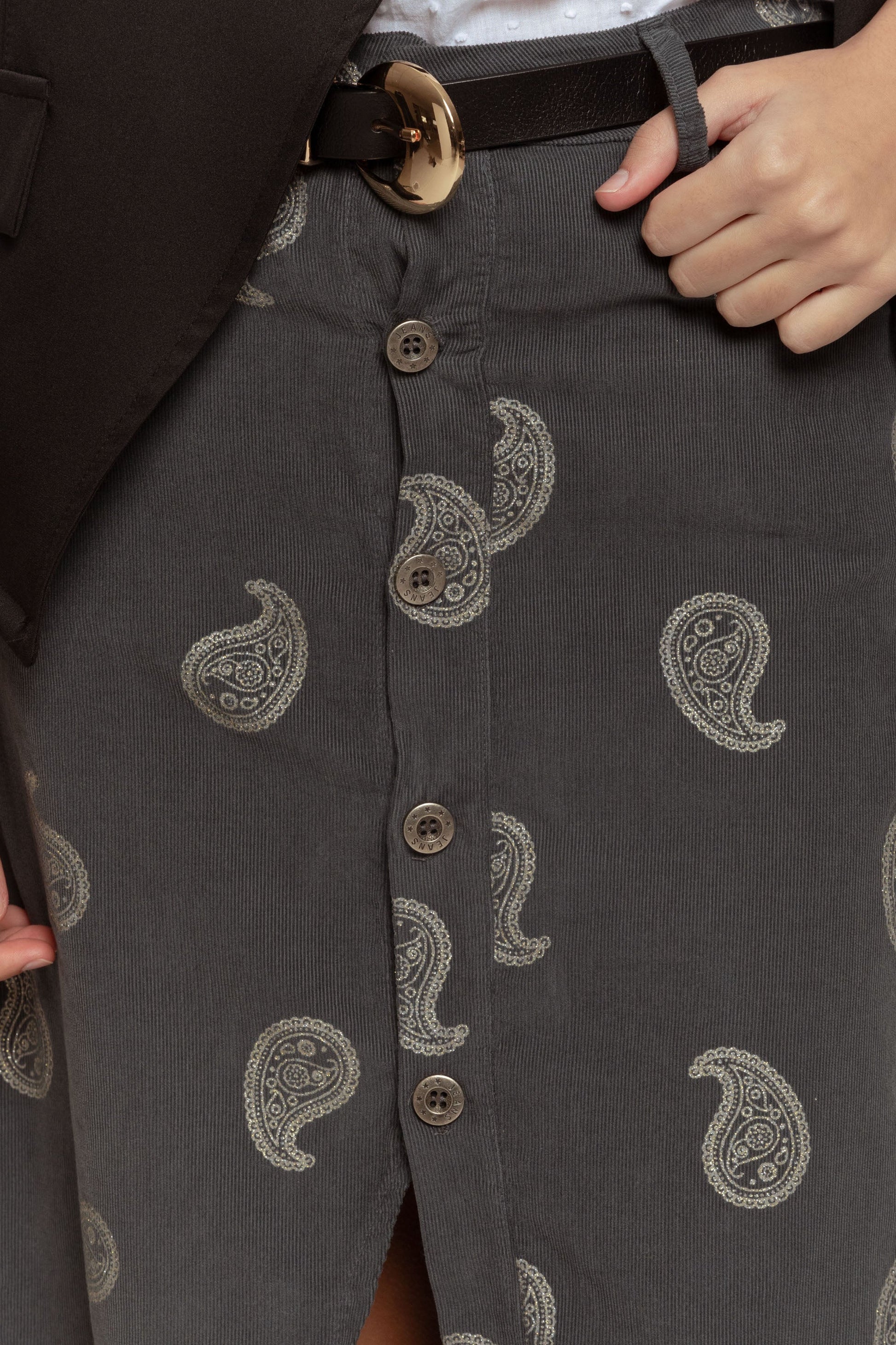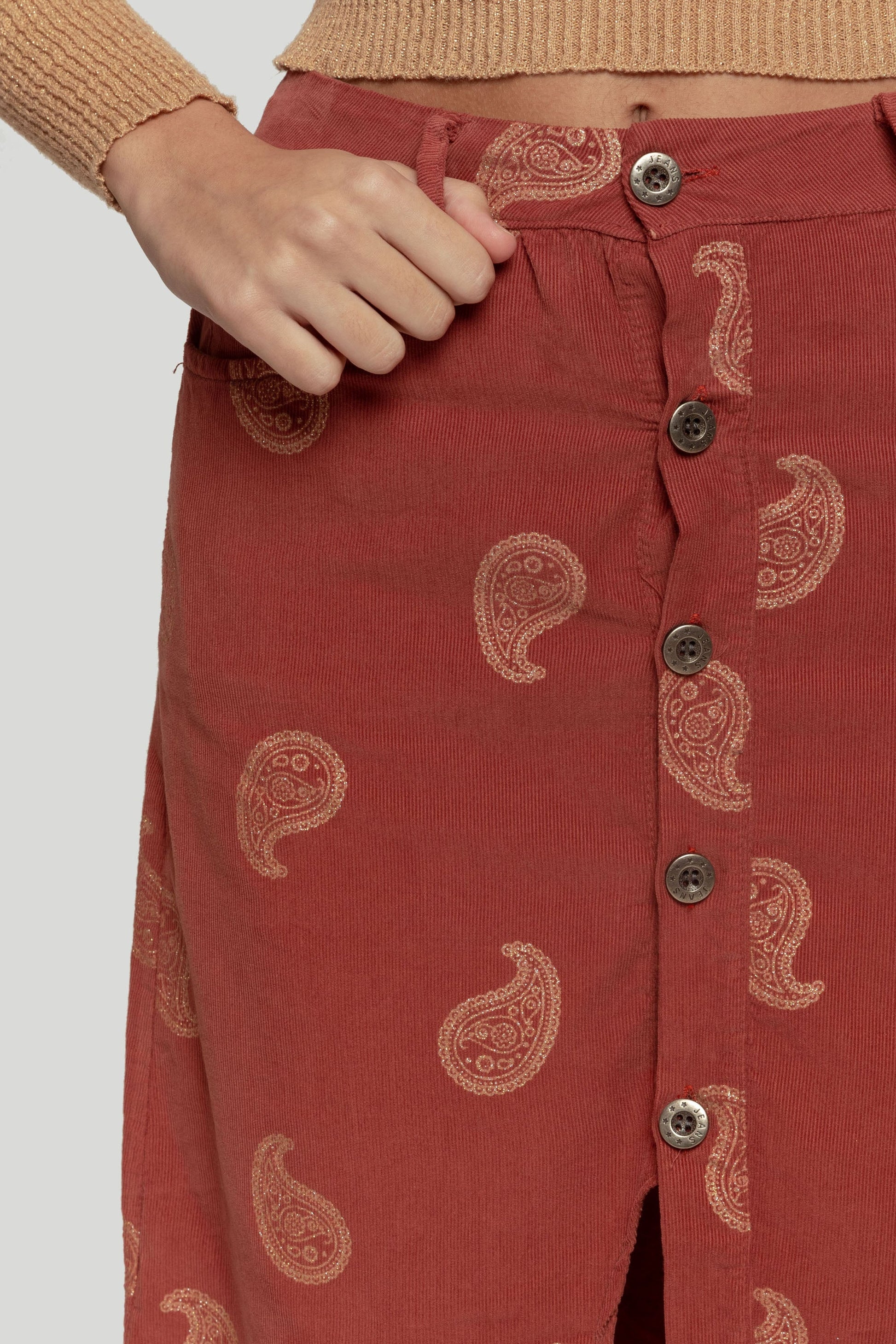 Tejido de pana. Diseño estampado. Diseño midi. Diseño recto. Tiro medio. Cierre de cremallera. Bolsillos laterales. Con trabillas. Abertura frontal. Talla modelo: S. Altura modelo 1,75 m.