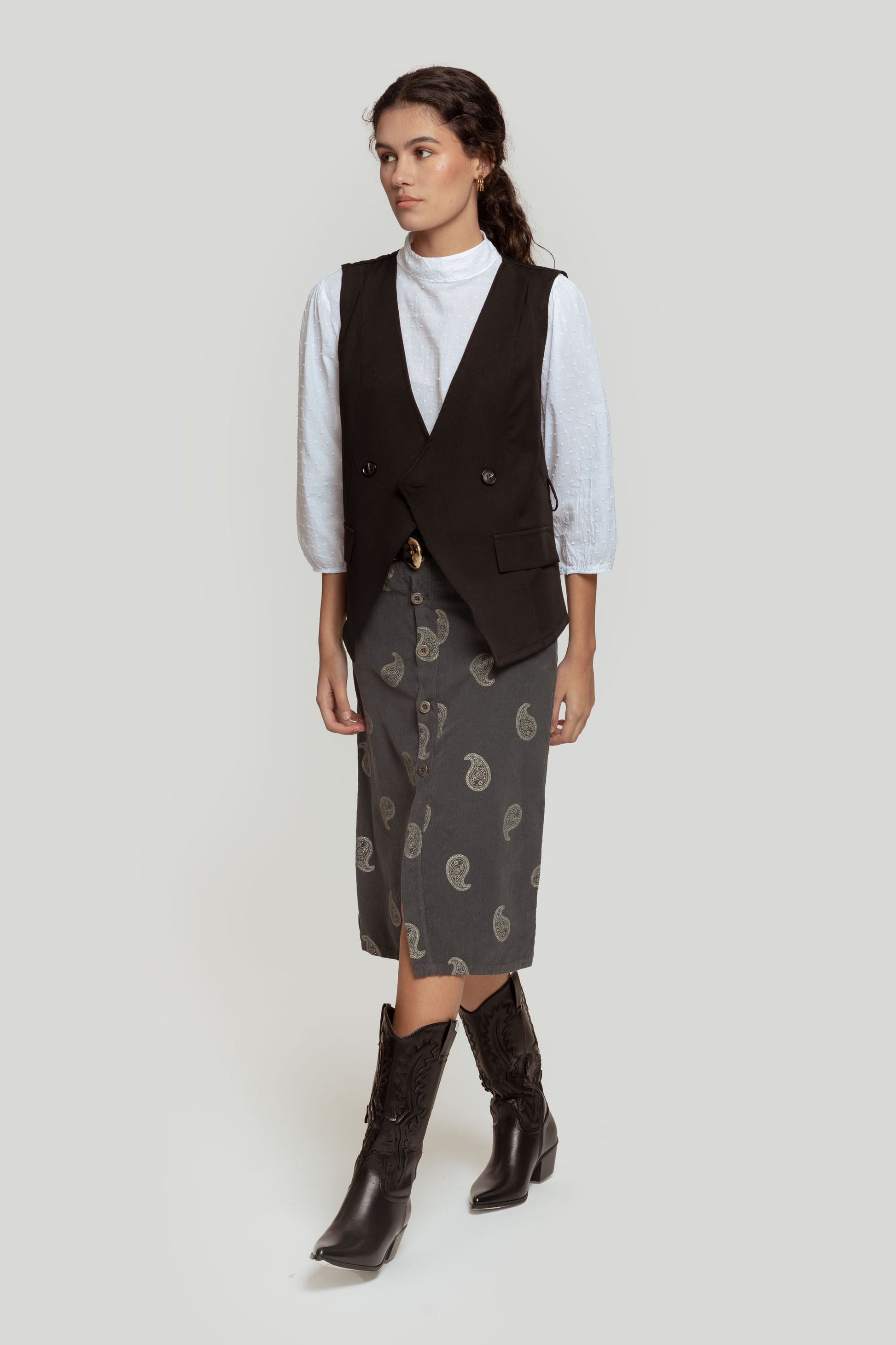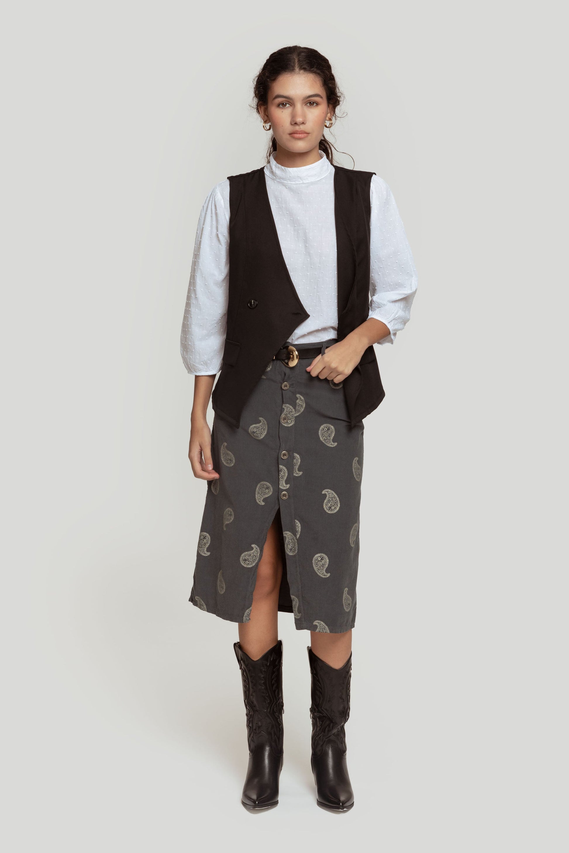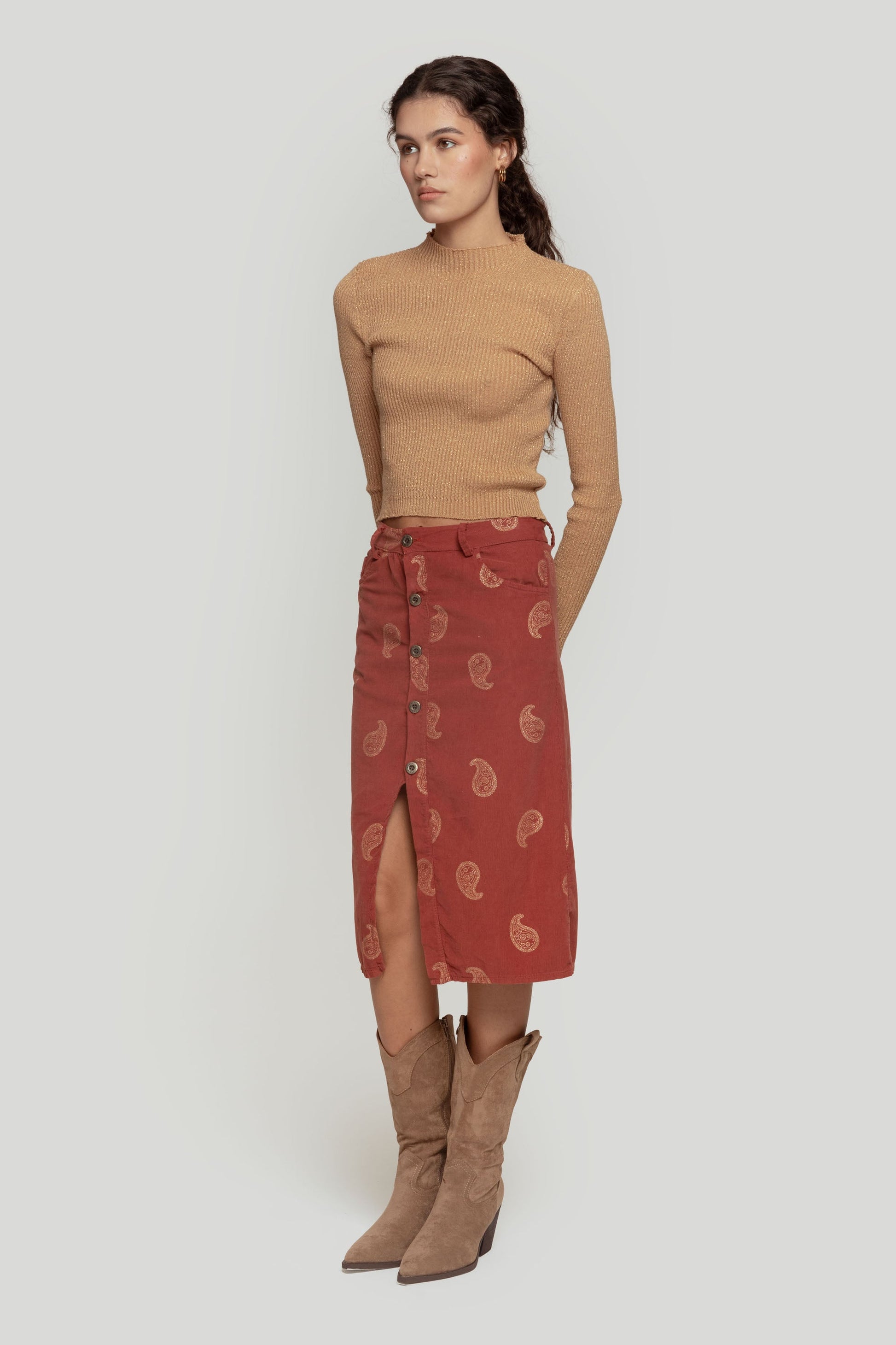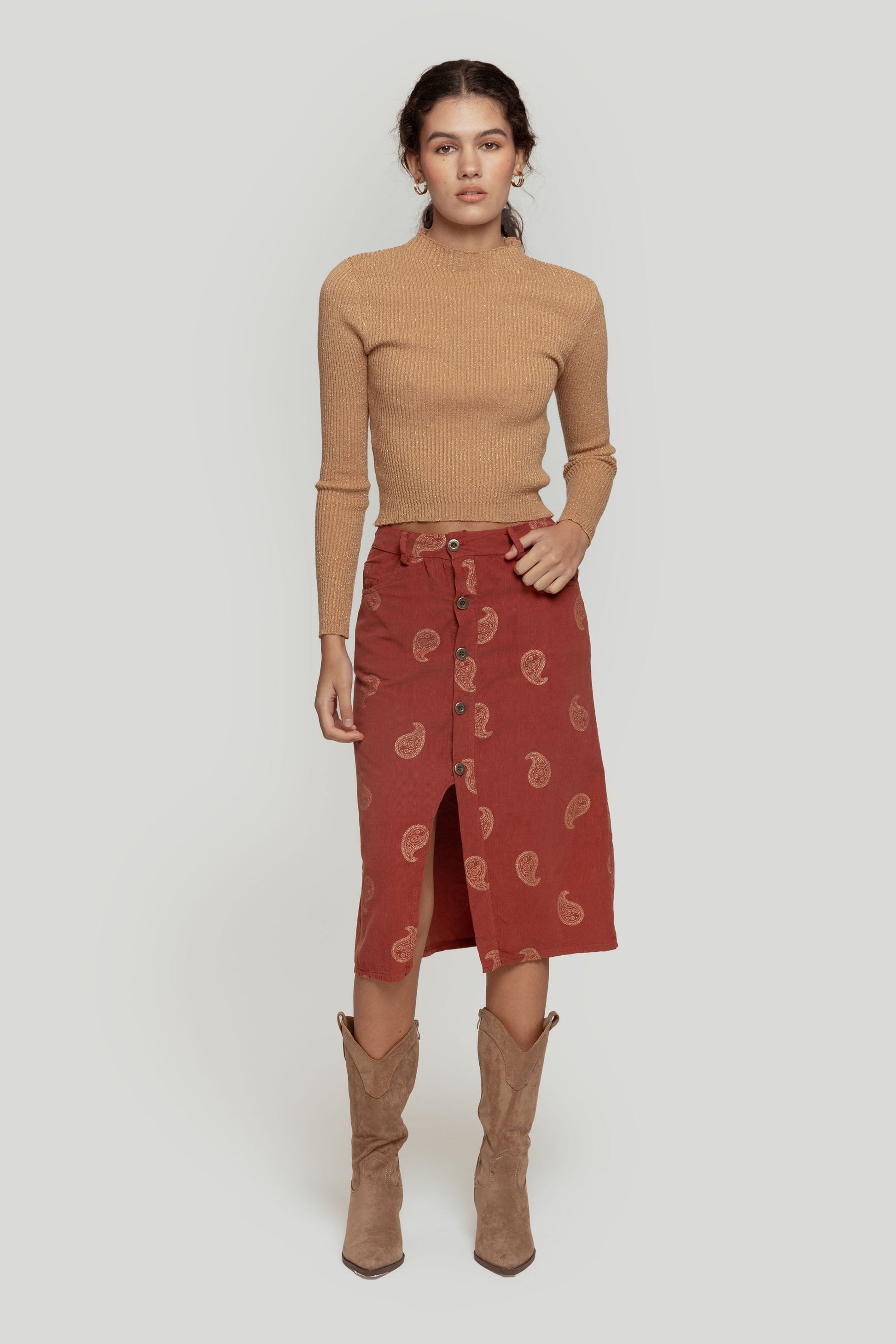 Tejido de pana. Diseño estampado. Diseño midi. Diseño recto. Tiro medio. Cierre de cremallera. Bolsillos laterales. Con trabillas. Abertura frontal. Talla modelo: S. Altura modelo 1,75 m.