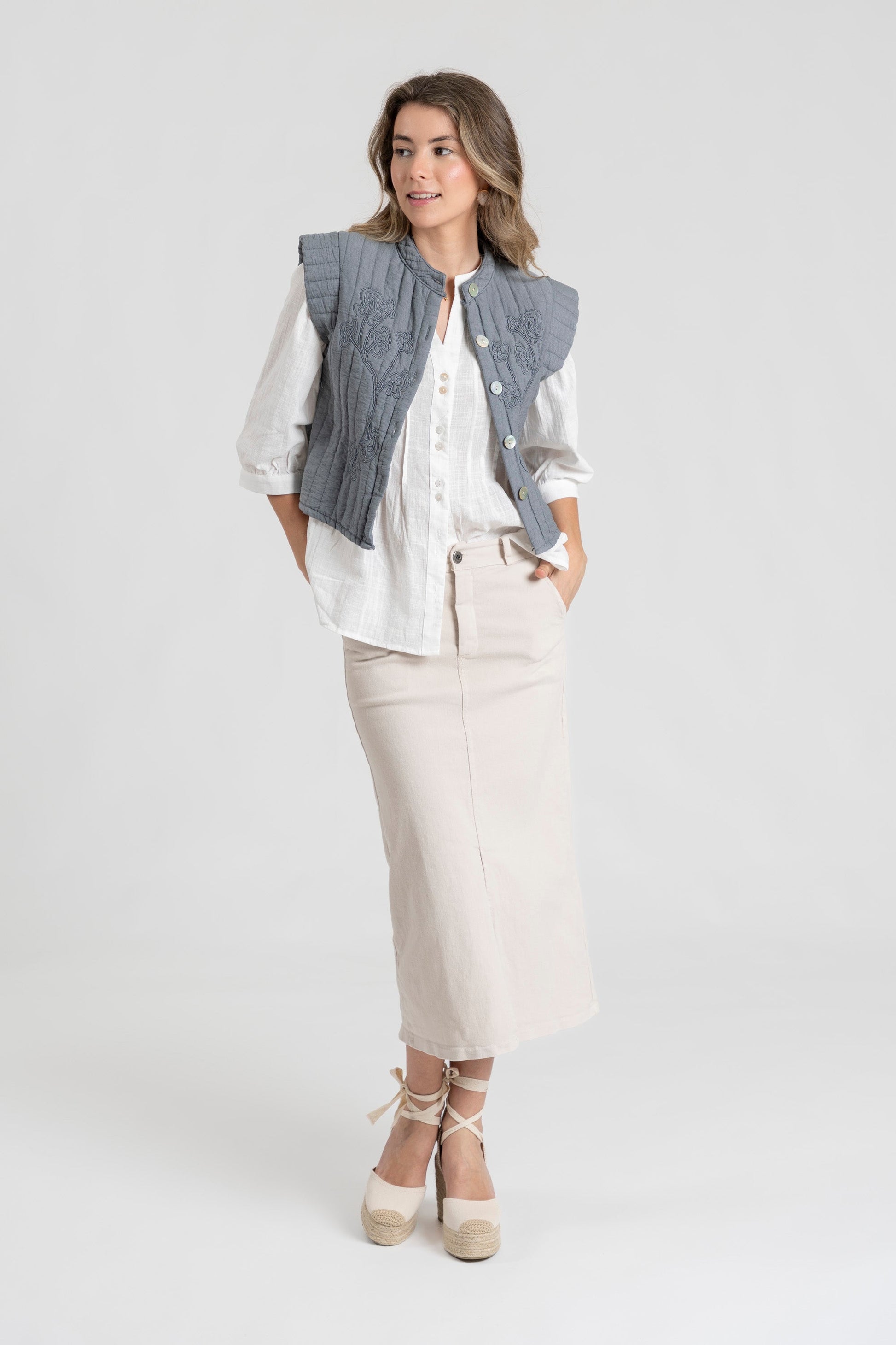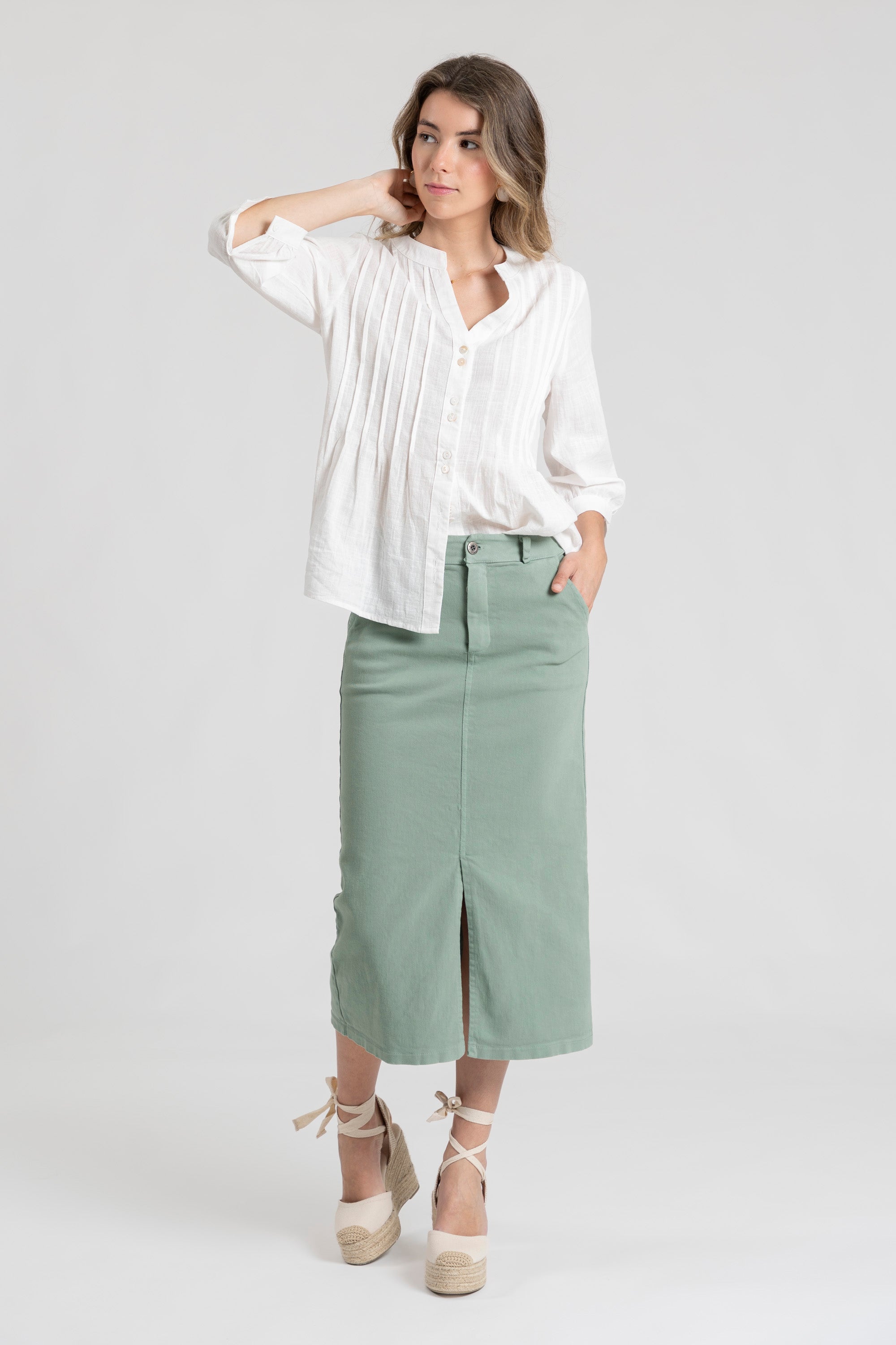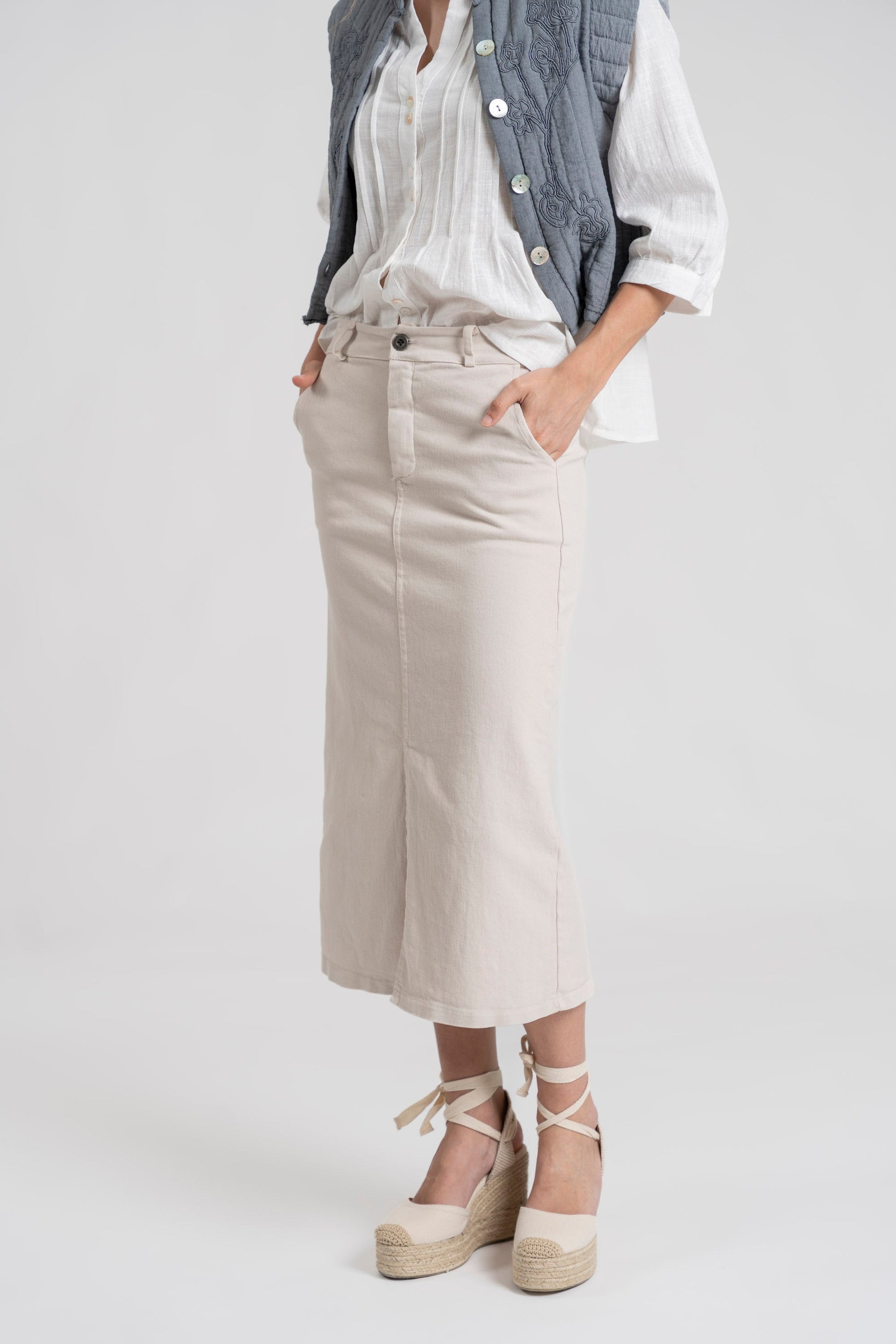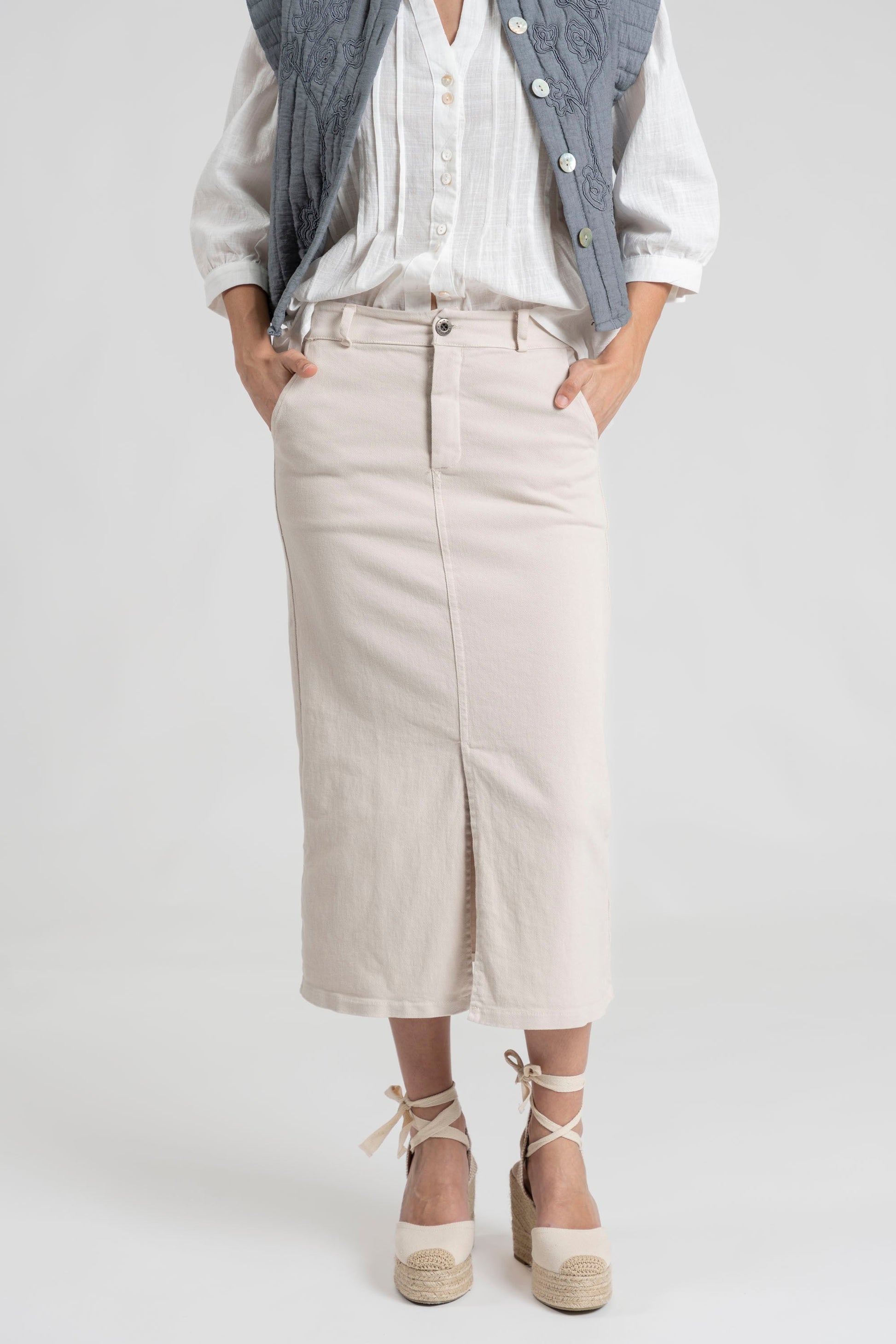 Tejido mezcla de algodón. Estilo tejano vaquero. Diseño midi. Diseño recto. Tiro alto. Cuatro bolsillos. Cierre de cremallera y botón. Trabillas. Bajo con abertura frontal. Talla modelo: S.