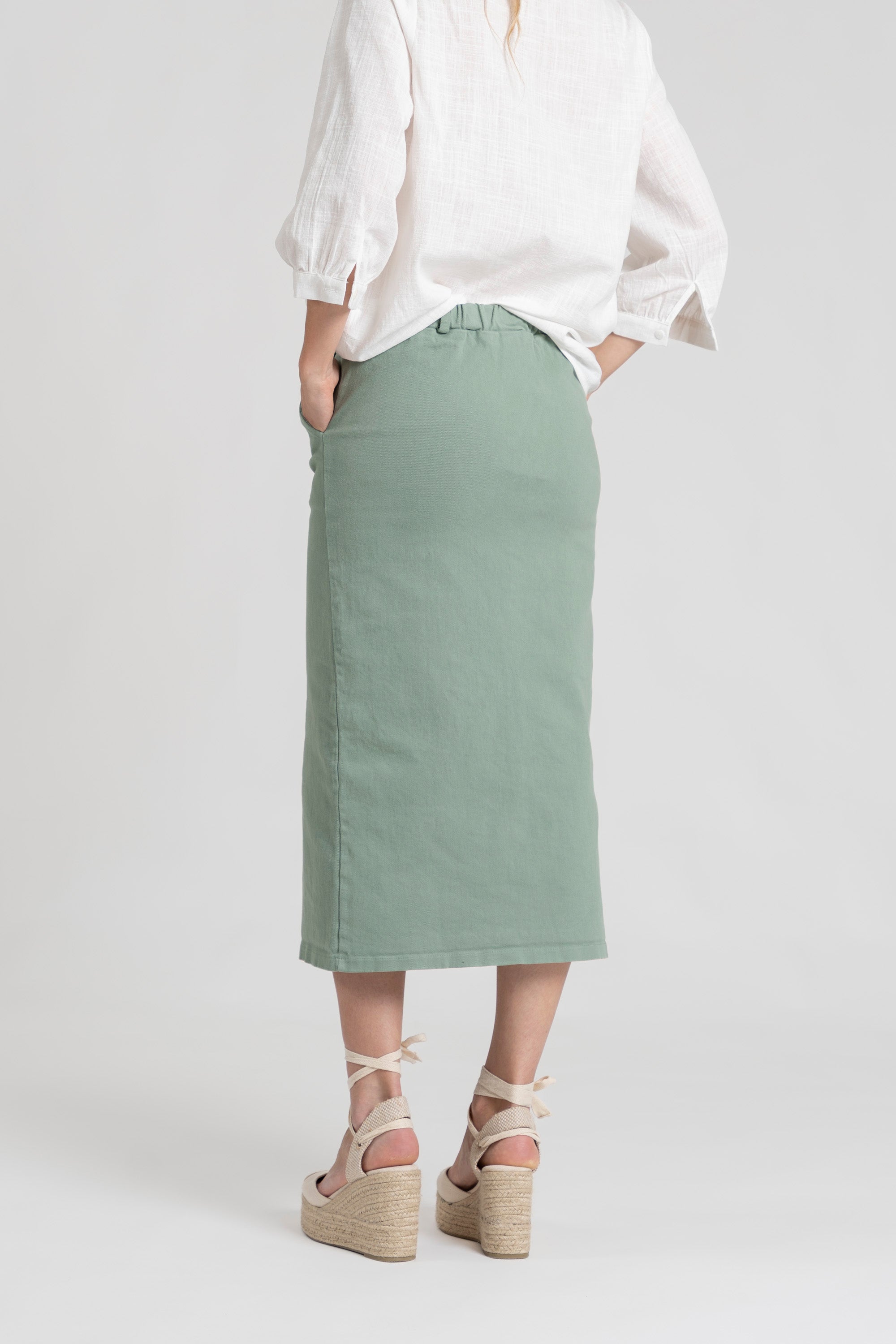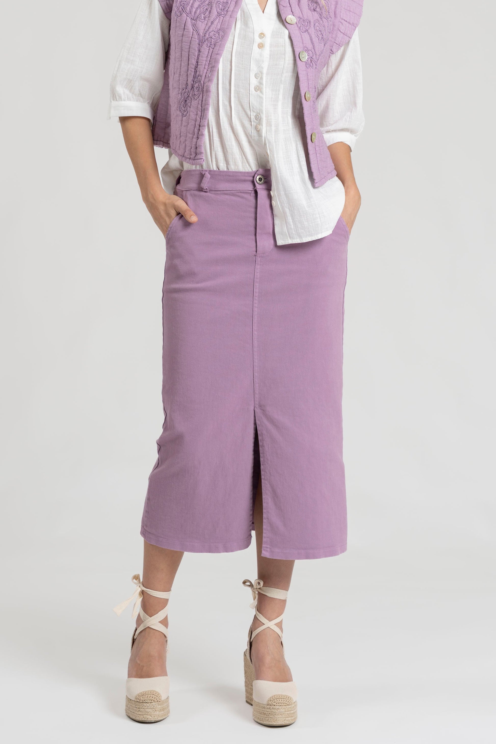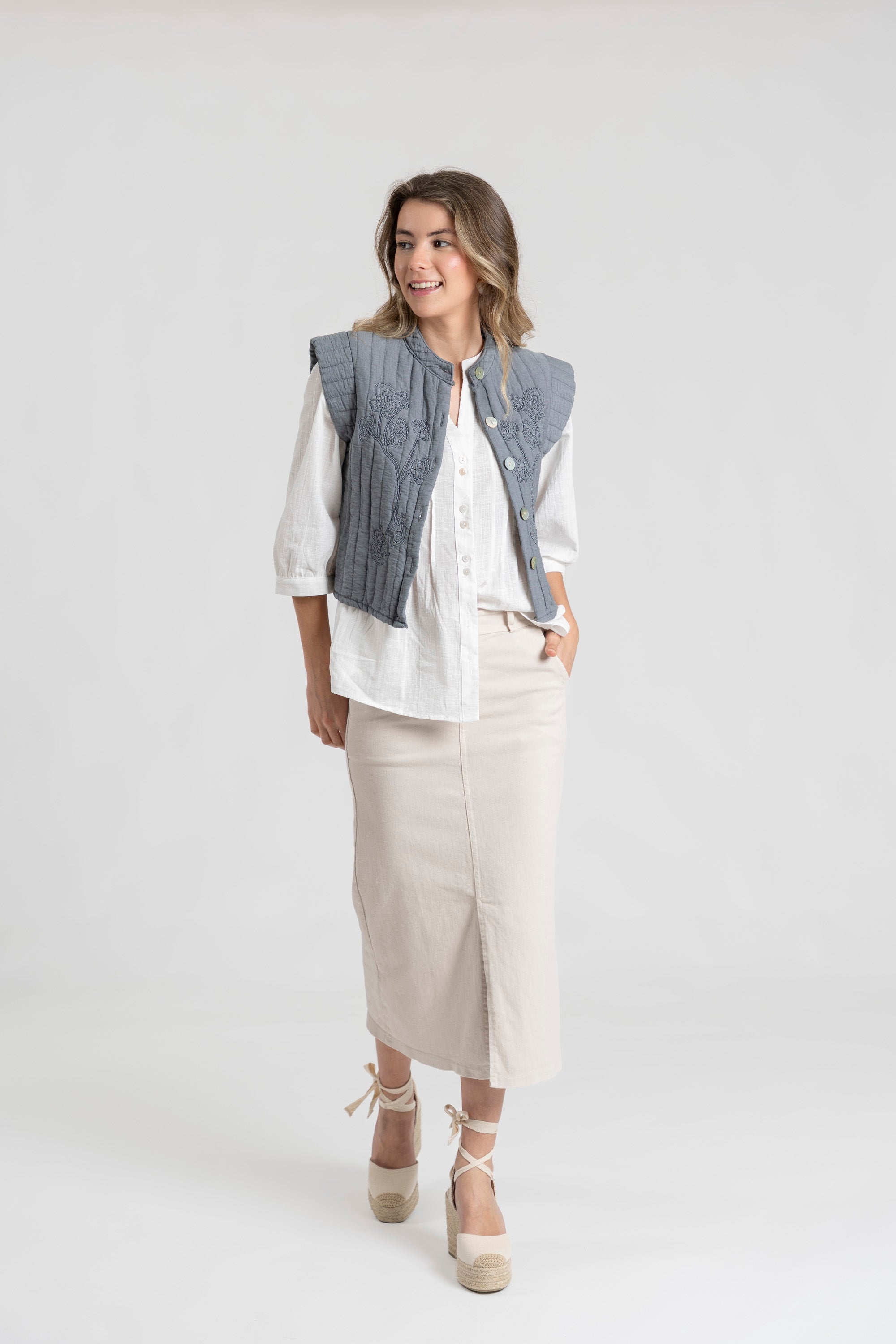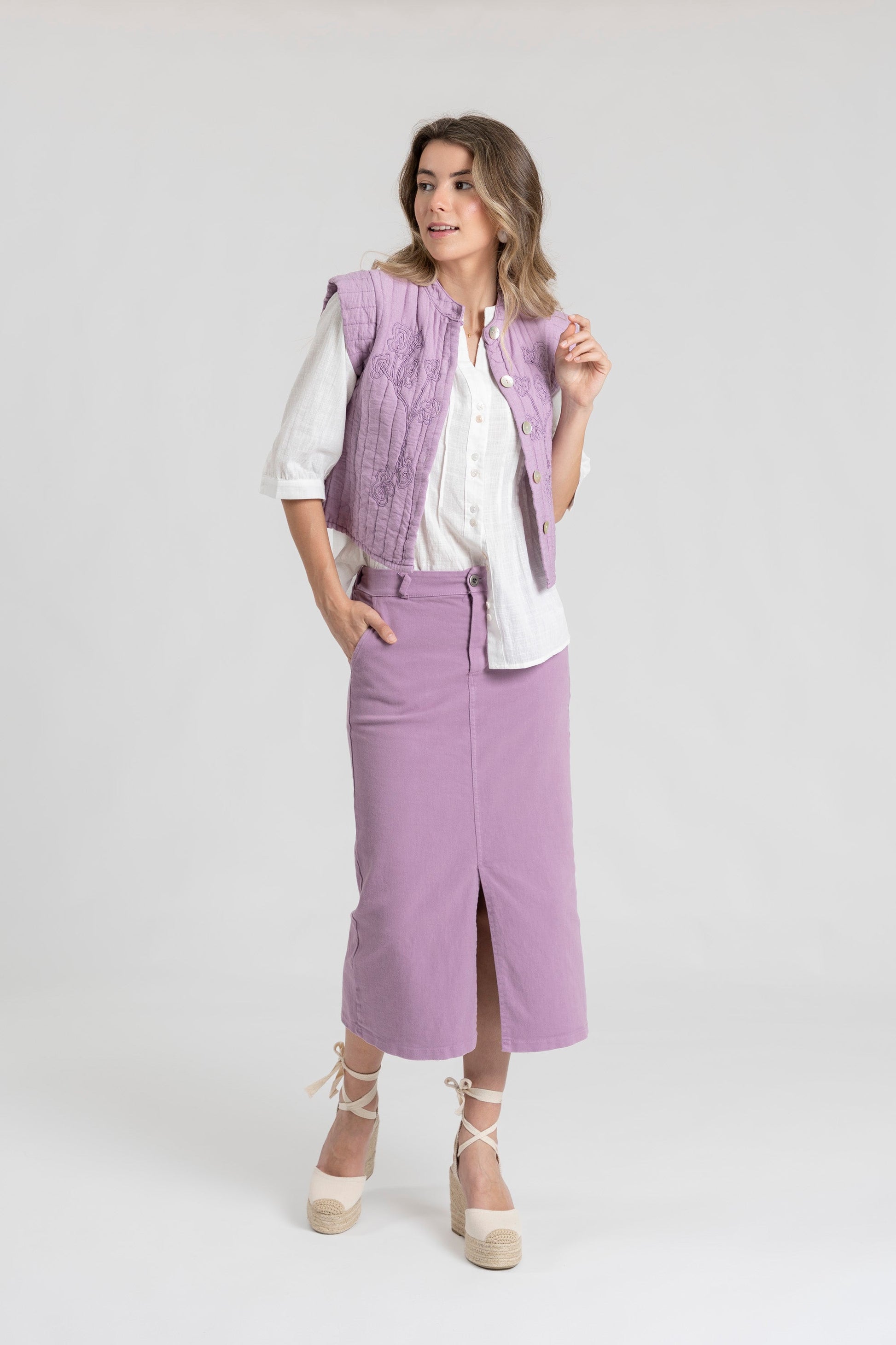 Tejido mezcla de algodón. Estilo tejano vaquero. Diseño midi. Diseño recto. Tiro alto. Cuatro bolsillos. Cierre de cremallera y botón. Trabillas. Bajo con abertura frontal. Talla modelo: S.