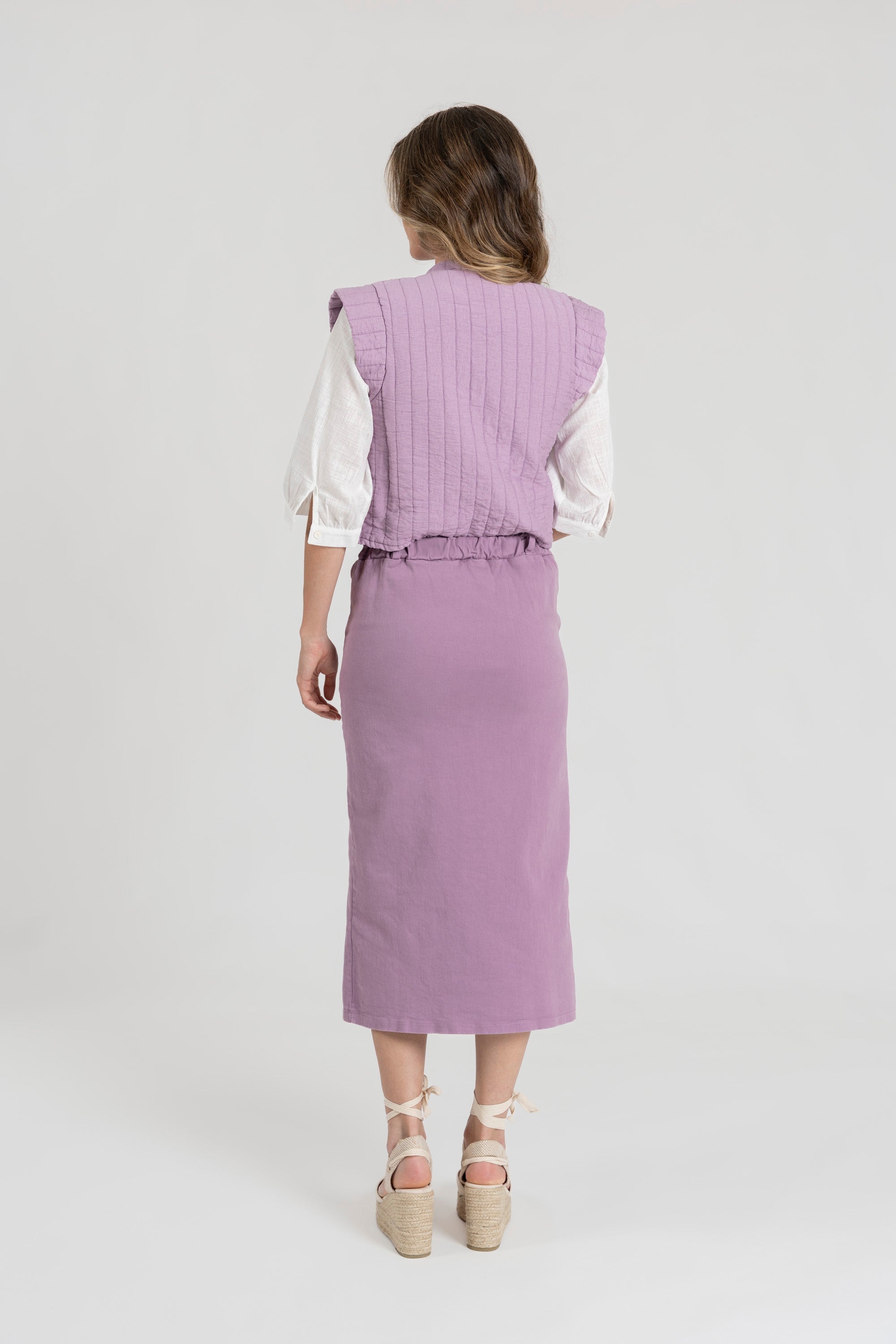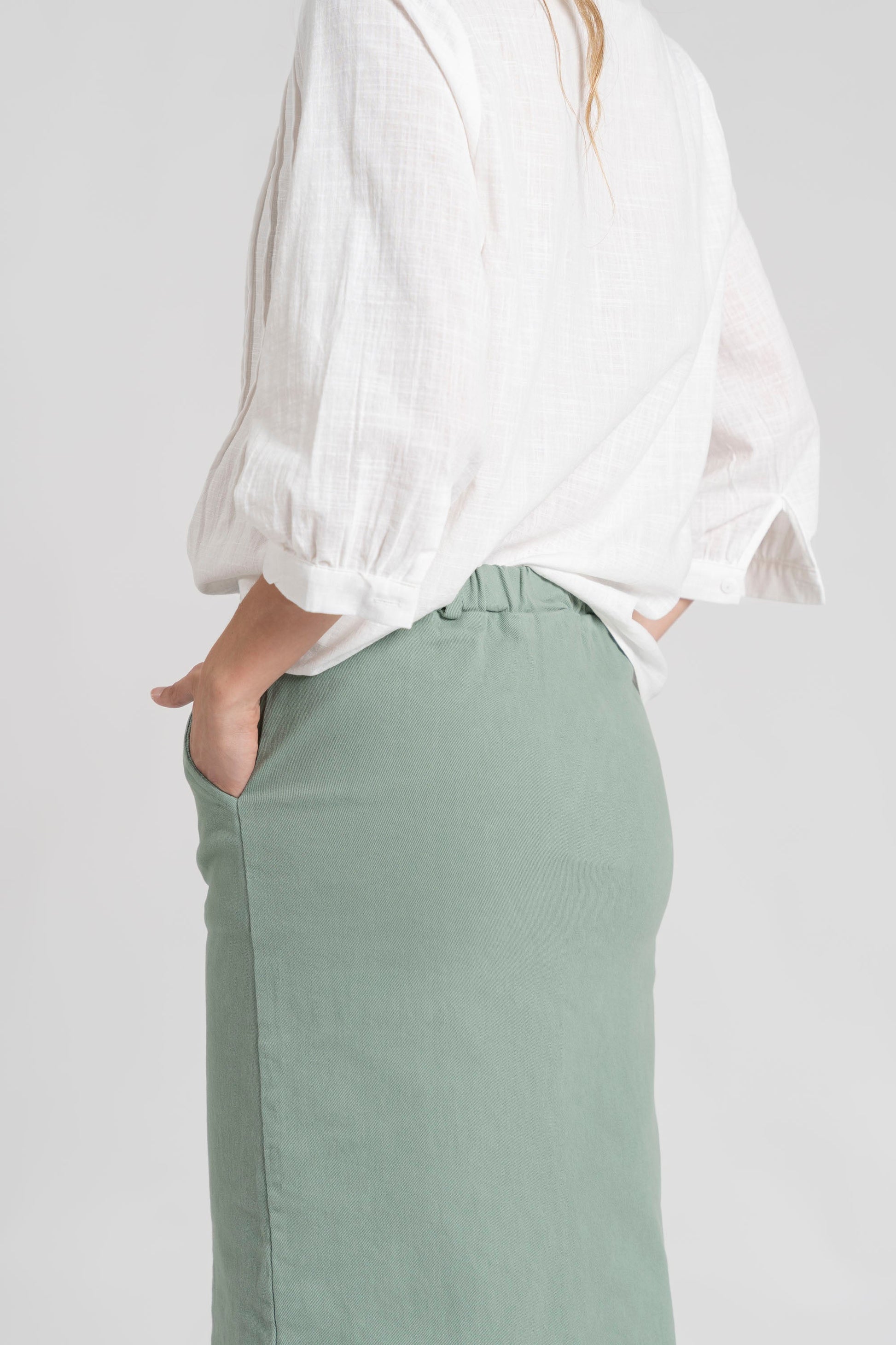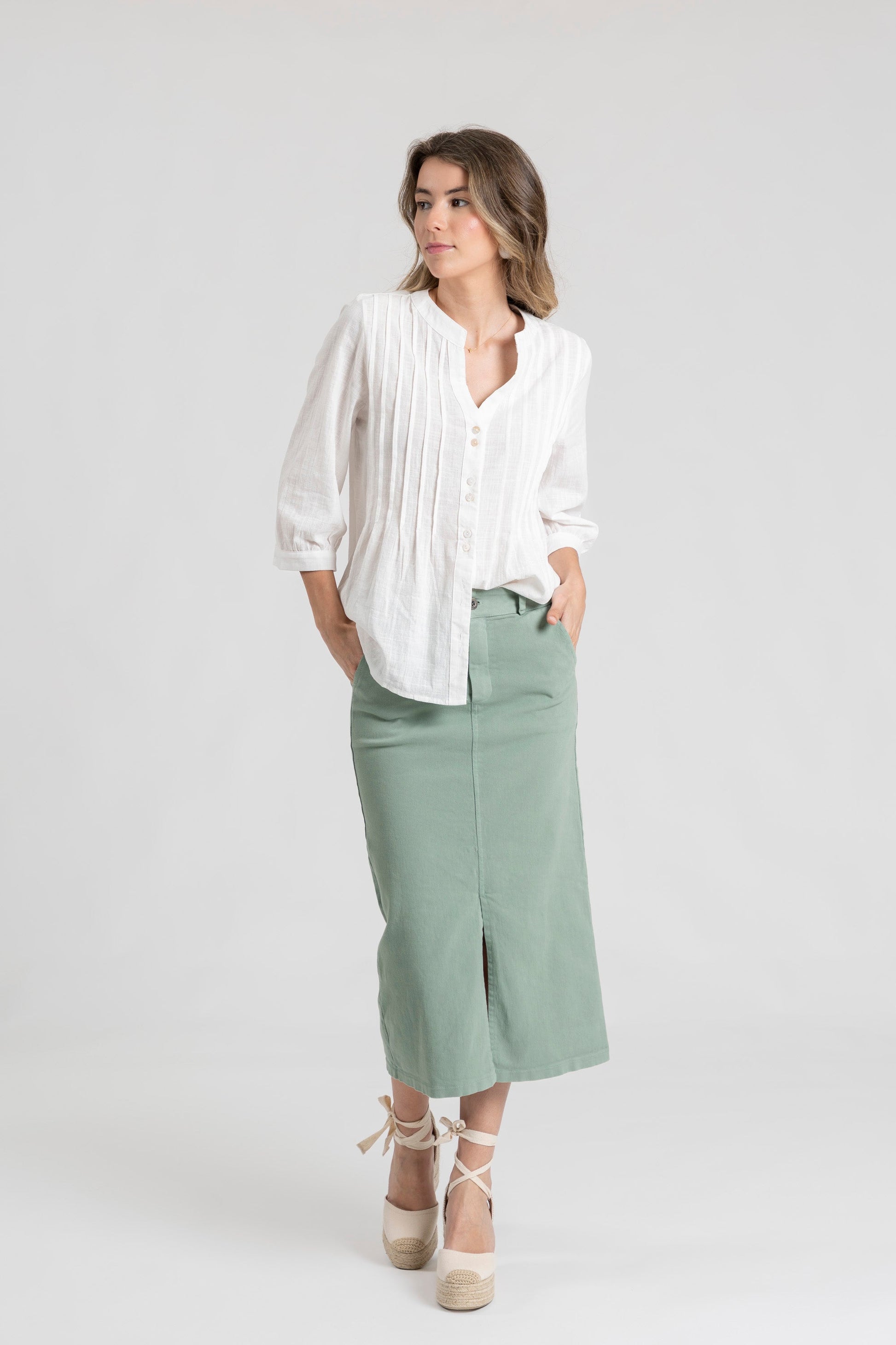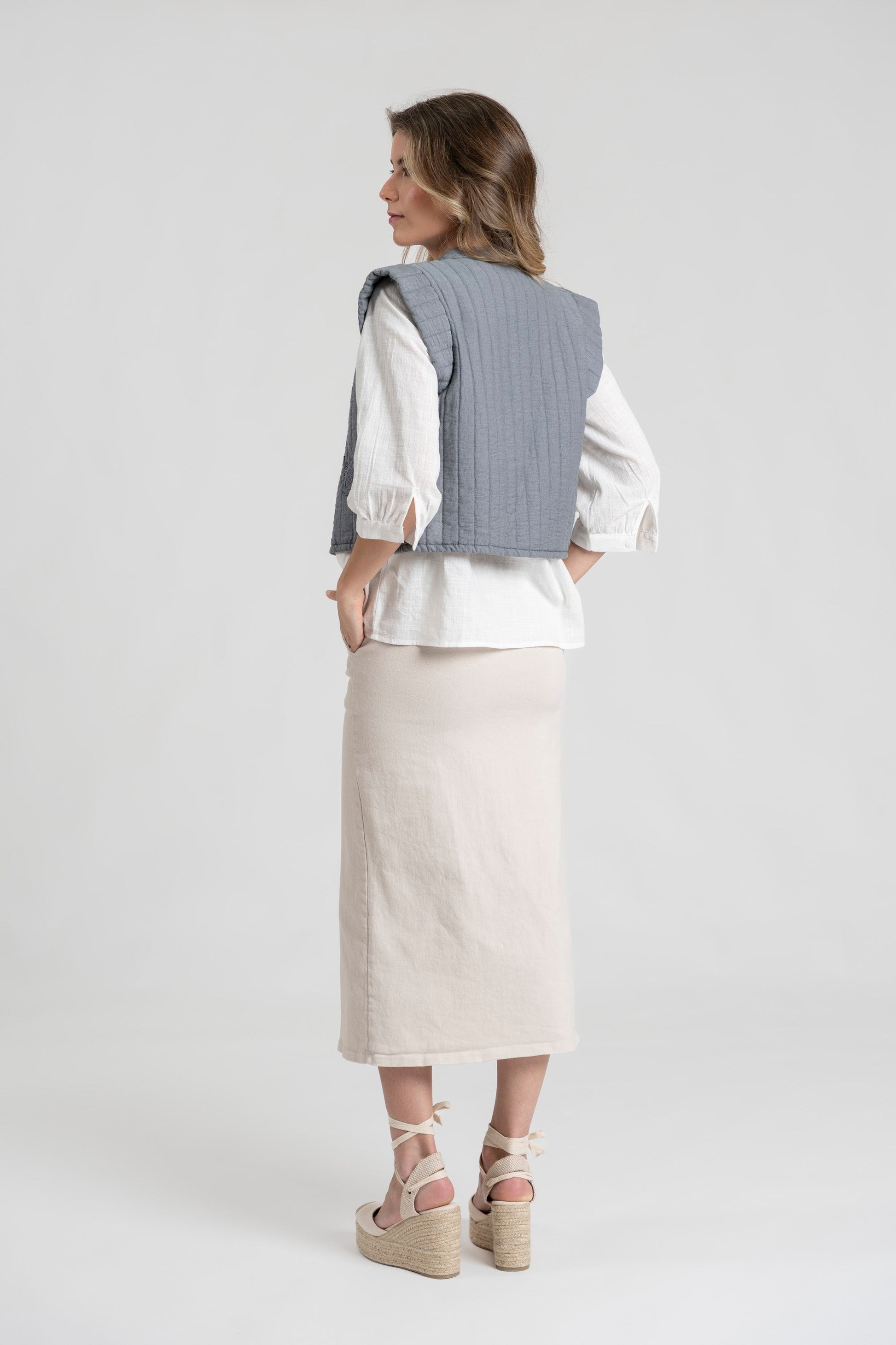 Tejido mezcla de algodón. Estilo tejano vaquero. Diseño midi. Diseño recto. Tiro alto. Cuatro bolsillos. Cierre de cremallera y botón. Trabillas. Bajo con abertura frontal. Talla modelo: S.