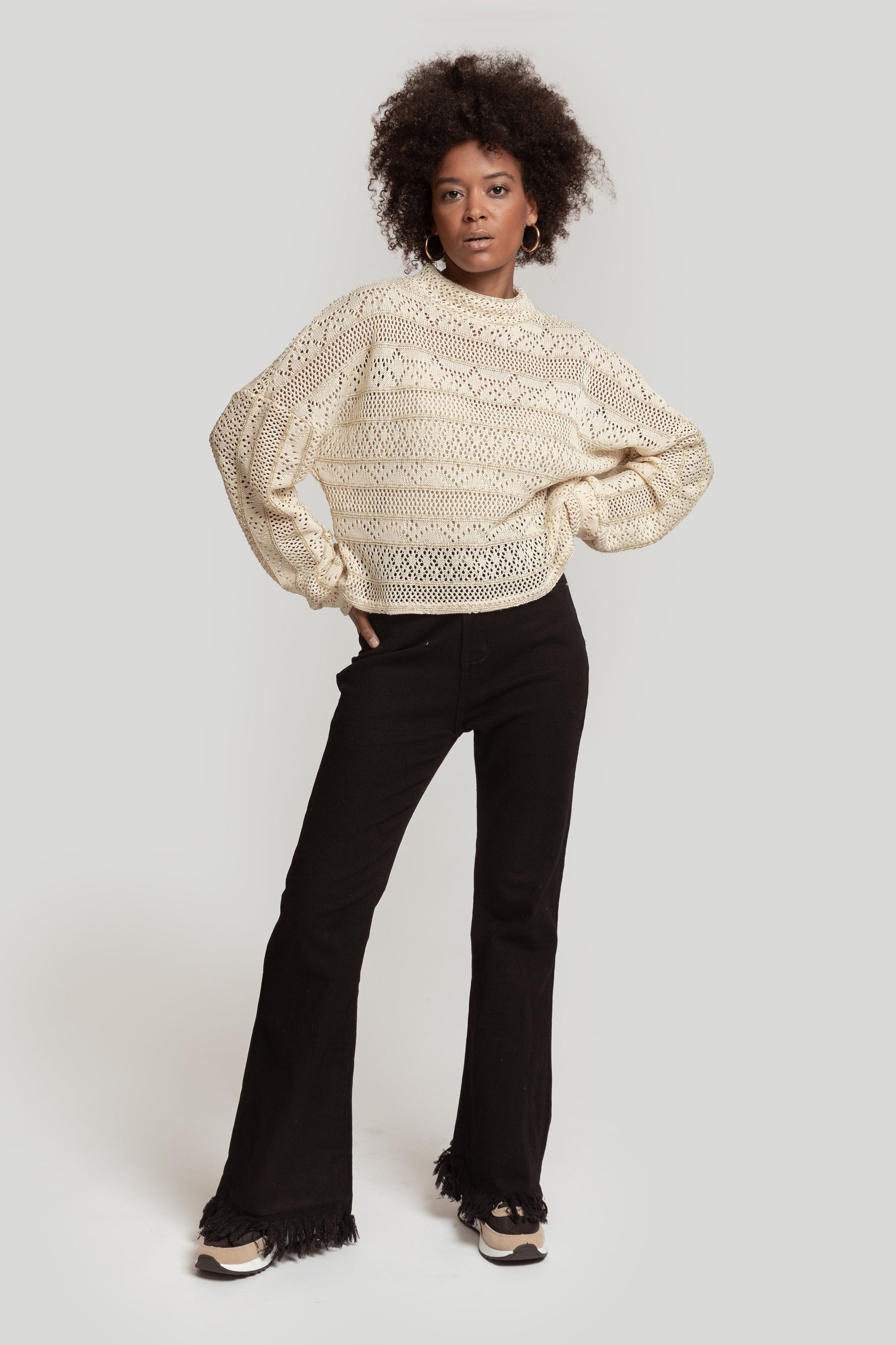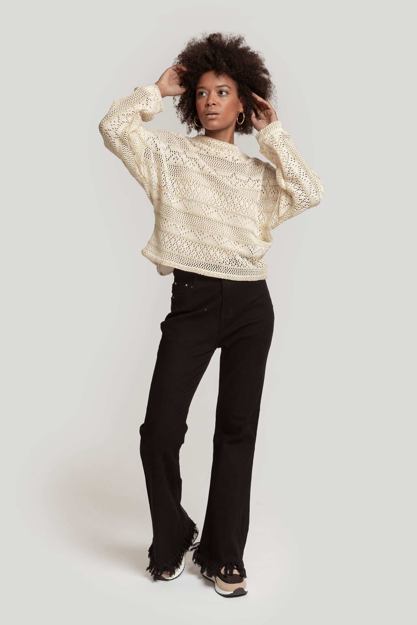 Tejido mezcla de algodón. Tiro alto. Diseño hasta el tobillo. Diseño flare. Cinco bolsillos. Cierre de cremallera y botón. Trabillas. Bajo deshilachado. Talla modelo: 34. Altura modelo 1,67 m.