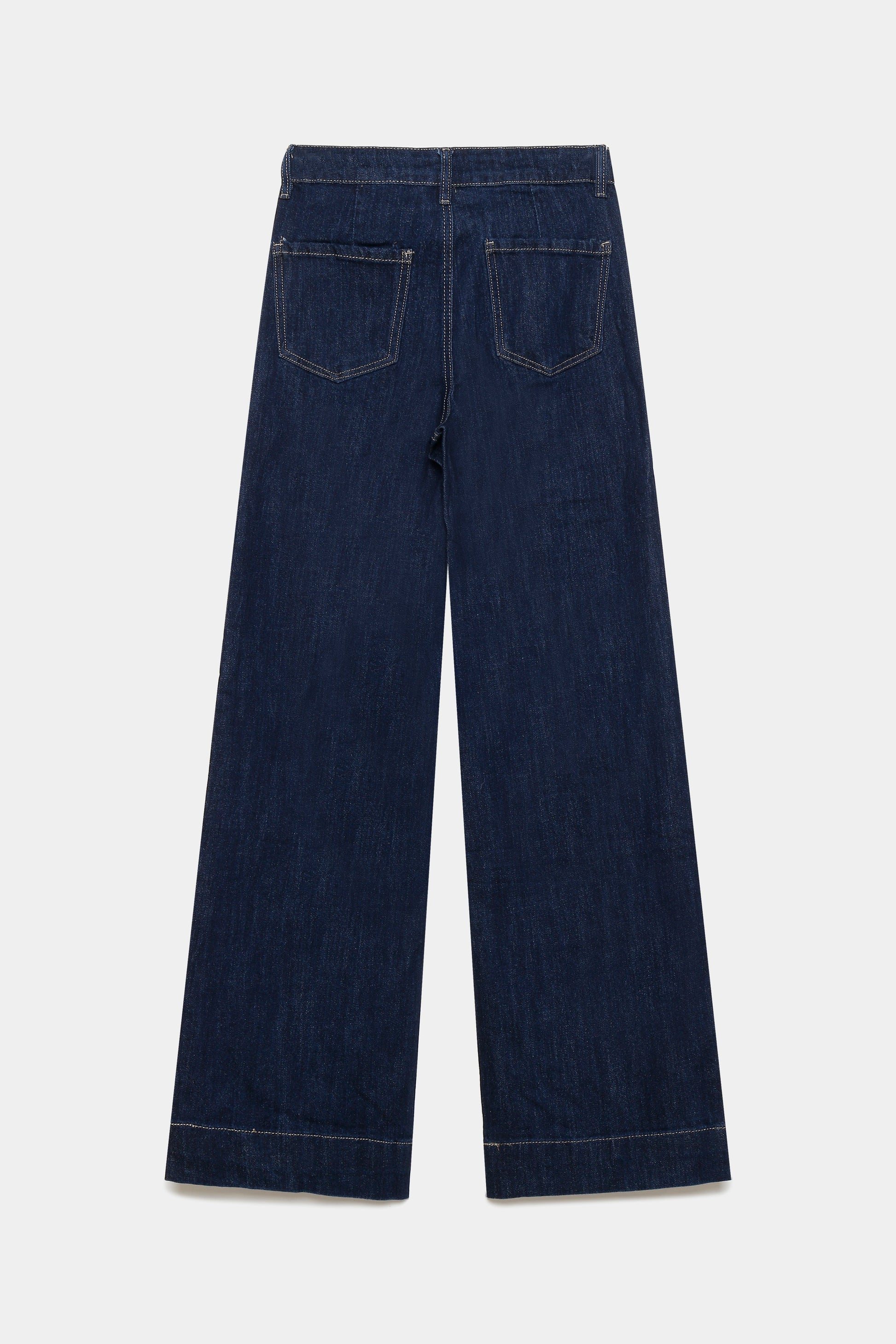 Tejido mezcla algodón. Tiro alto. Cuatro bolsillos. Diseño largo. Pernera ancha.
