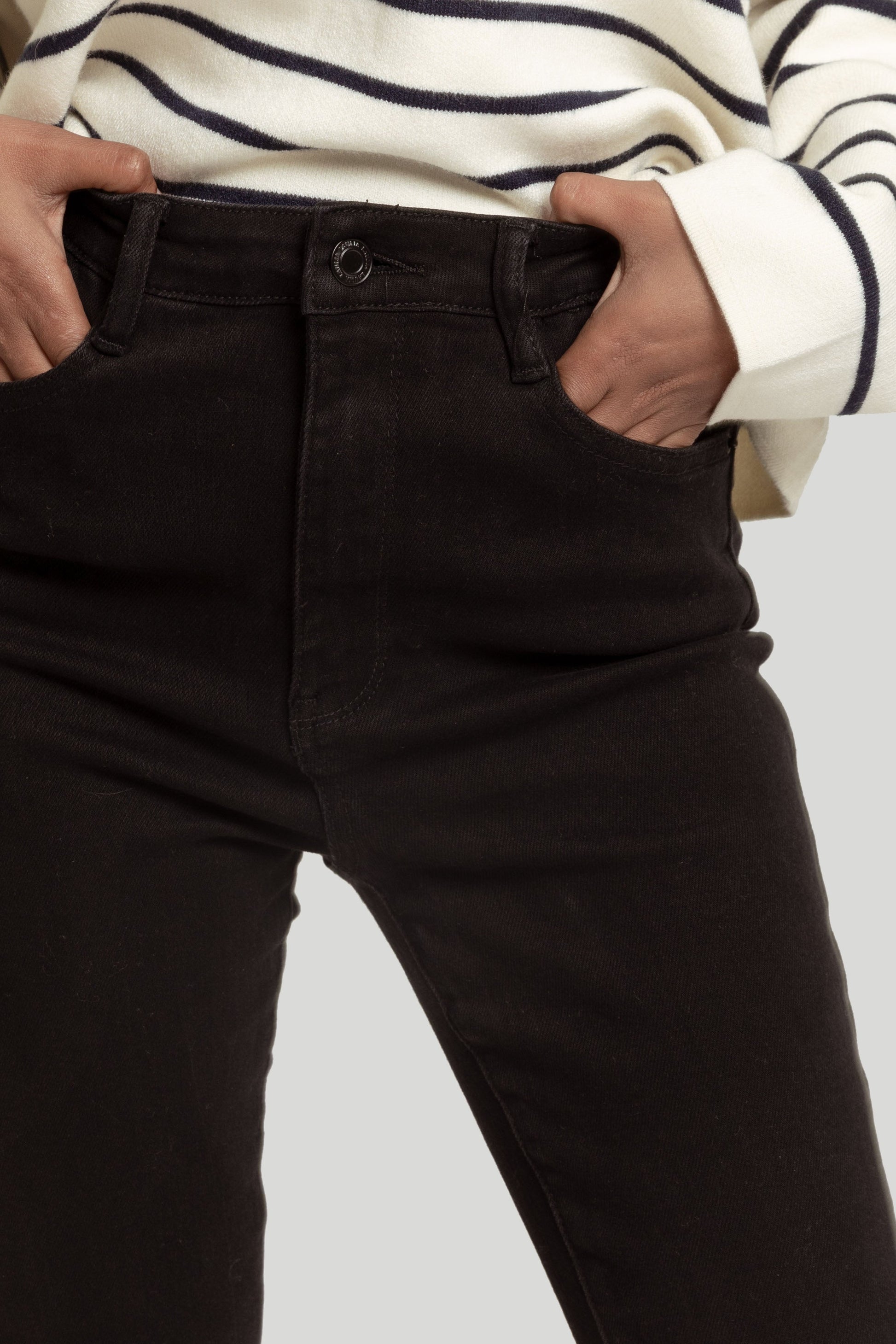 Tejido mezcla de algodón. Tejido tejano vaquero. Tiro extra alto. Tejido elástico. Cinco bolsillos. Cierre de cremallera y botón. Trabillas. Talla modelo: 34. Altura modelo: 1,65 m.