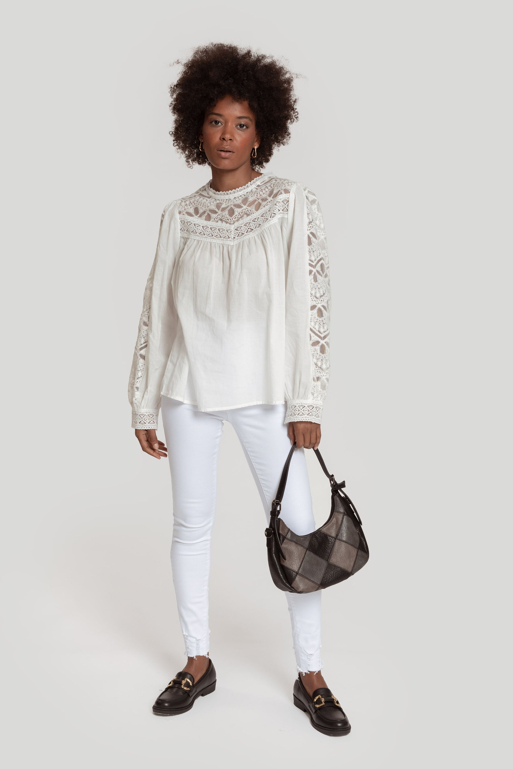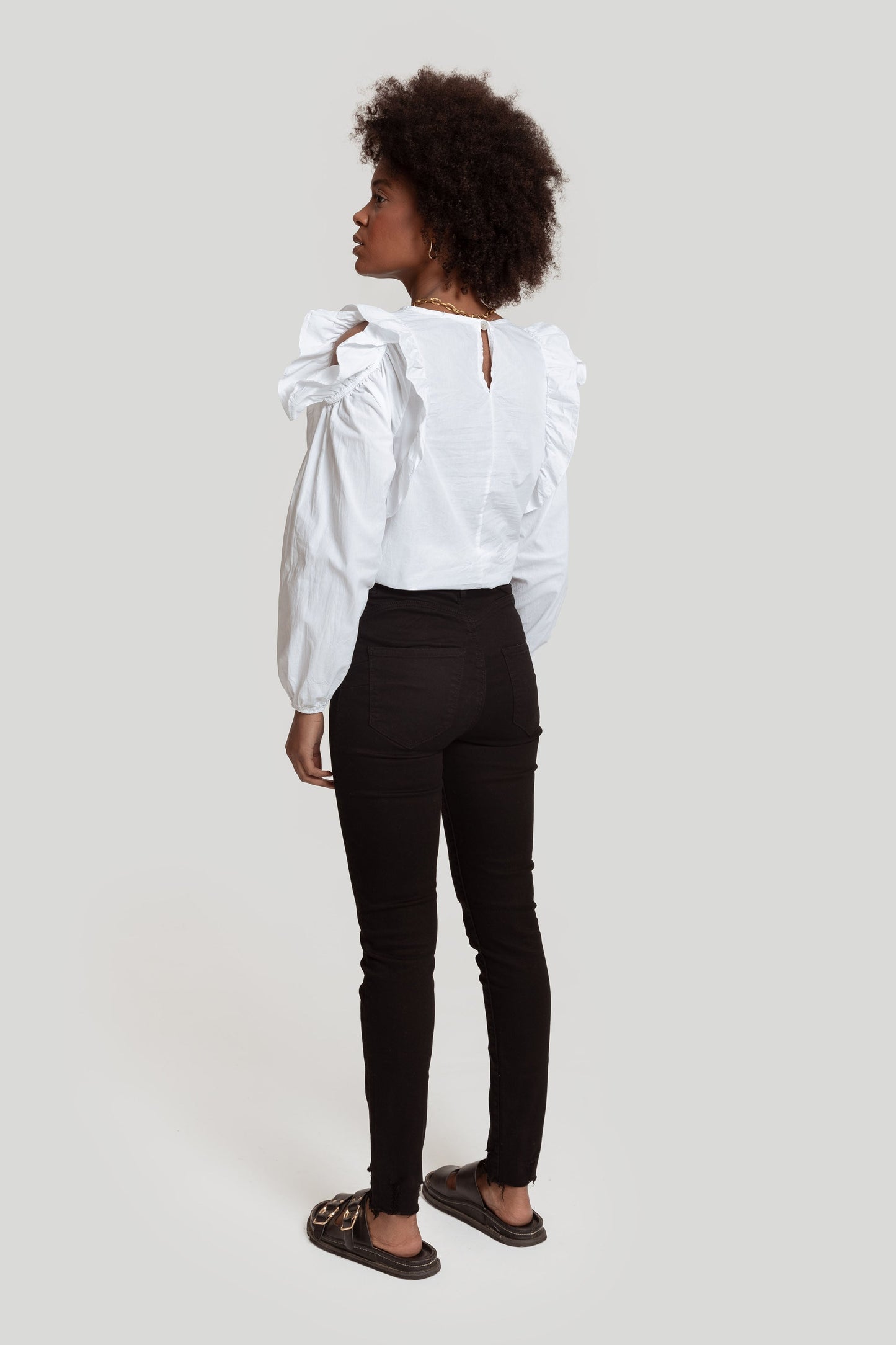 Tejido mezcla de algodón. Tiro alto. Diseño push up. Cinco bolsillos. Cierre de cremallera y botón. Trabillas. Bajo deshilachado. Bajo con abertura. Talla modelo: 34. Altura modelo 1,65 m.