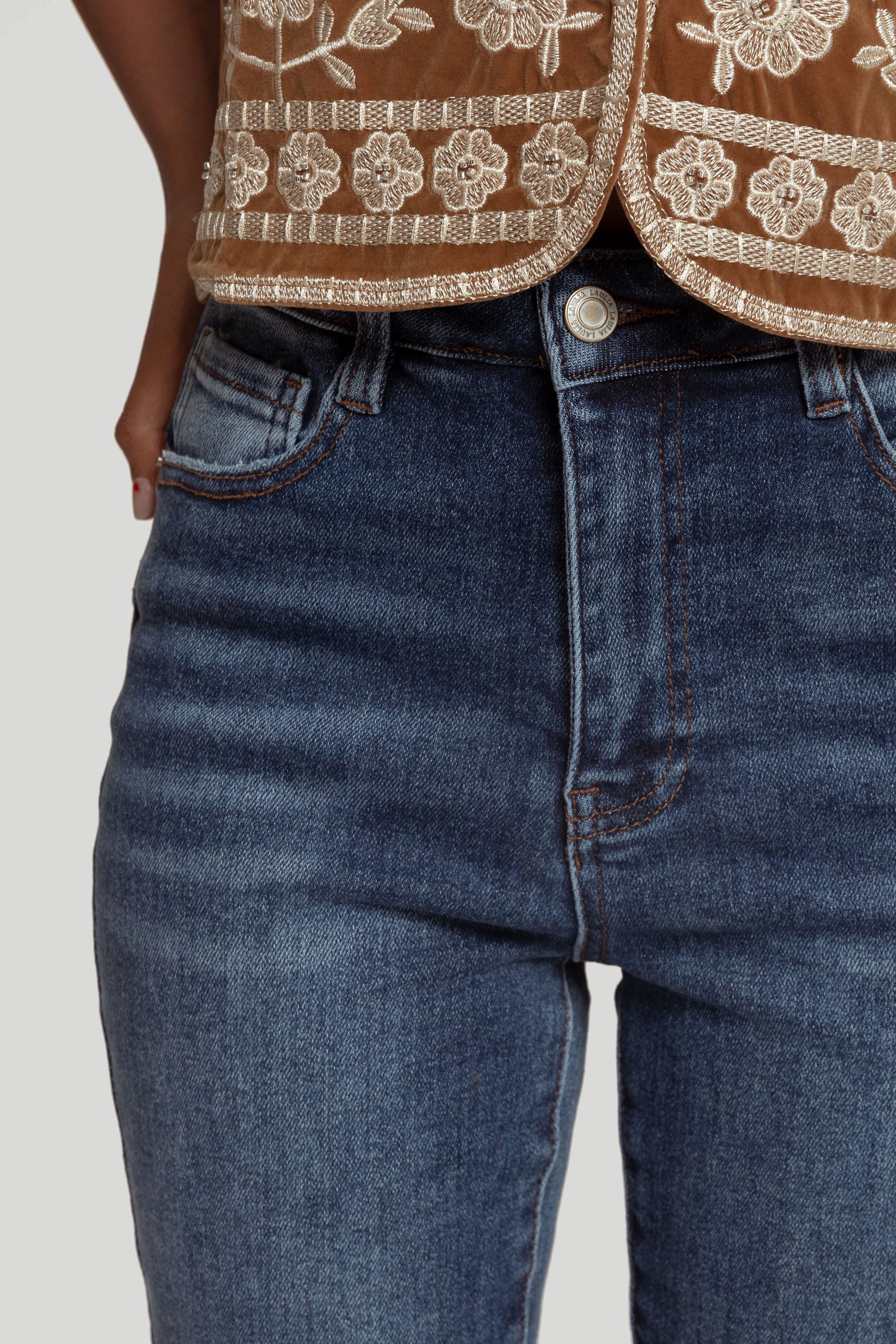 Tejido mezcla de algodón. Tiro alto. Diseño push up. Cinco bolsillos. Cierre de cremallera y botón. Trabillas. Bajo con vuelta. Talla modelo: 36. Altura modelo 1,66 m.