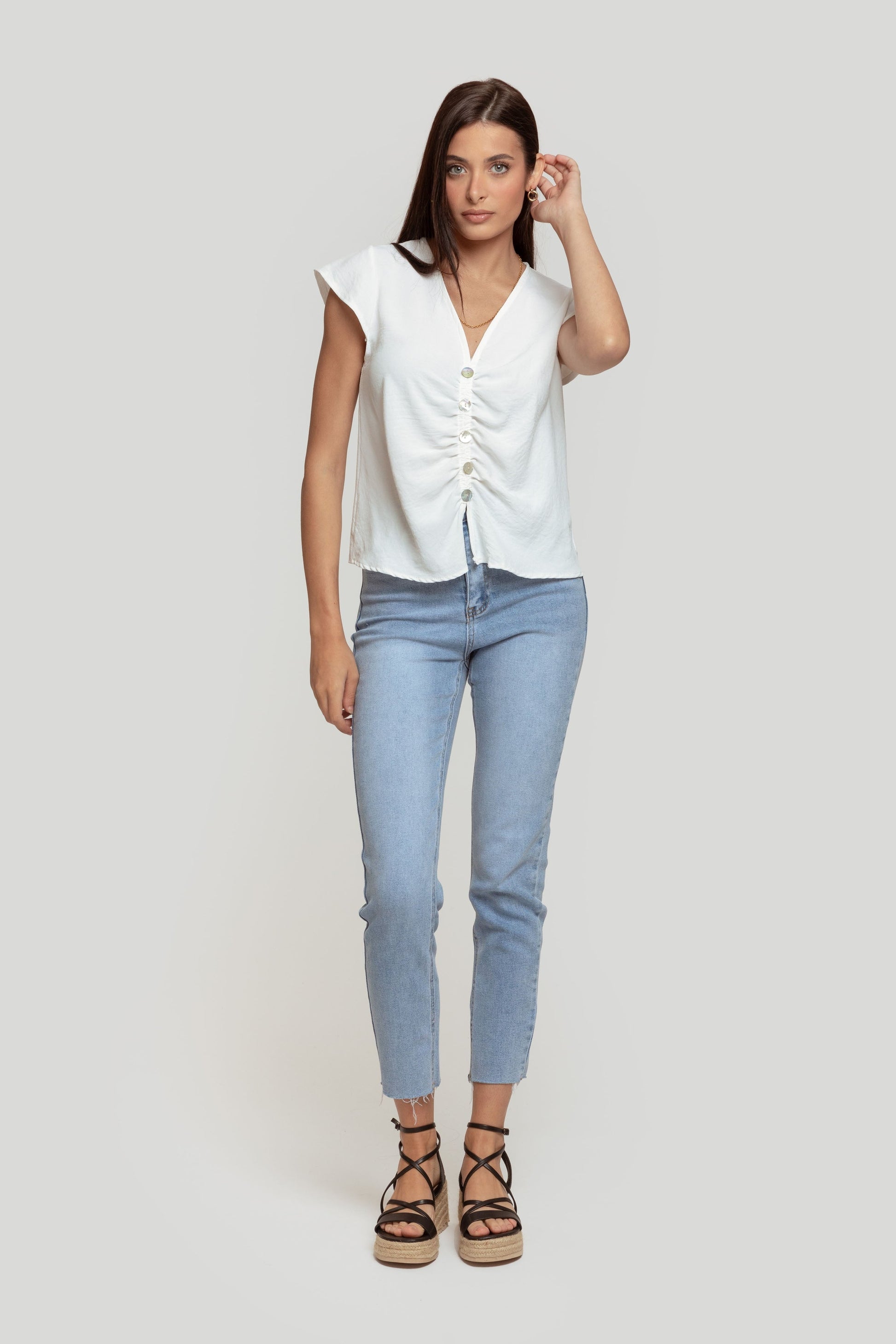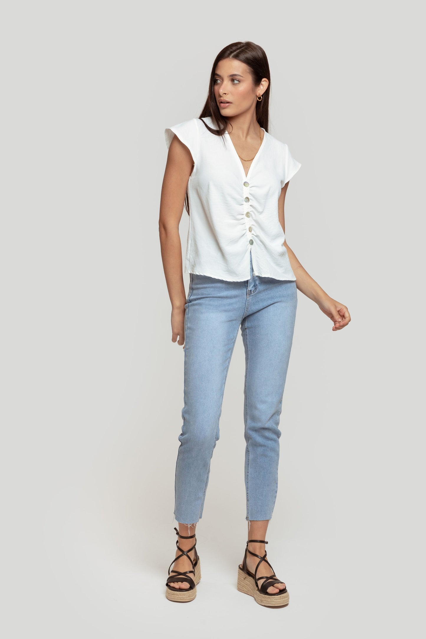 Tejido mezcla de algodón. Tejido tejano vaquero. Tejido lavado. Tiro alto. Tejido elástico. Corte Regular. Cinco bolsillos. Cierre de cremallera y botón. Trabillas. Bajo sin rematar. Talla modelo: 36. Altura modelo: 1,76 m.