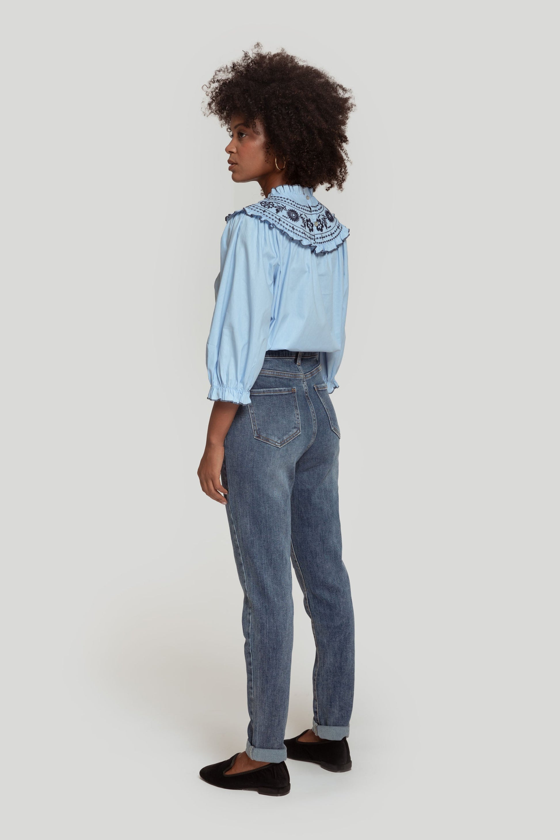 Jeans mezcla de algodón. Tiro alto. Regular fit. Cinco bolsillos. Cierre de cremallera y botón. Trabillas. Bajo con vuelta. Talla modelo: 36. Altura modelo: 1,66 m.