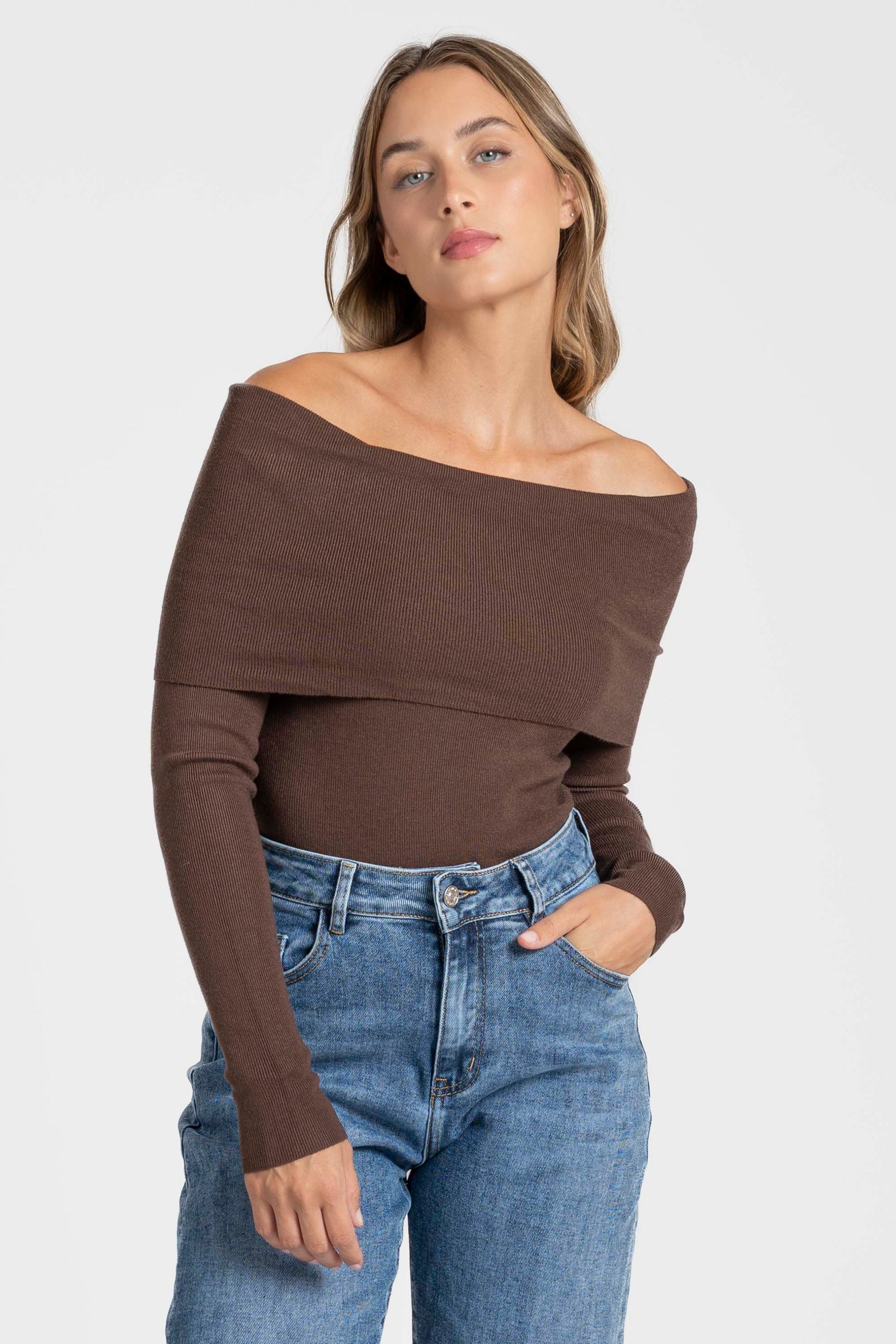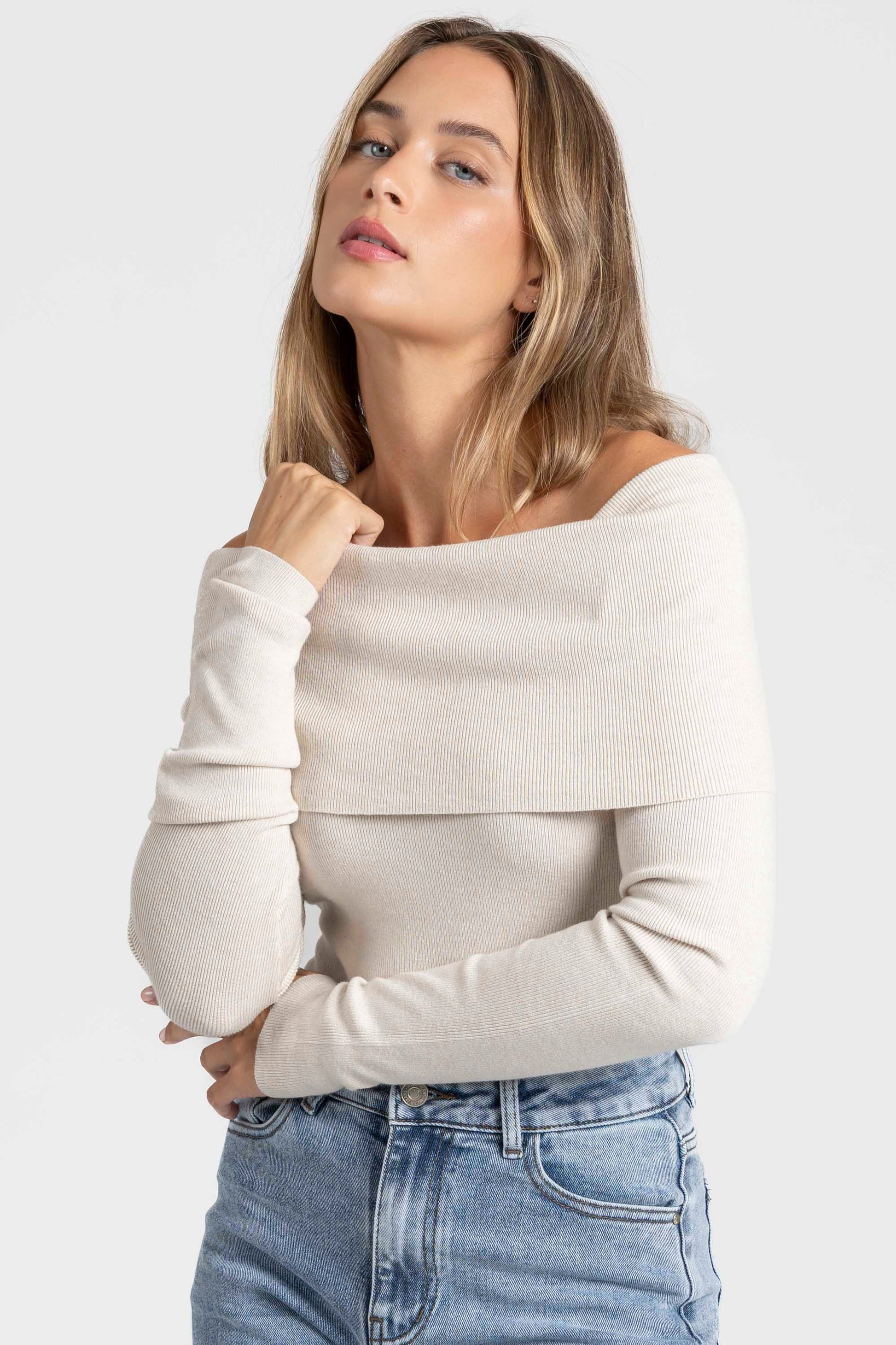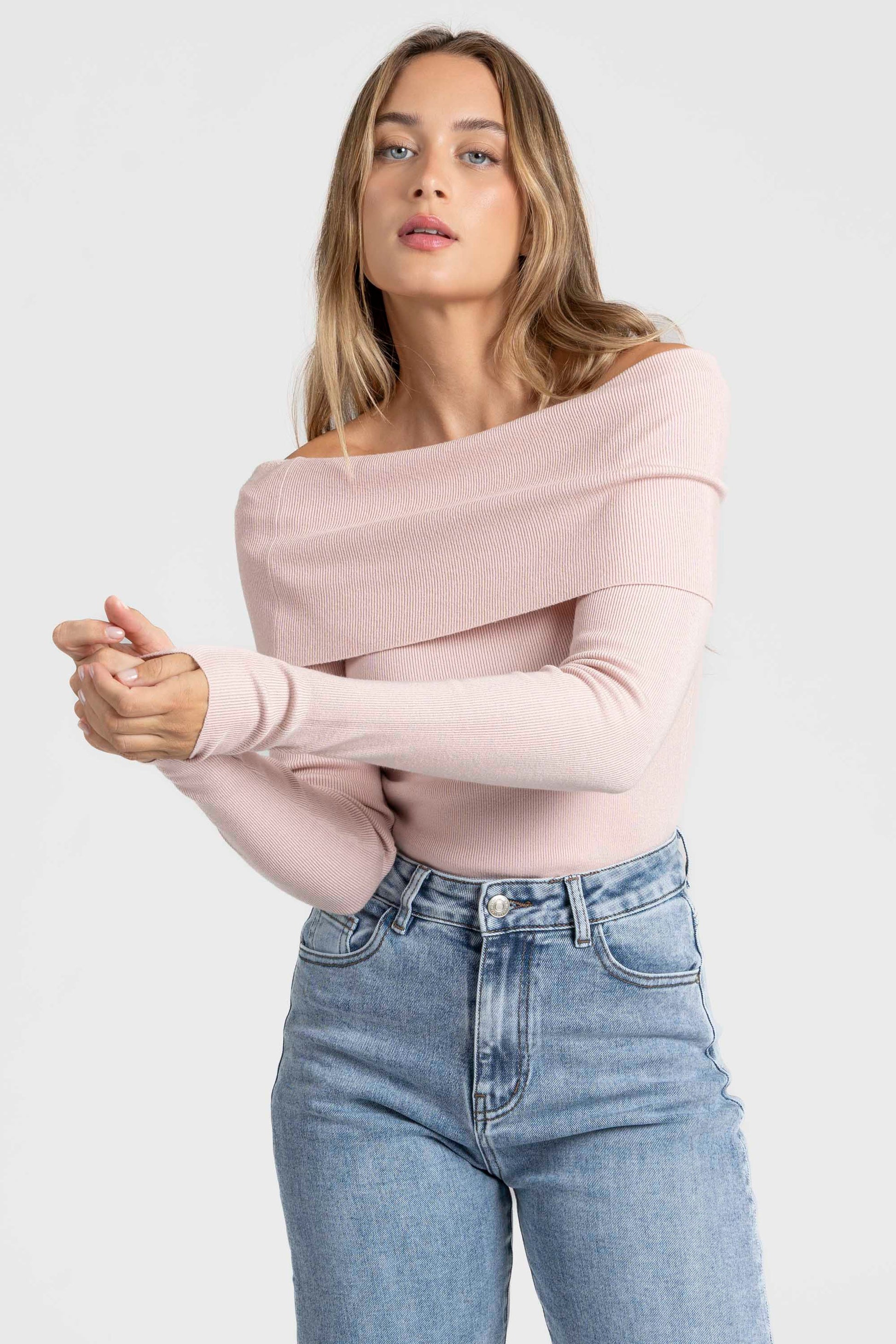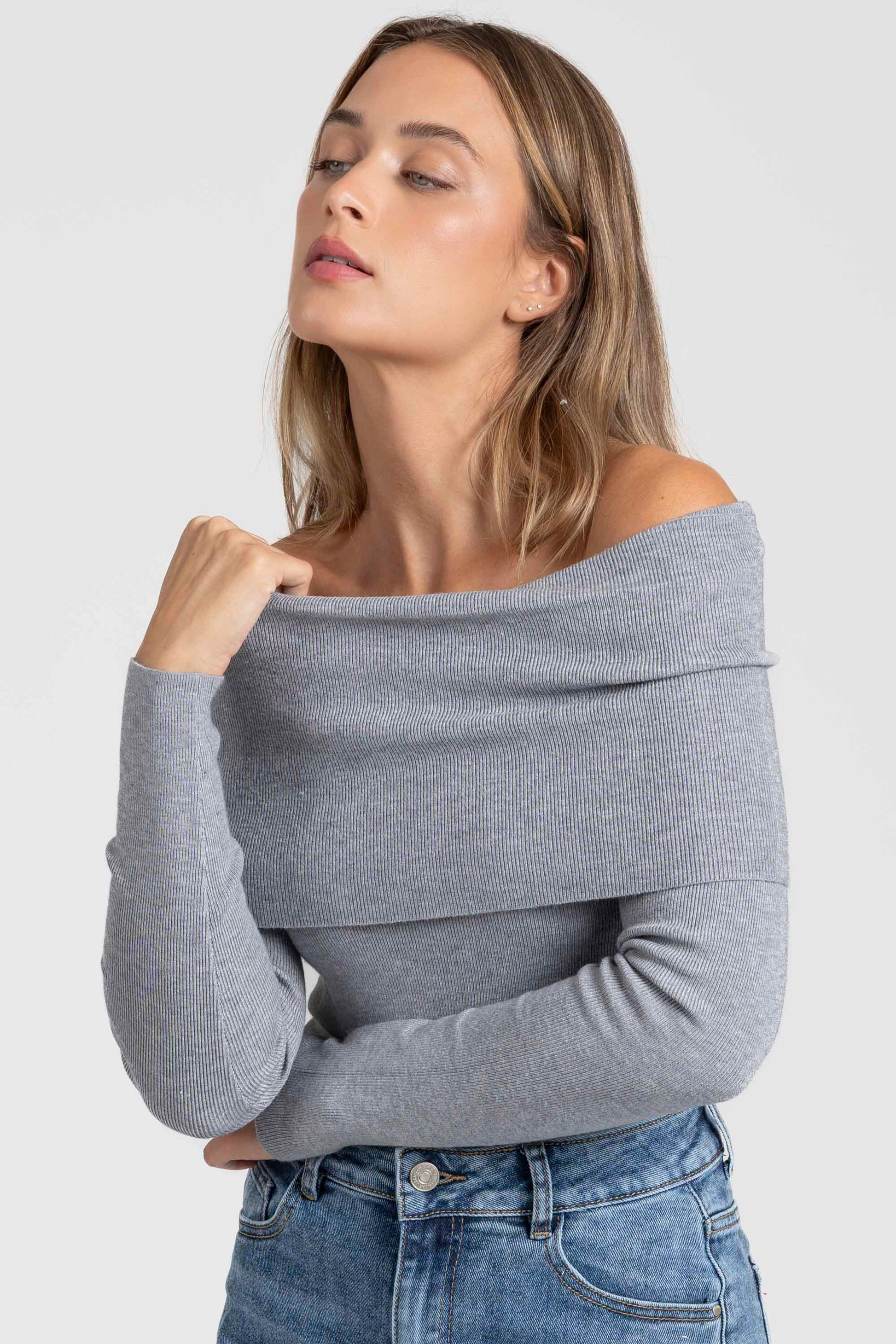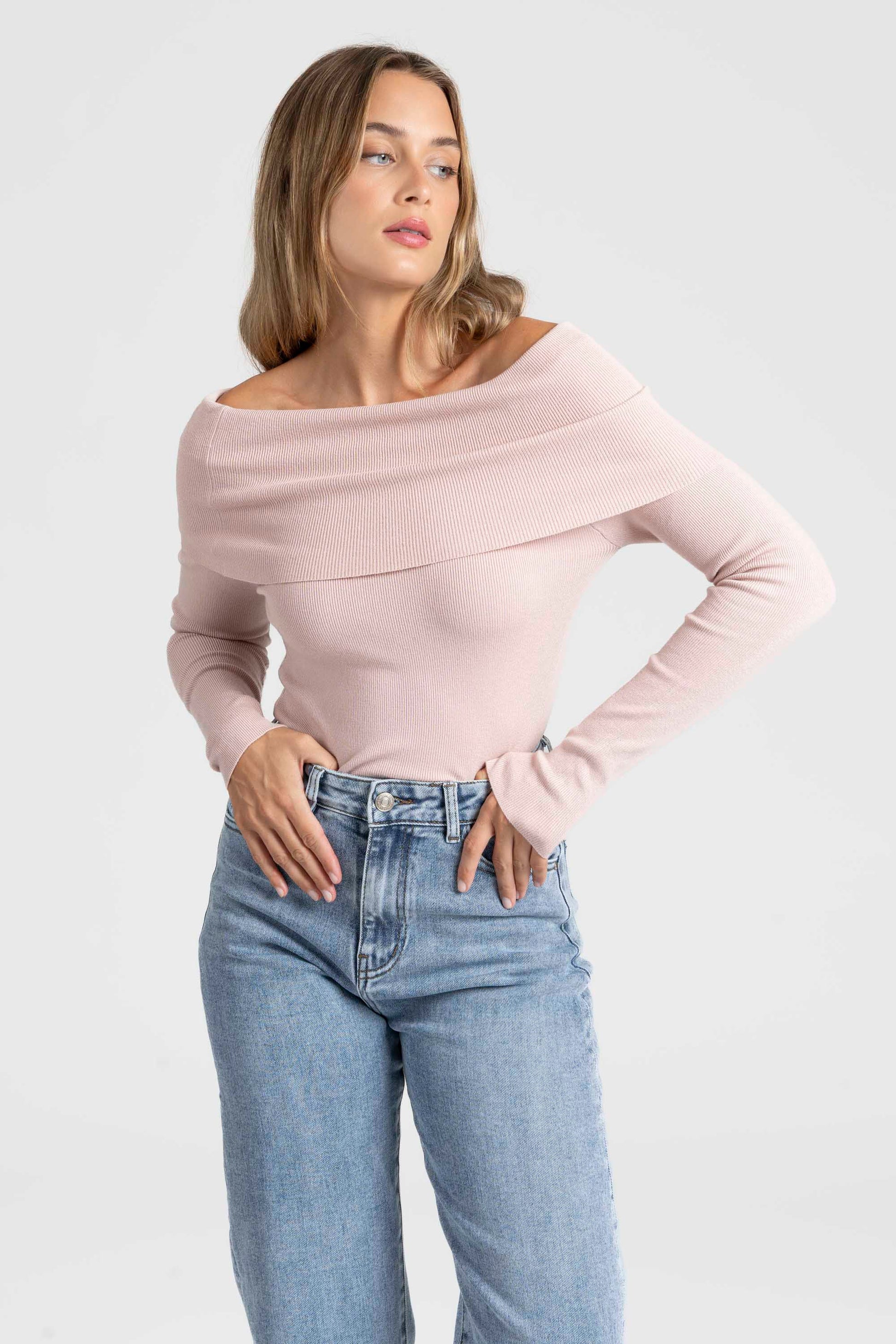 Tejido de punto. Escote recto acabado en vuelta con los hombros descubiertos y manga larga.