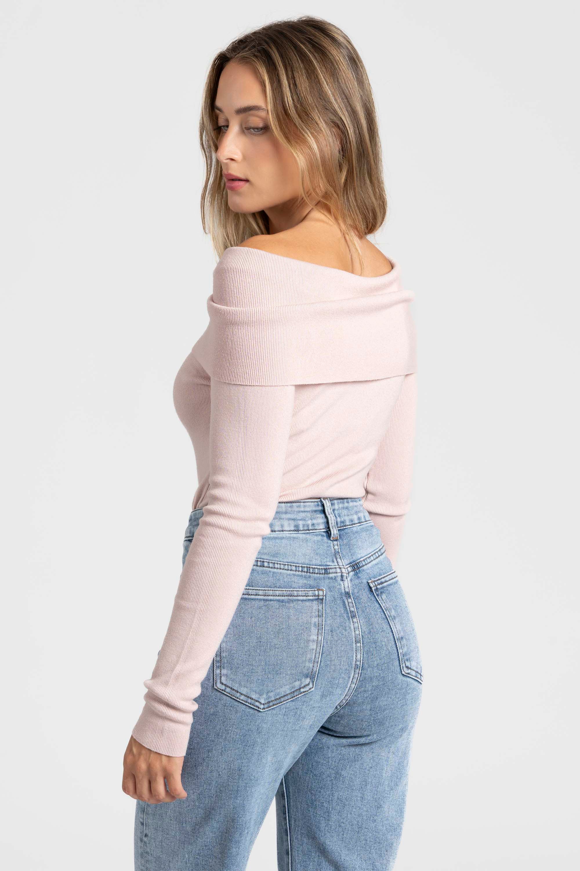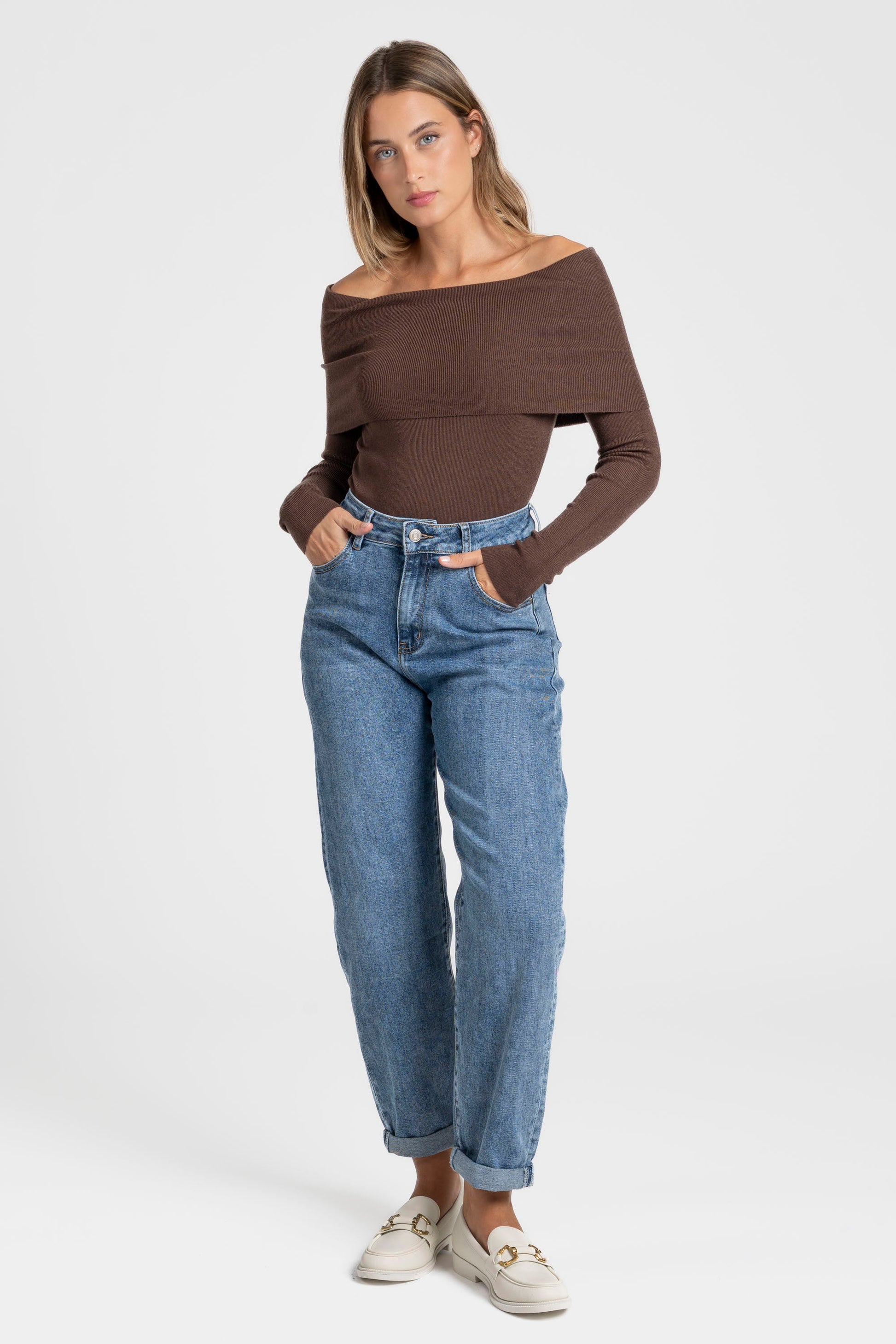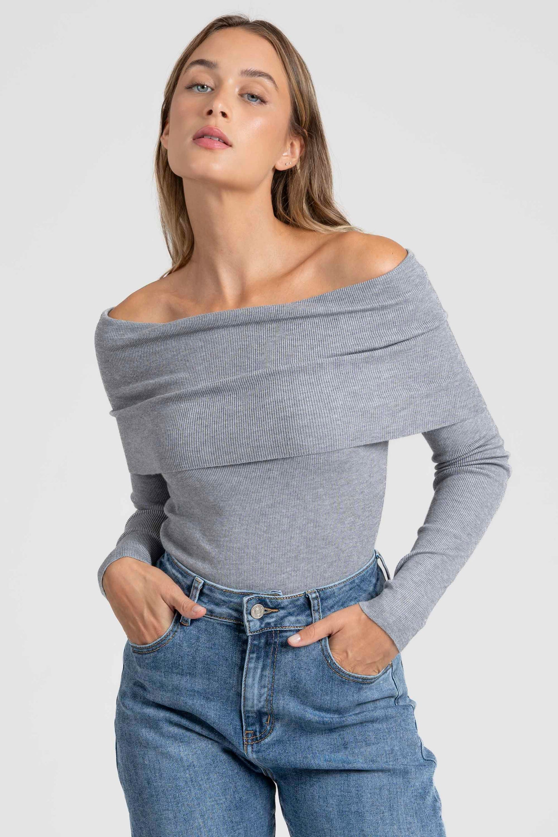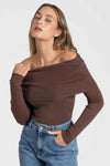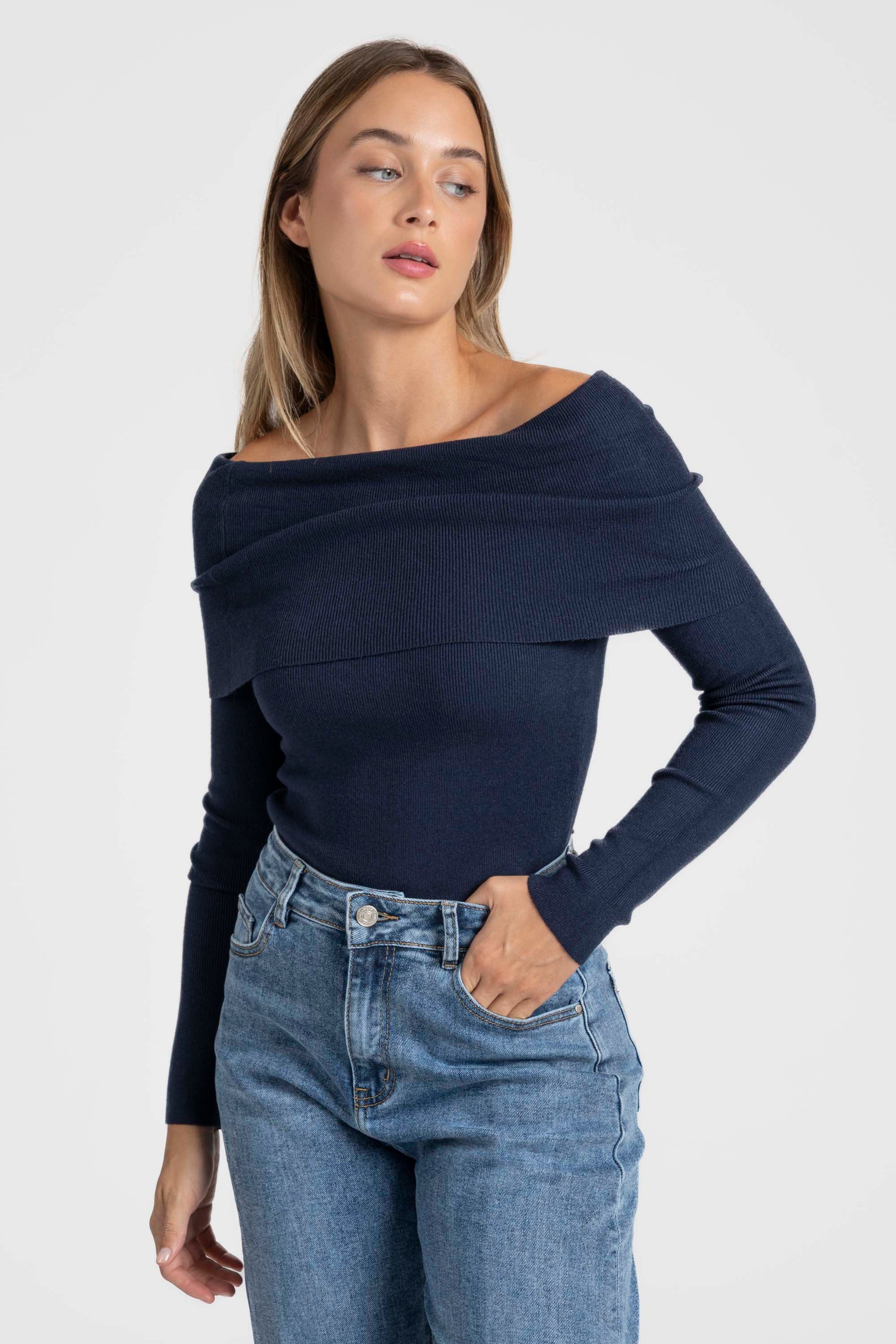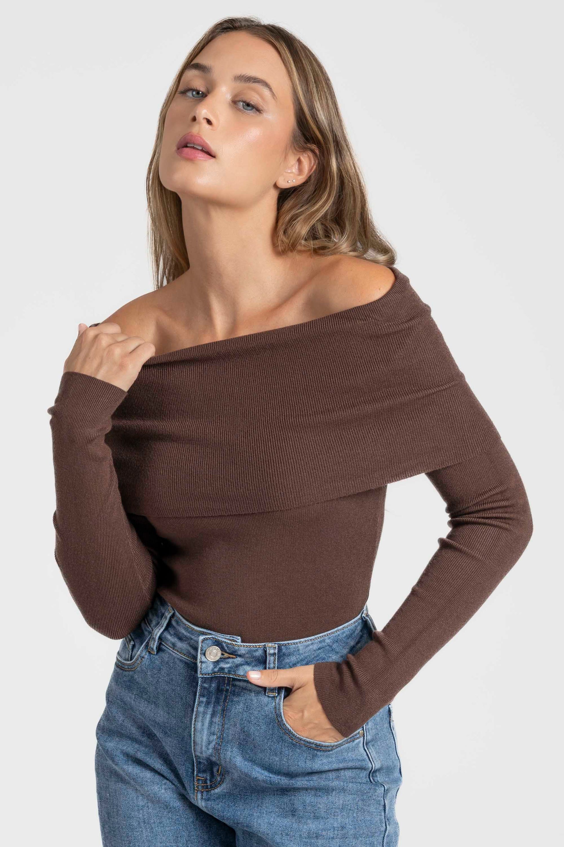 Tejido de punto. Escote recto acabado en vuelta con los hombros descubiertos y manga larga.