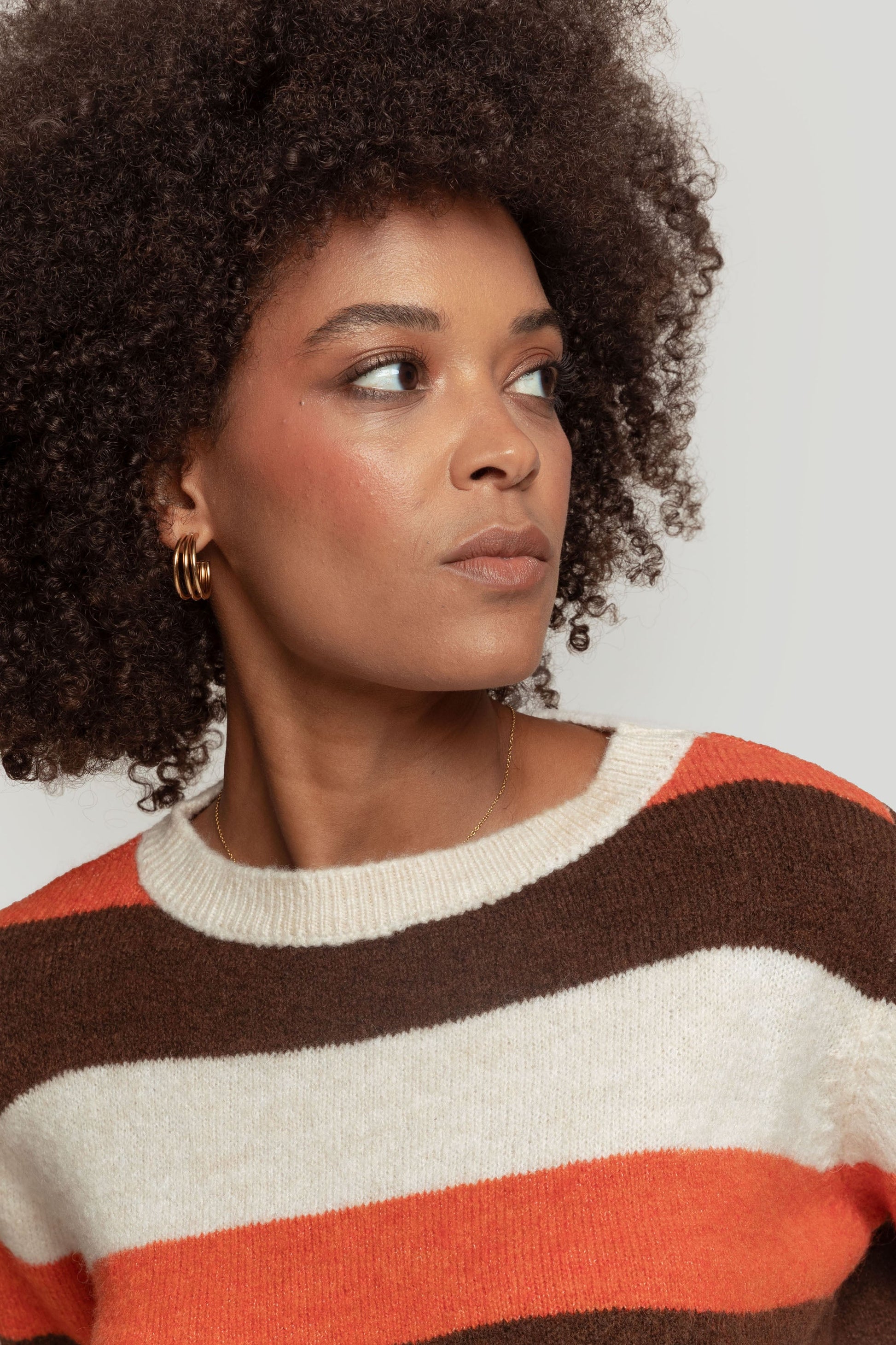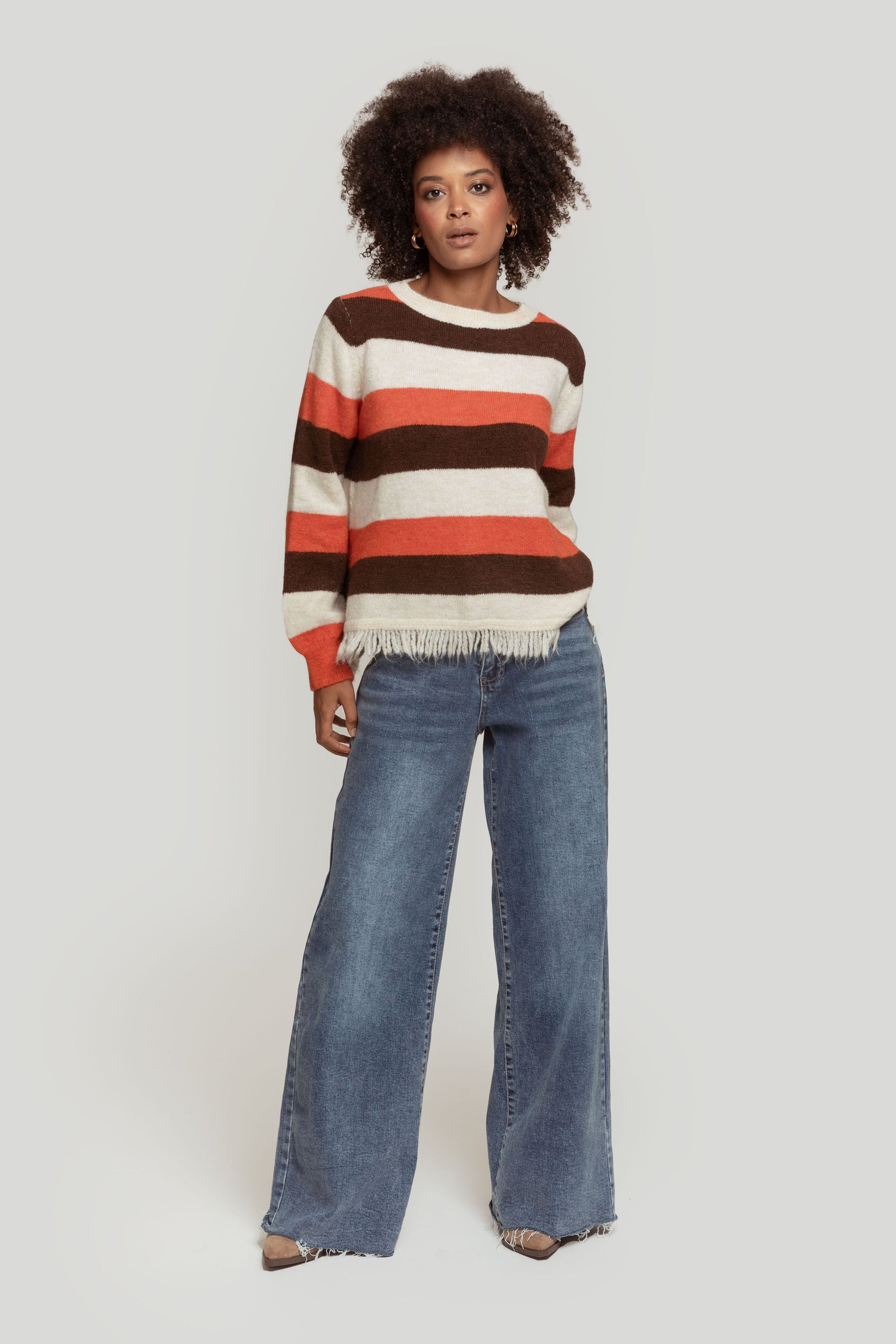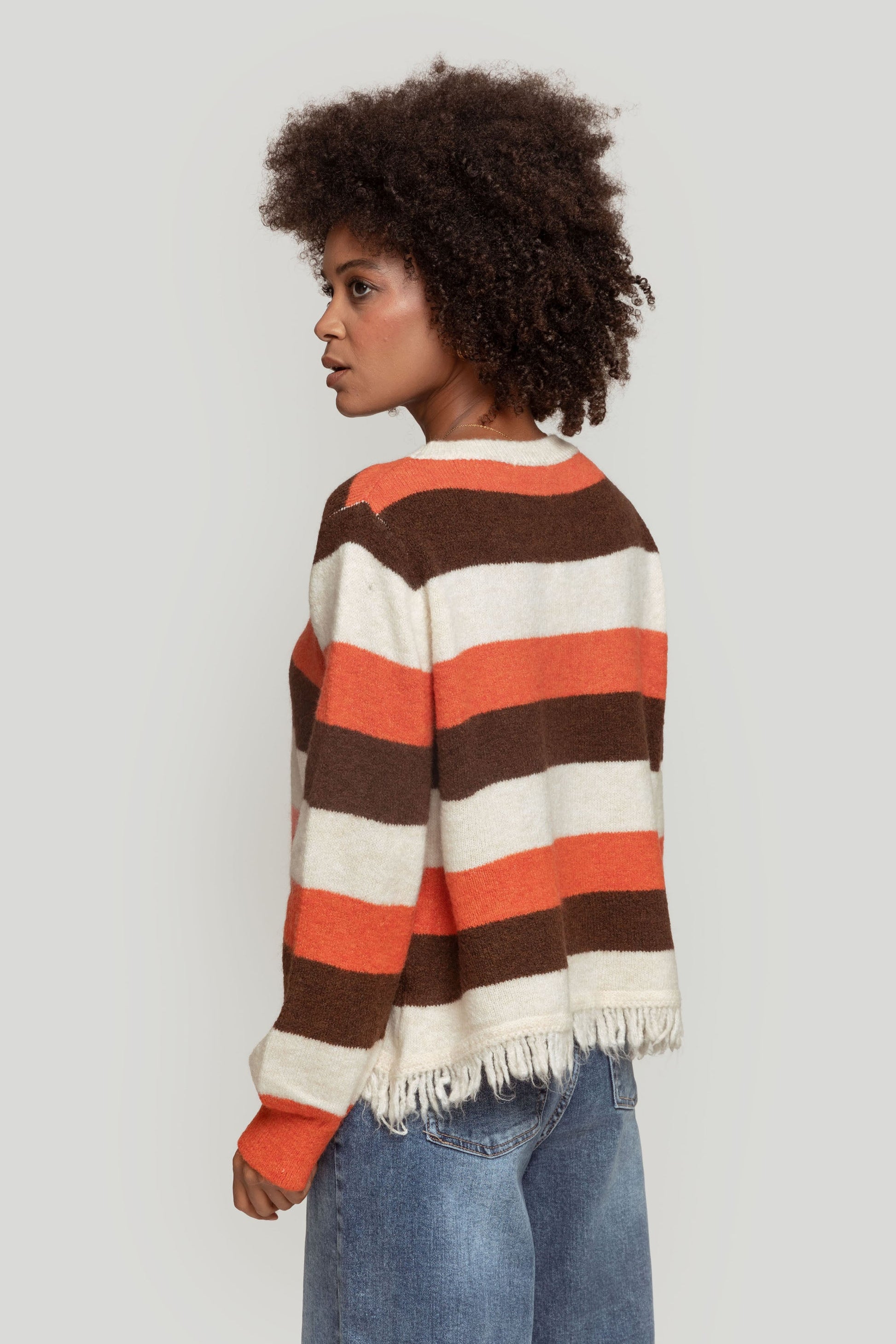 Tejido de punto. Estampado rayas. Cuello redondo. Manga larga. Diseño recto. Terminaciones en canalé. Bajo flecos. Talla modelo: S Altura modelo 1,66 m.