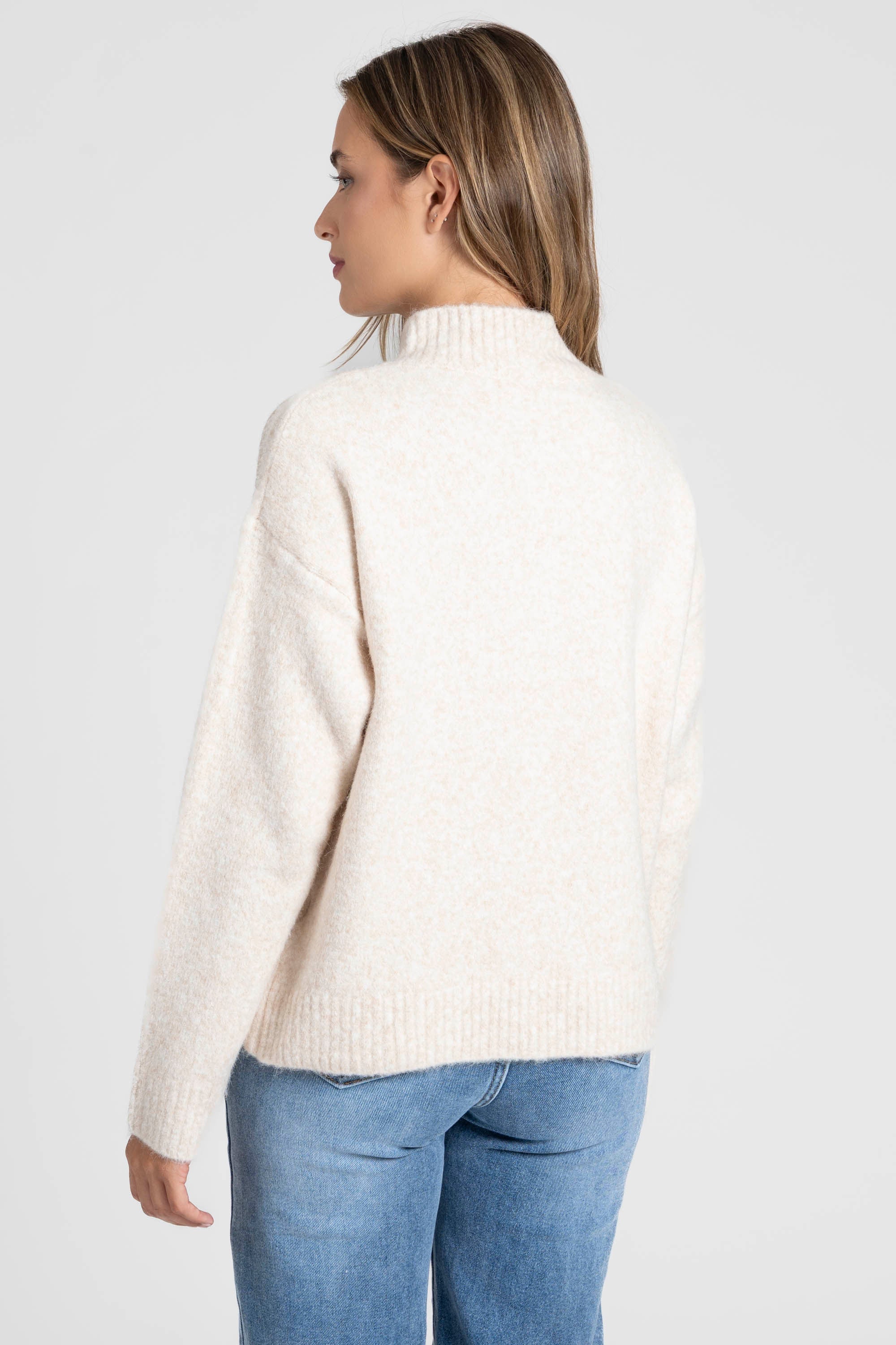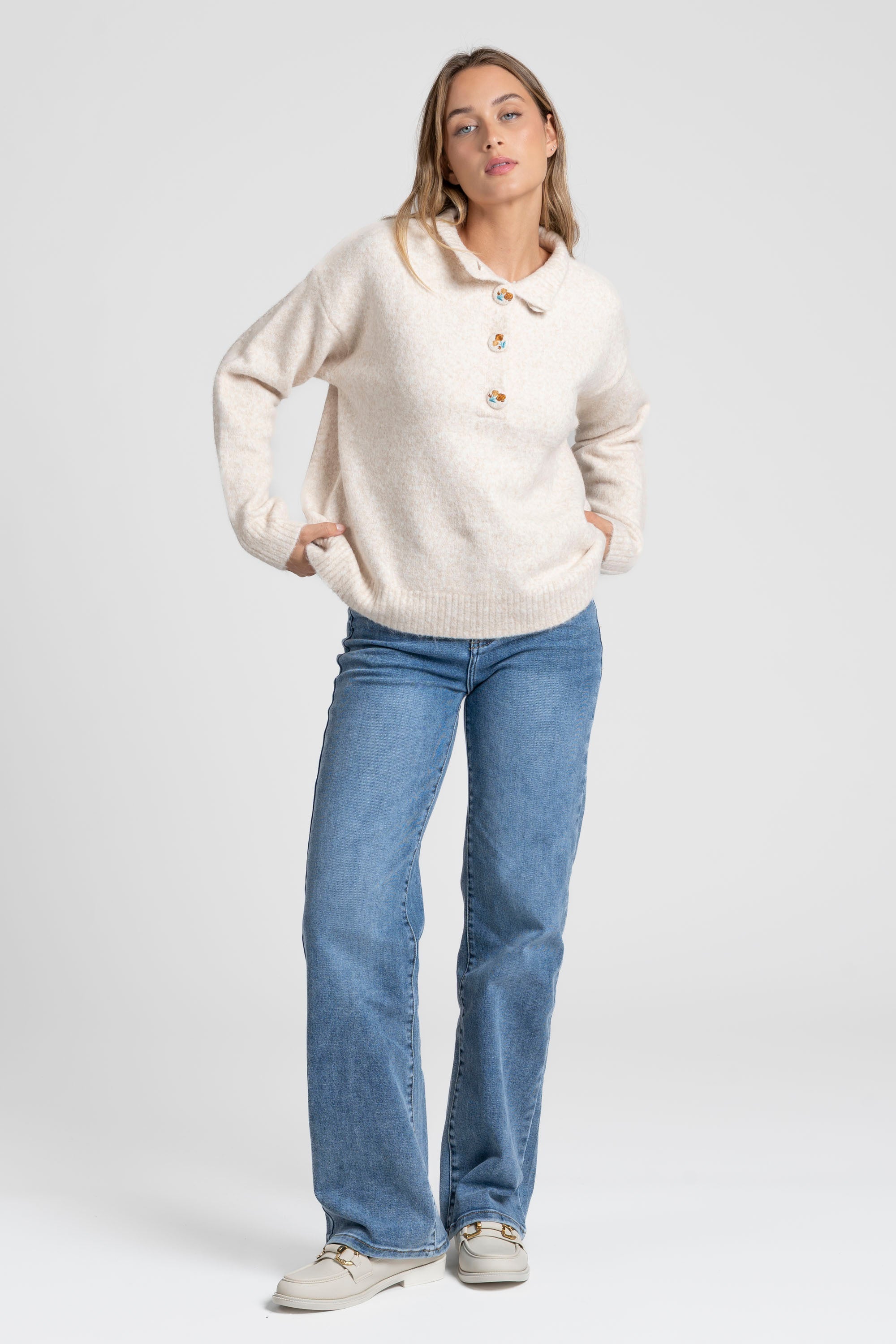 Tejido punto. Cuello subido con botones bordados. Manga larga. Acabados rib.