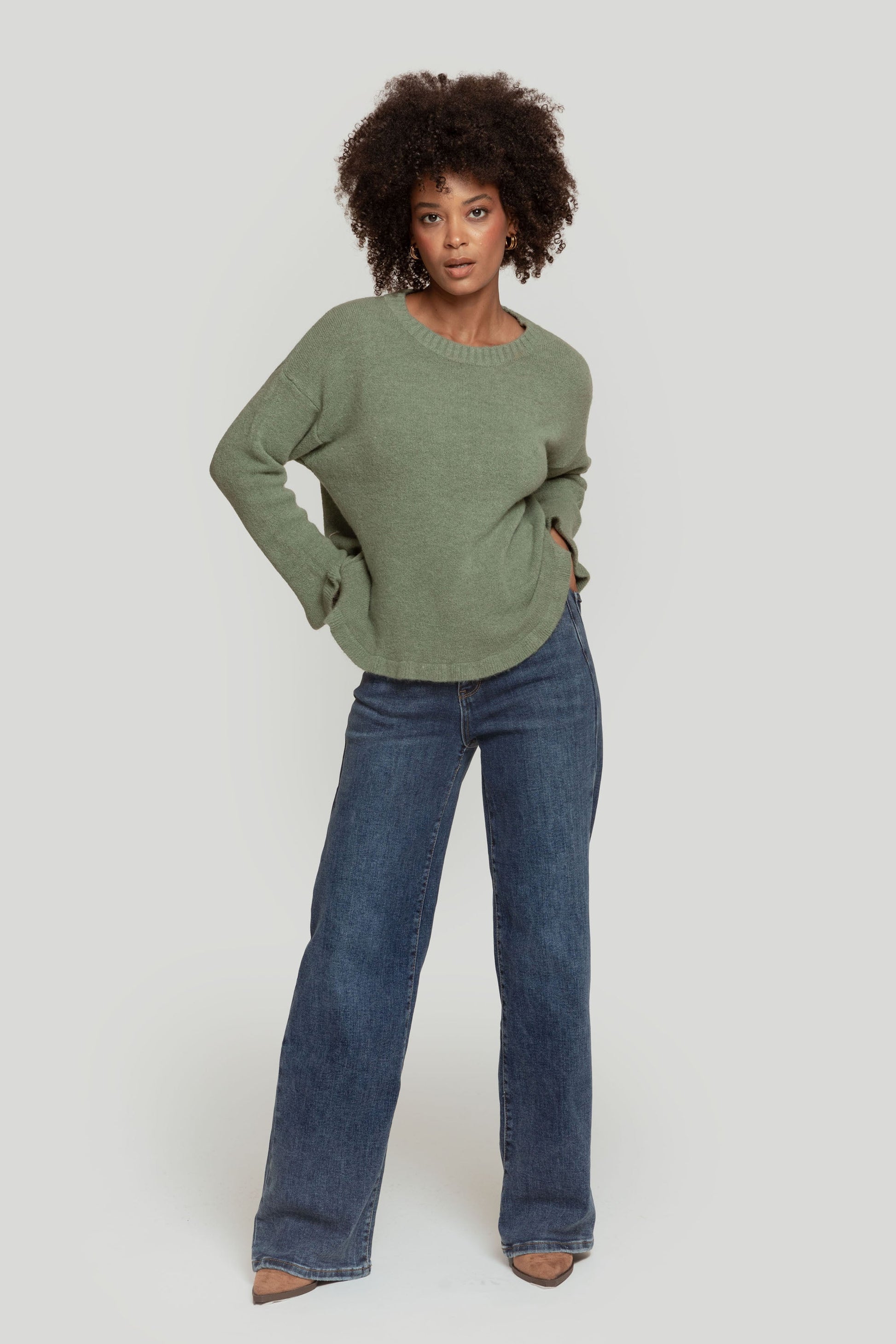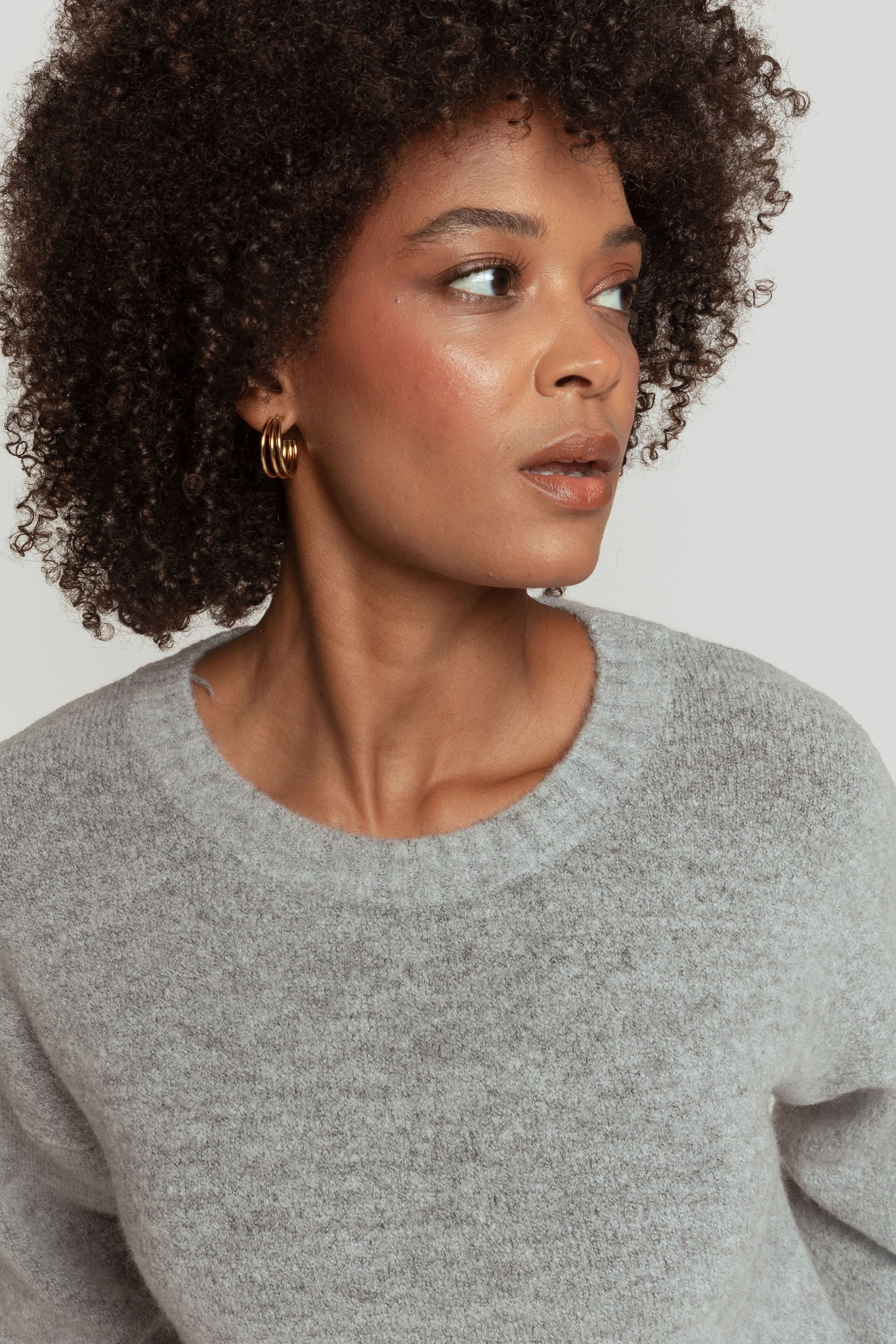 Tejido de punto. Diseño amplio. Diseño recto. Cuello redondo. Manga larga. Terminaciones volante. Acabado pelitos. Talla modelo: S Altura modelo: 1,66 m.
