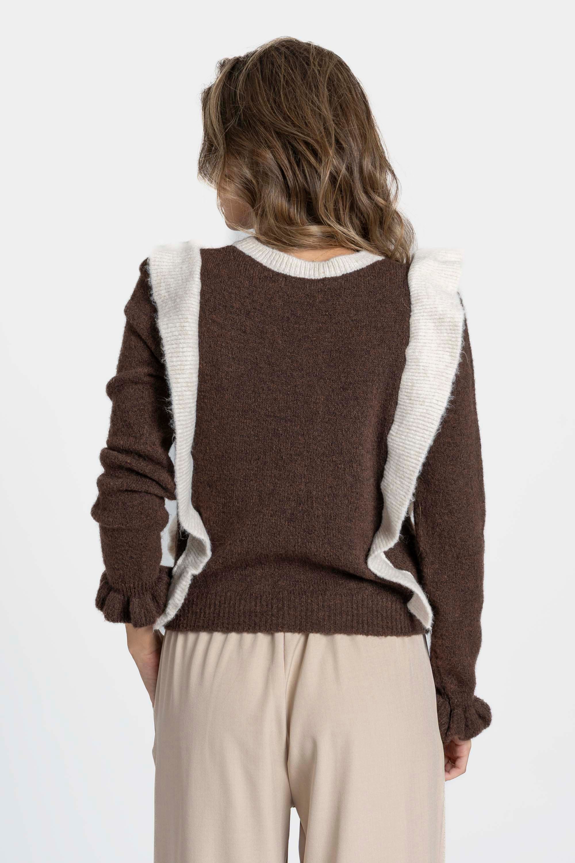 Tejido de punto. Punto medio. Diseño recto. Cuello redondo. Manga larga. Acabado lana. Puño acampanado. Detalle volantes. Talla modelo: S. Altura modelo: 1.75 m.