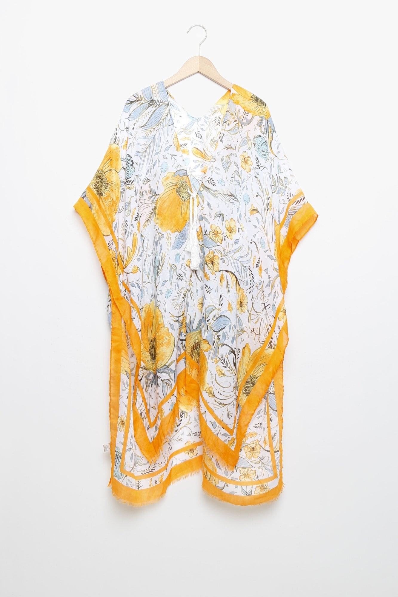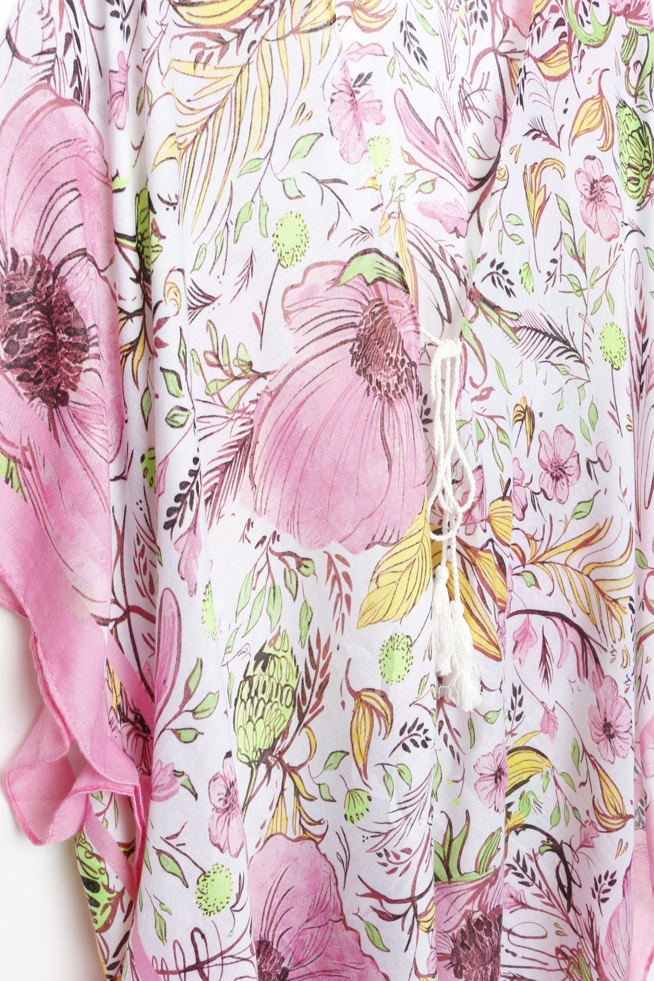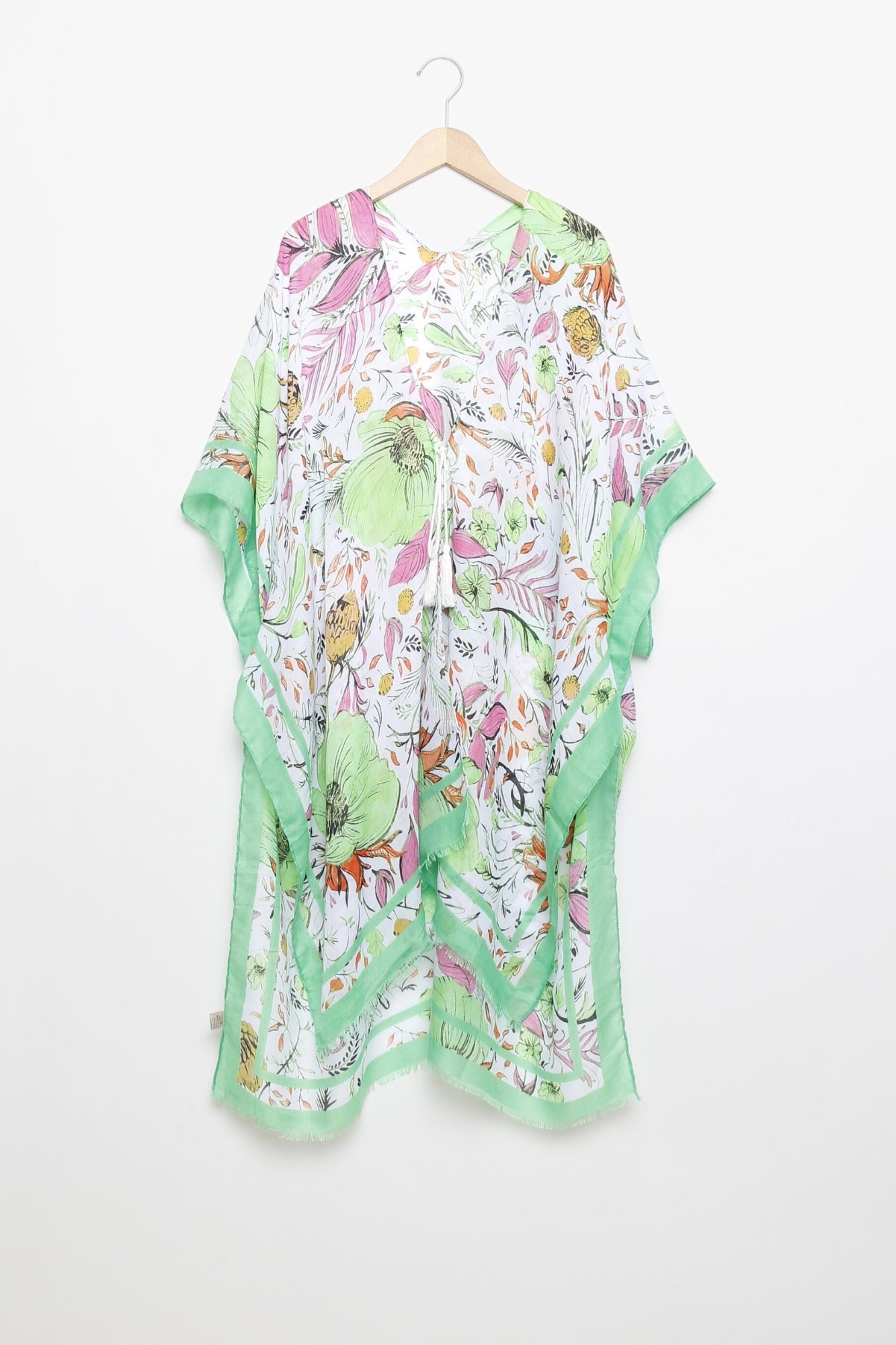Kimono fluido estampado. Cuello pico. Manga corta. Talla única.