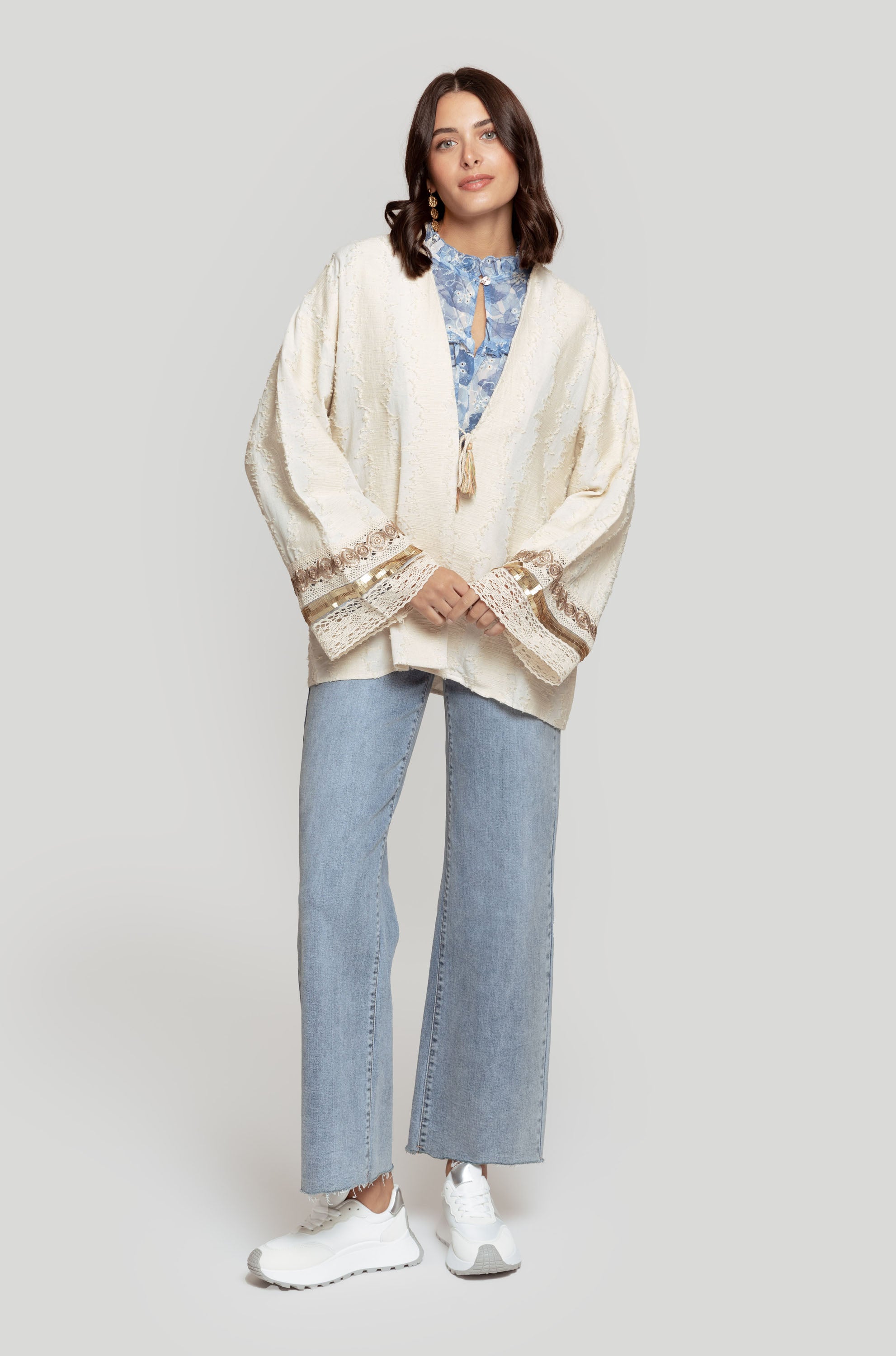 Tejido de mezcla lino y algodón. Tejido con textura en hilos sin rematar. Diseño oversize. Diseño kimono. Diseño recto. Cuello redondo. Manga larga. Puño con abalorios. Cierre de tira. Talla única. Altura modelo: 1.75 m.