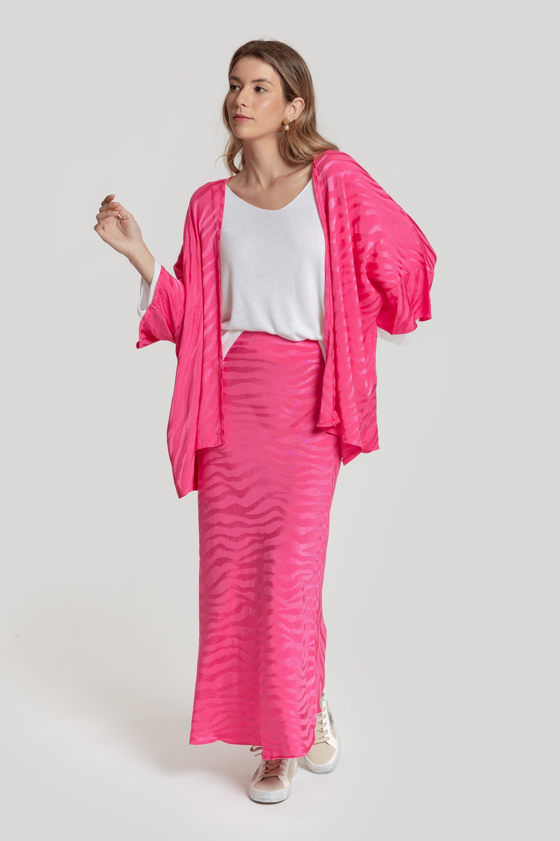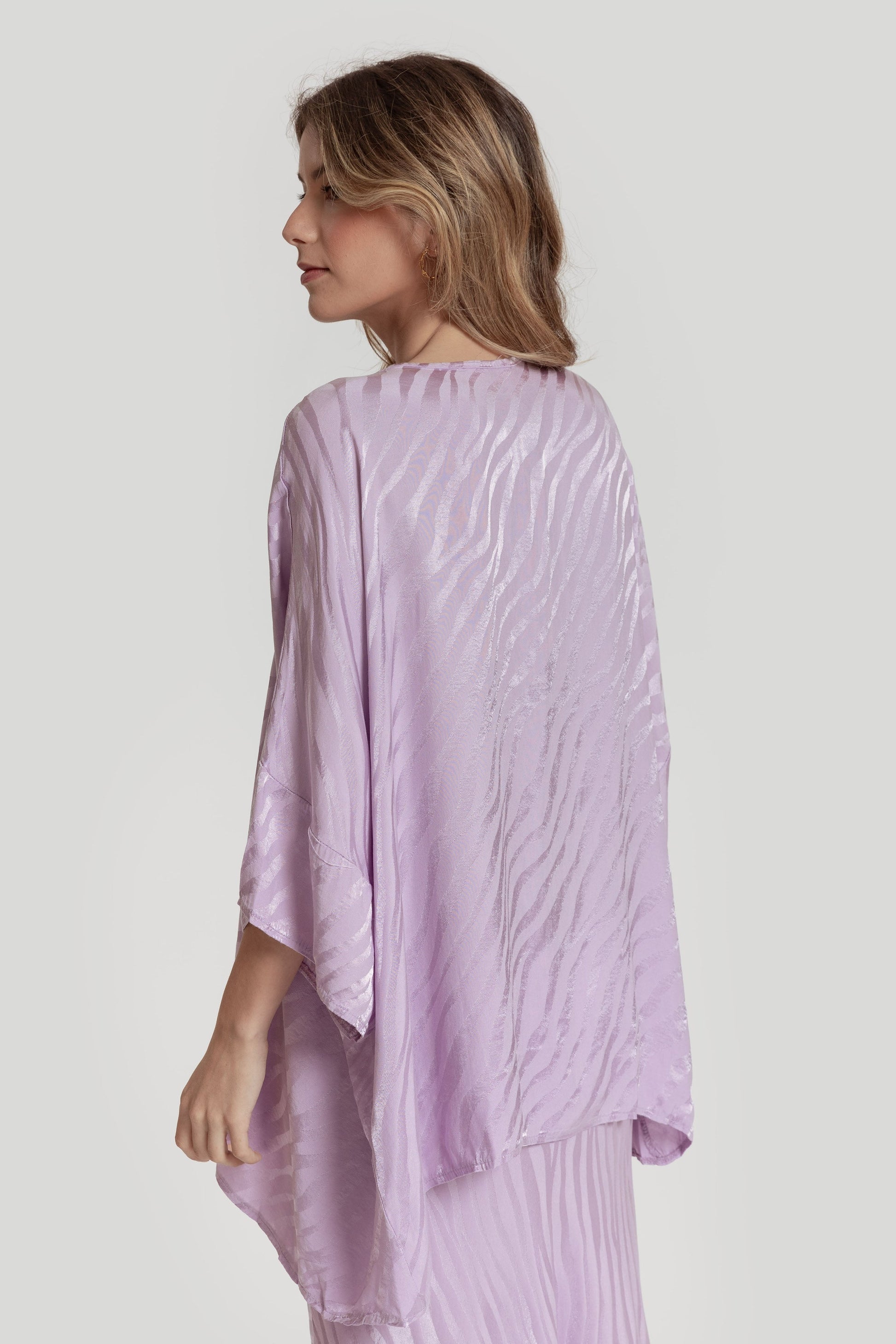 Tejido satinado. Diseño estampado. Cuello chimenea. Manga tres cuarto. Manga acampanada. Sin cierre. Talla modelo: S. Altura modelo 1,70 m.