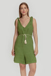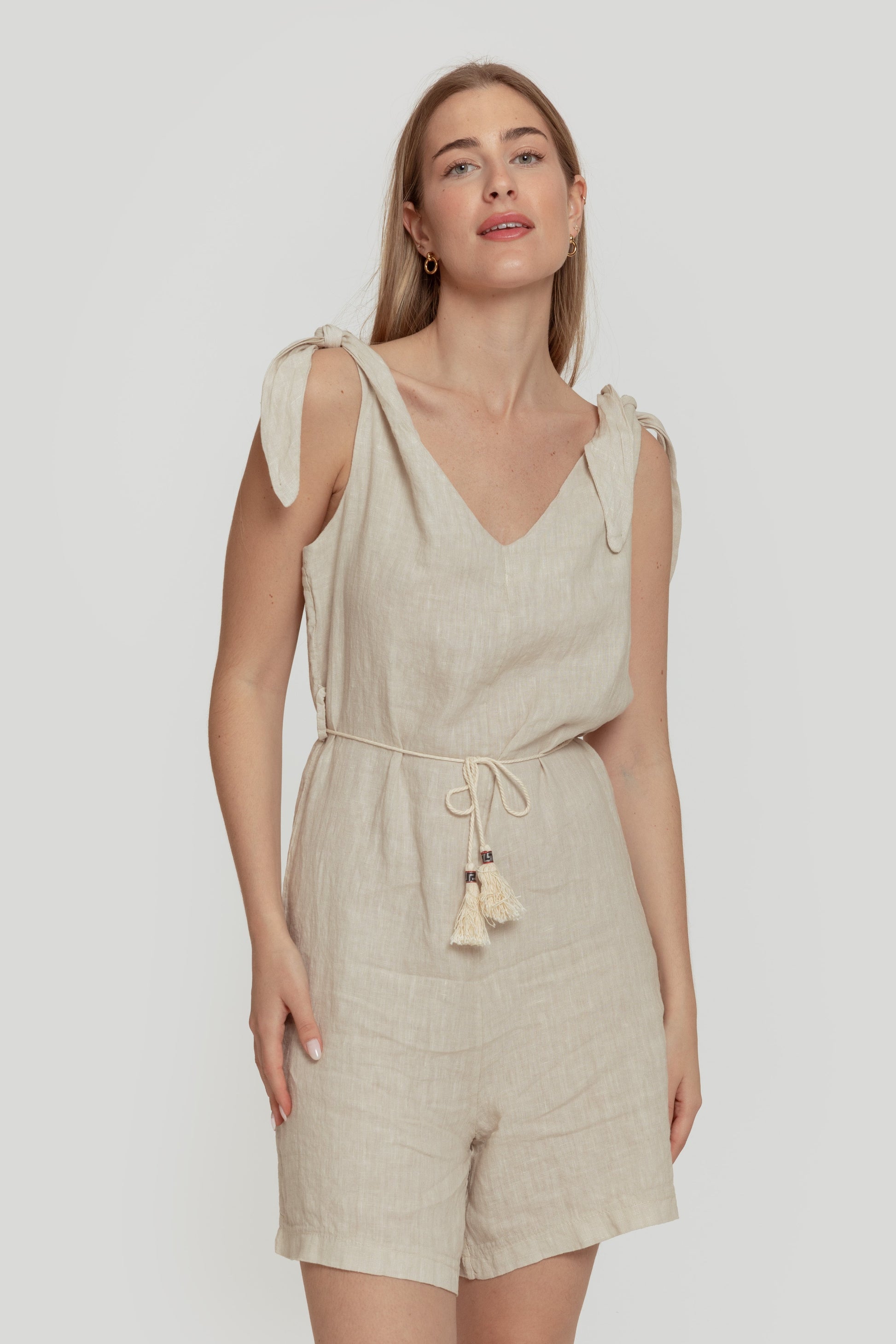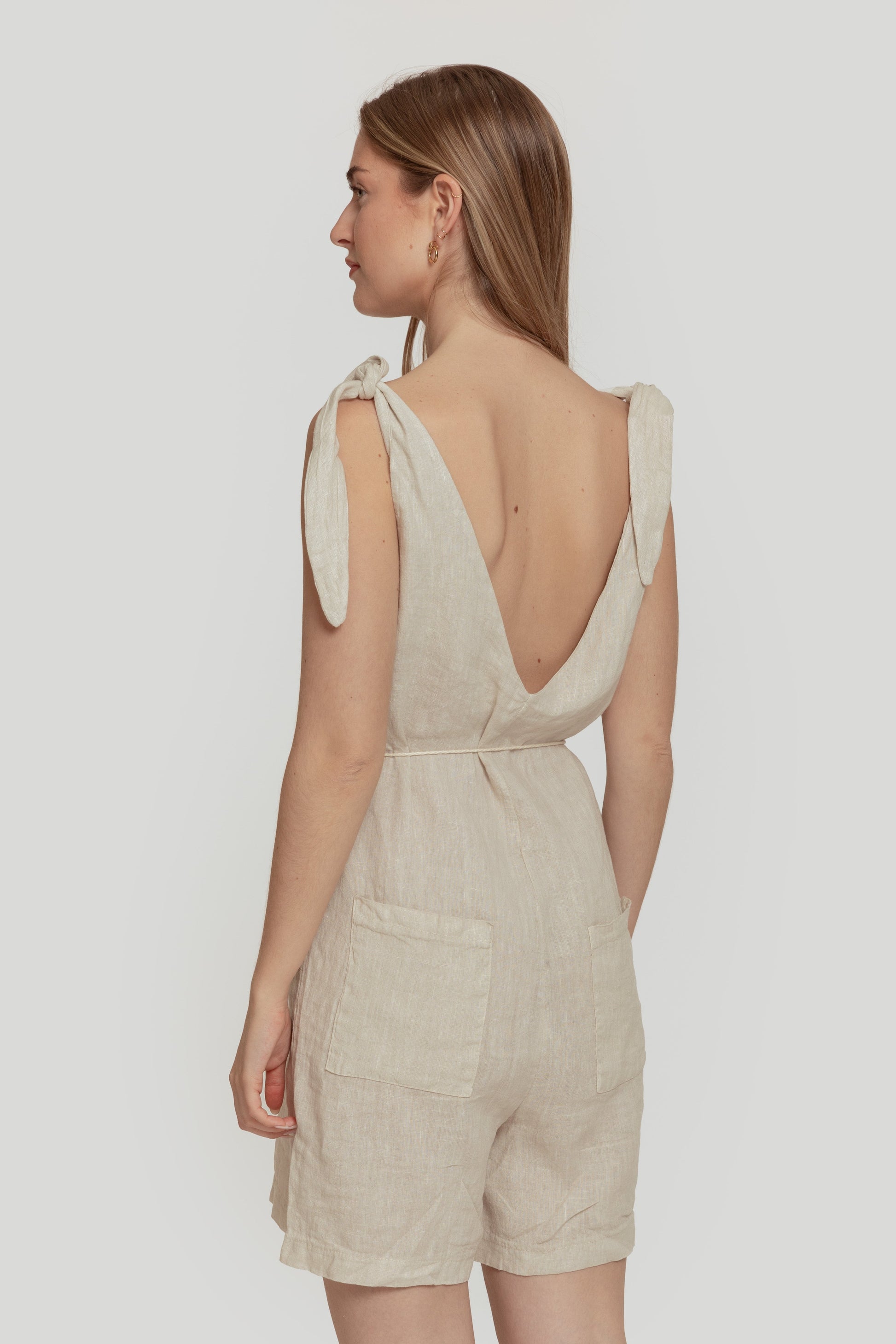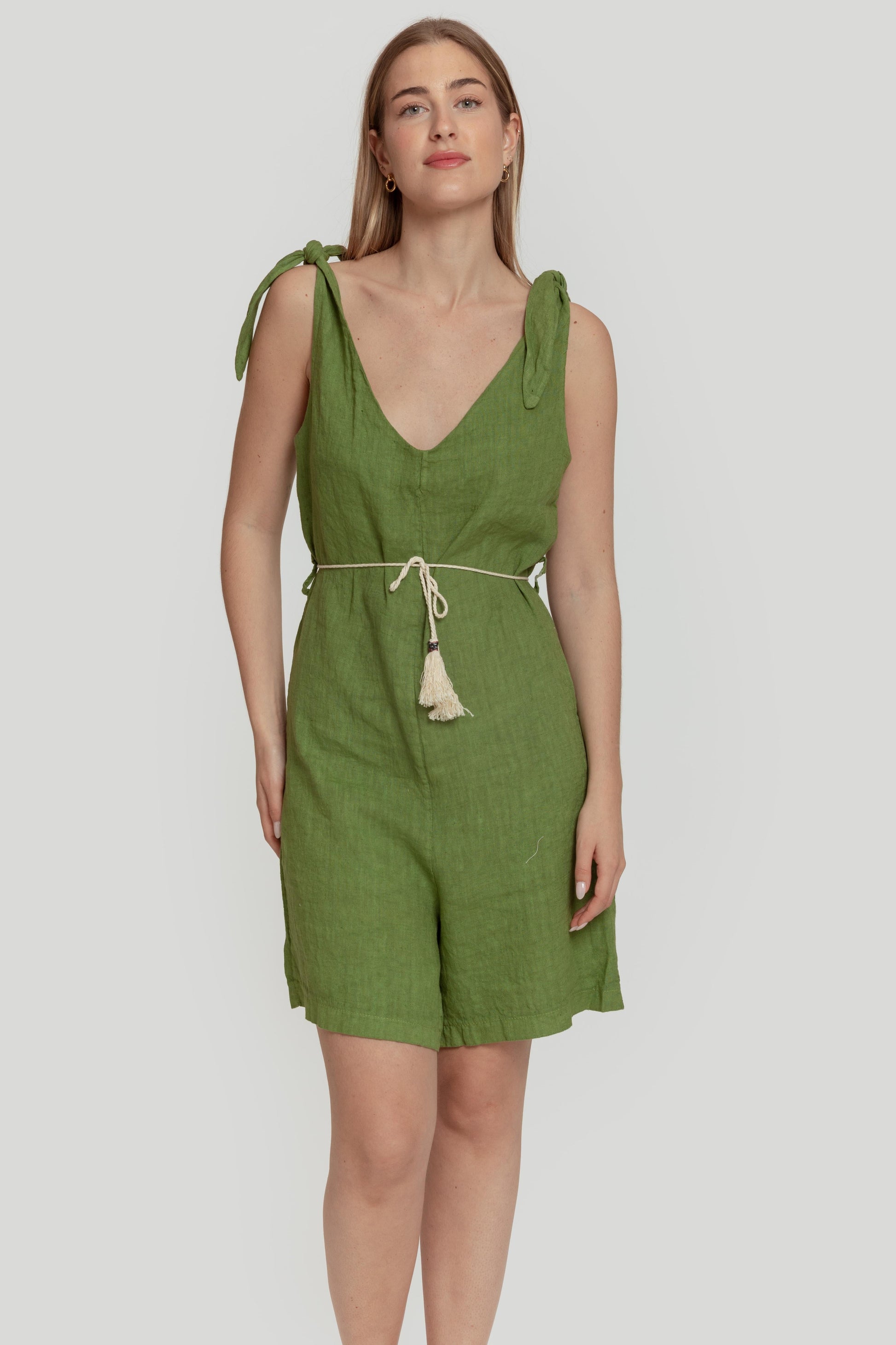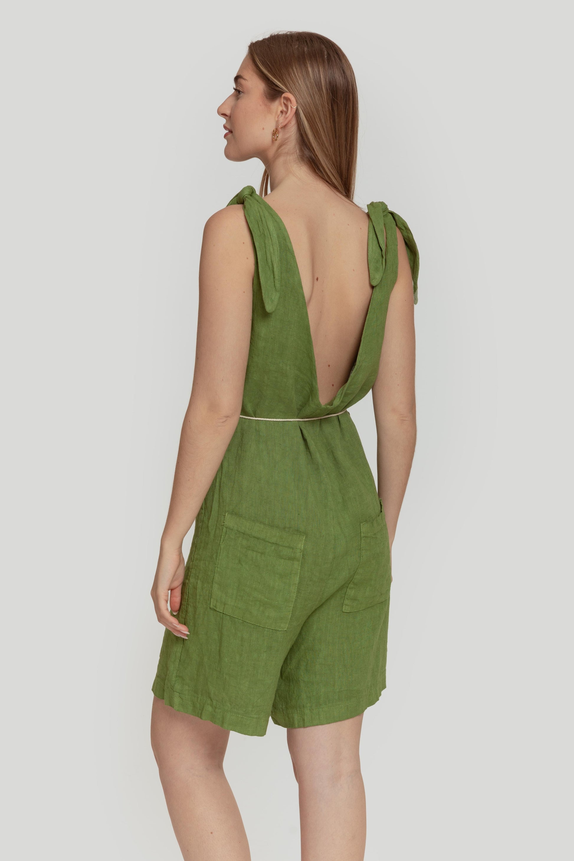 Tejido de lino. Diseño recto. Diseño fluido. Diseño corto. Escote pico. Tirantes con lazada decorativa. Bolsillos de parche. Cinturón de cordón. Trabillas. Talla modelo: S. Altura modelo: 1.70m.