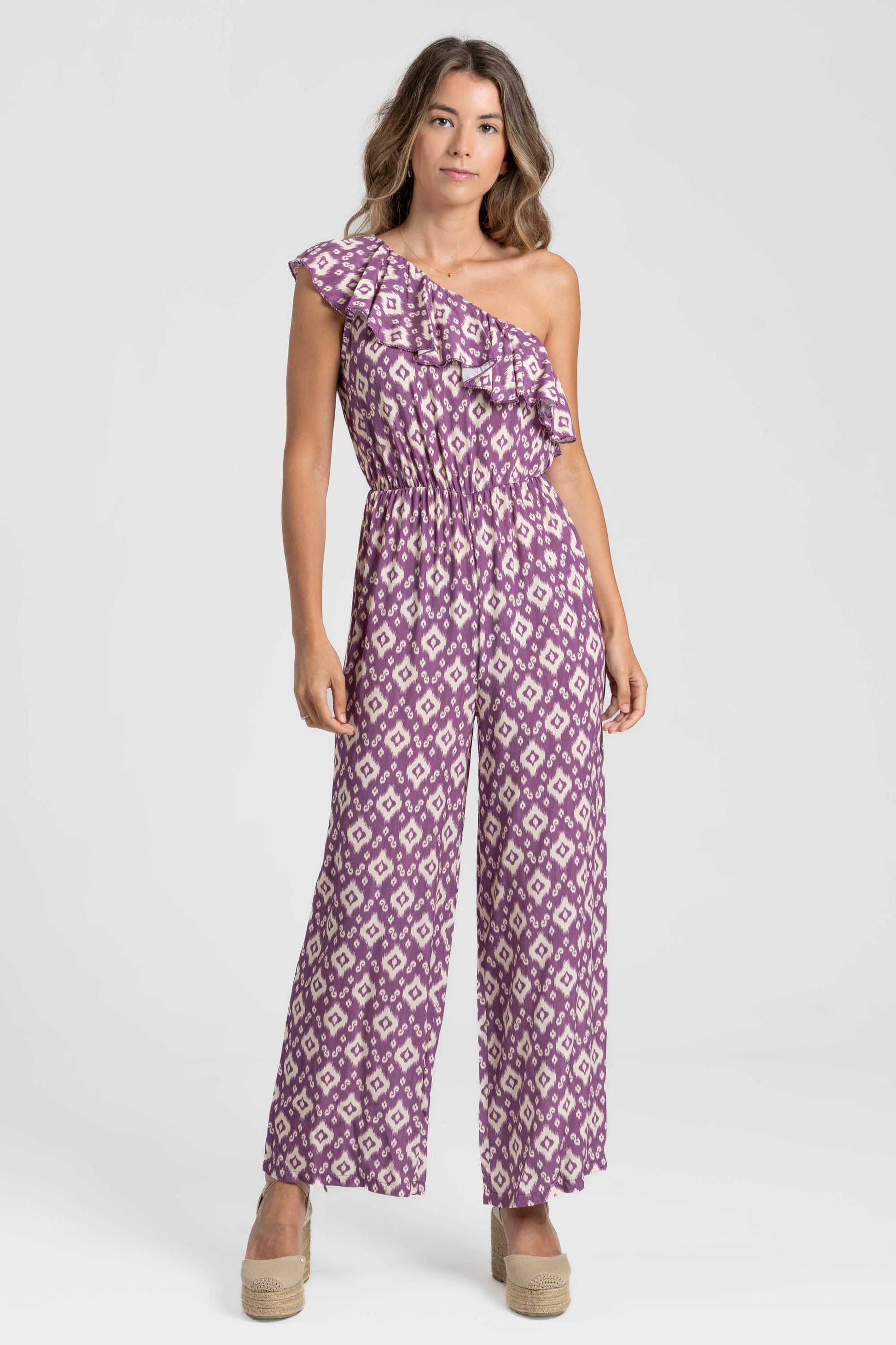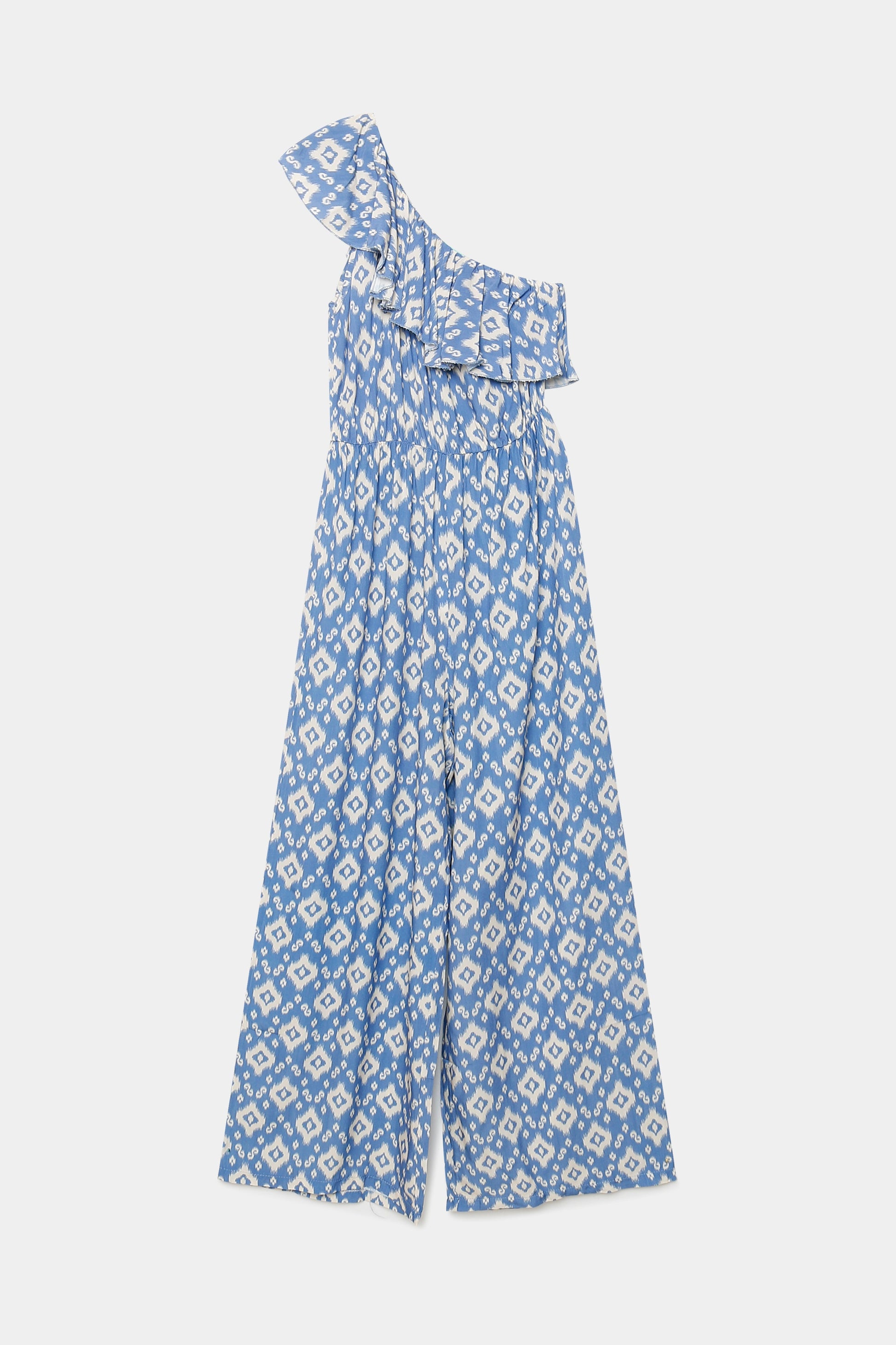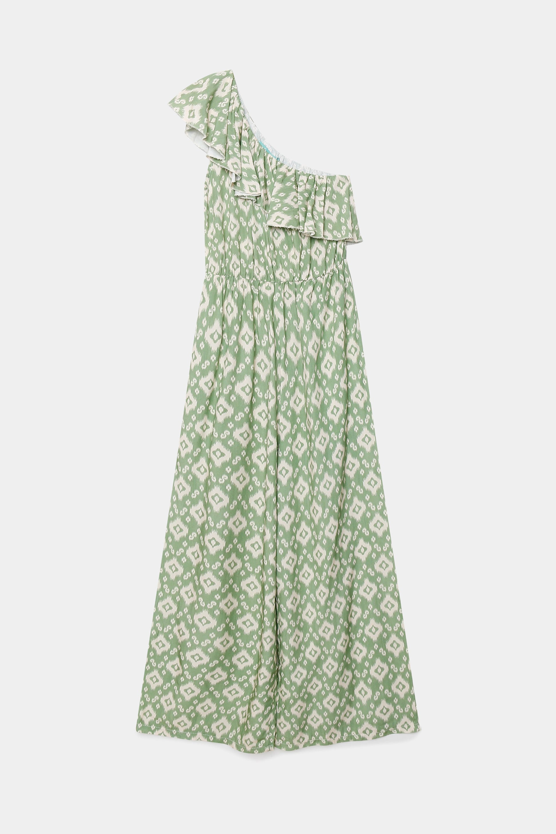 Tejido fluido. Diseño largo. Diseño recto. Escote asimetrico. Detalle volantes. Cinturilla elástica. Talla modelo: S. Altura modelo 1,70 m.