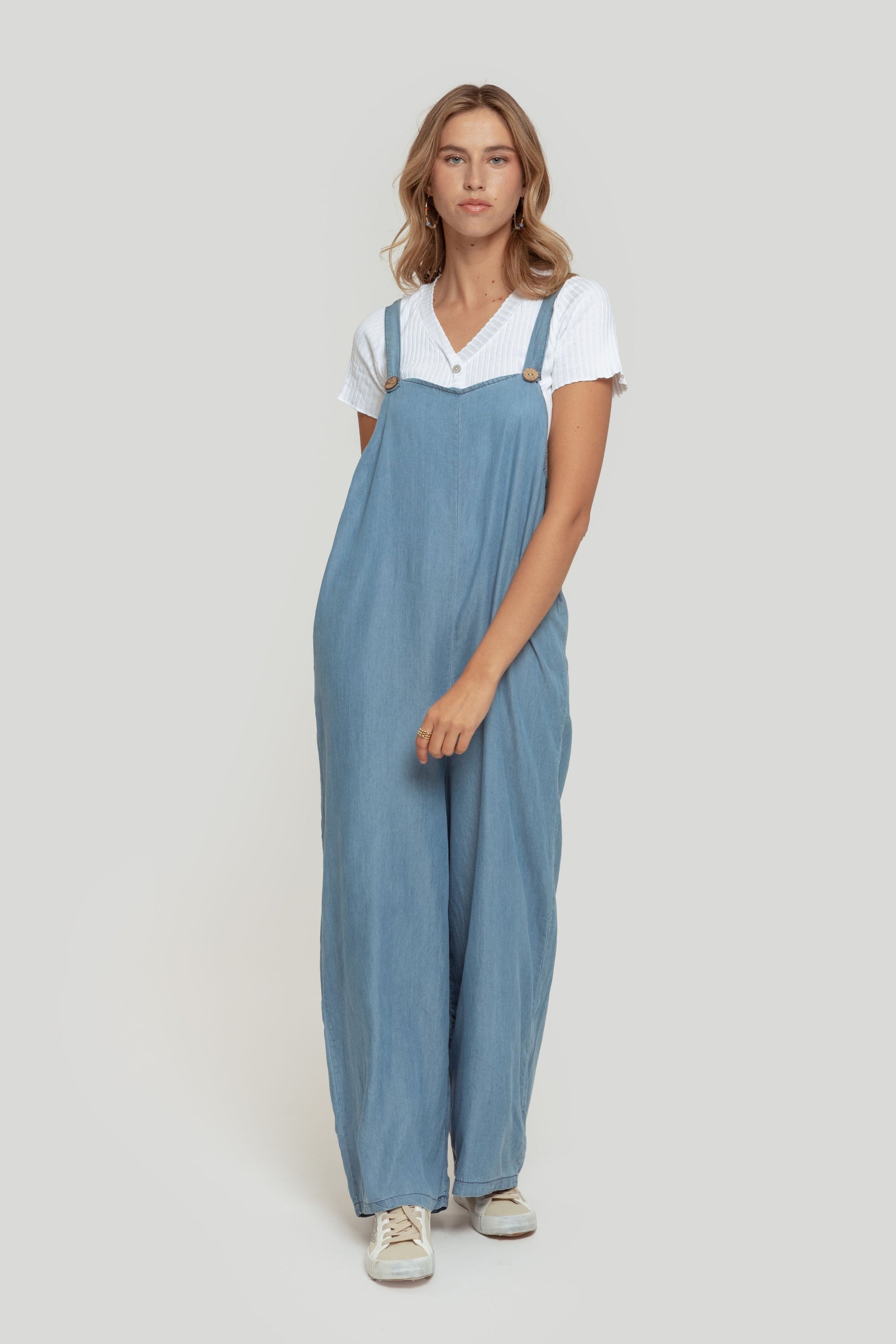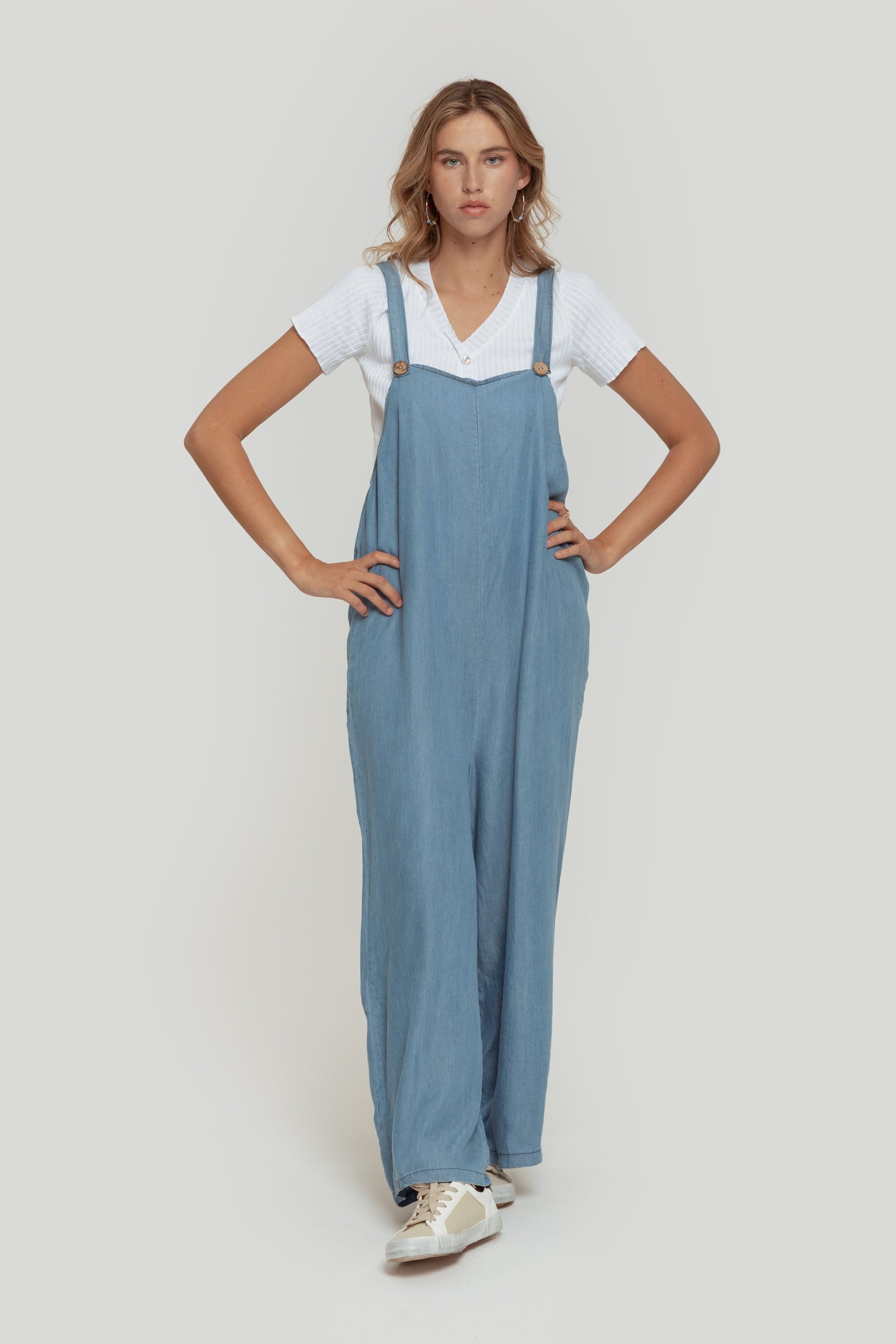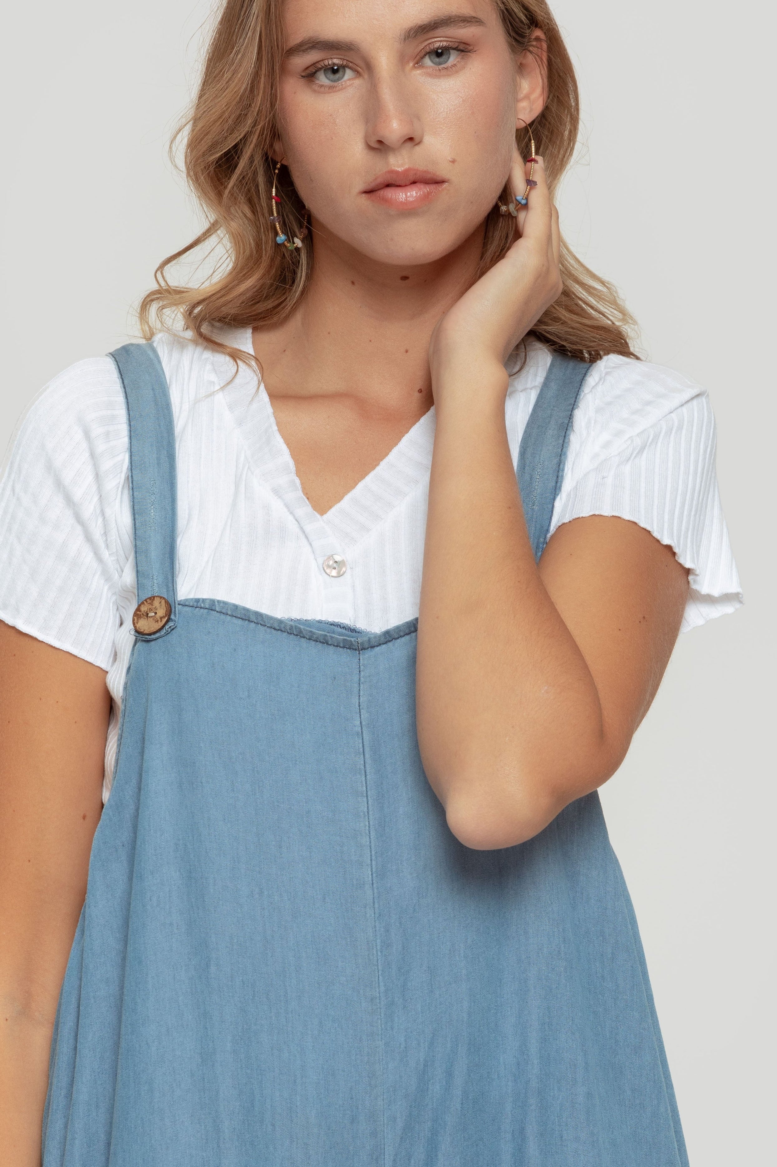 Tejido mezcla lino. Diseño recto. Diseño amplio. Diseño largo. Escote cuadrado. Tirantes abotonados. Talla modelo: S. Altura modelo 1,70 m.