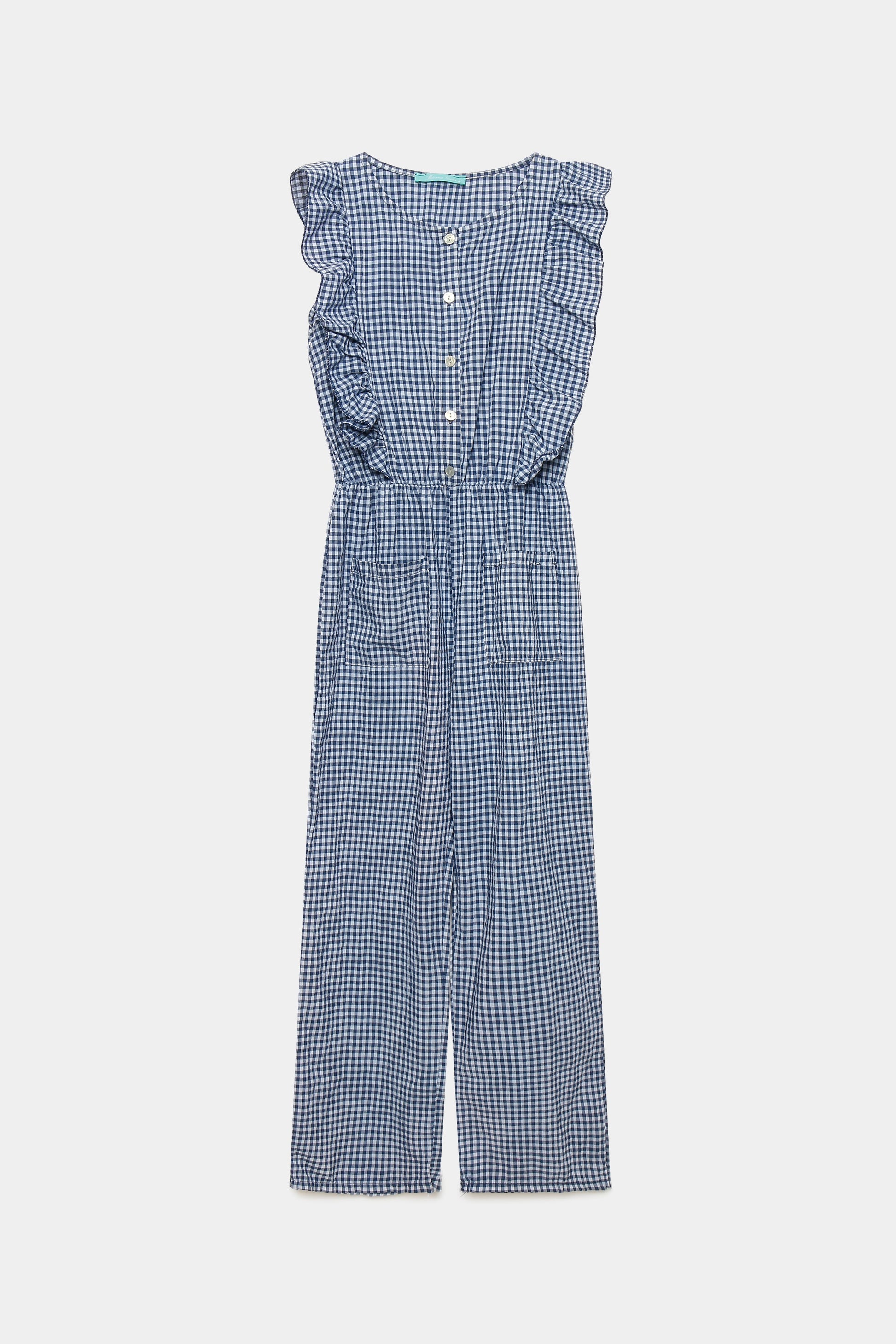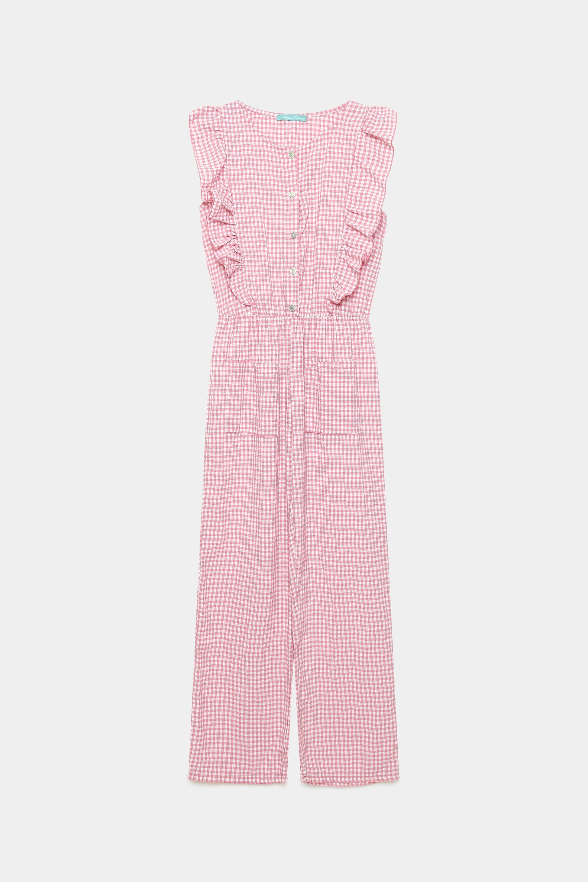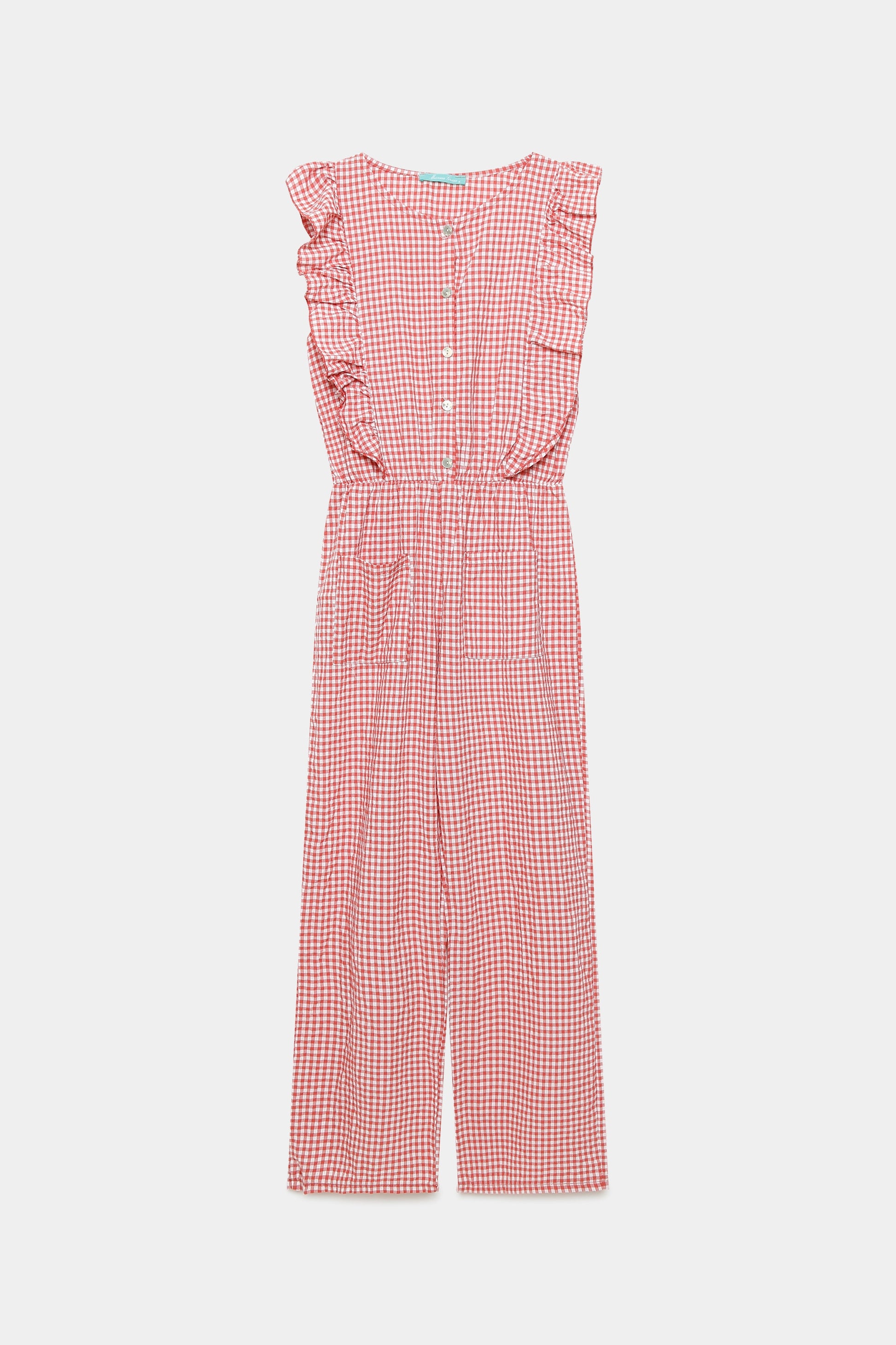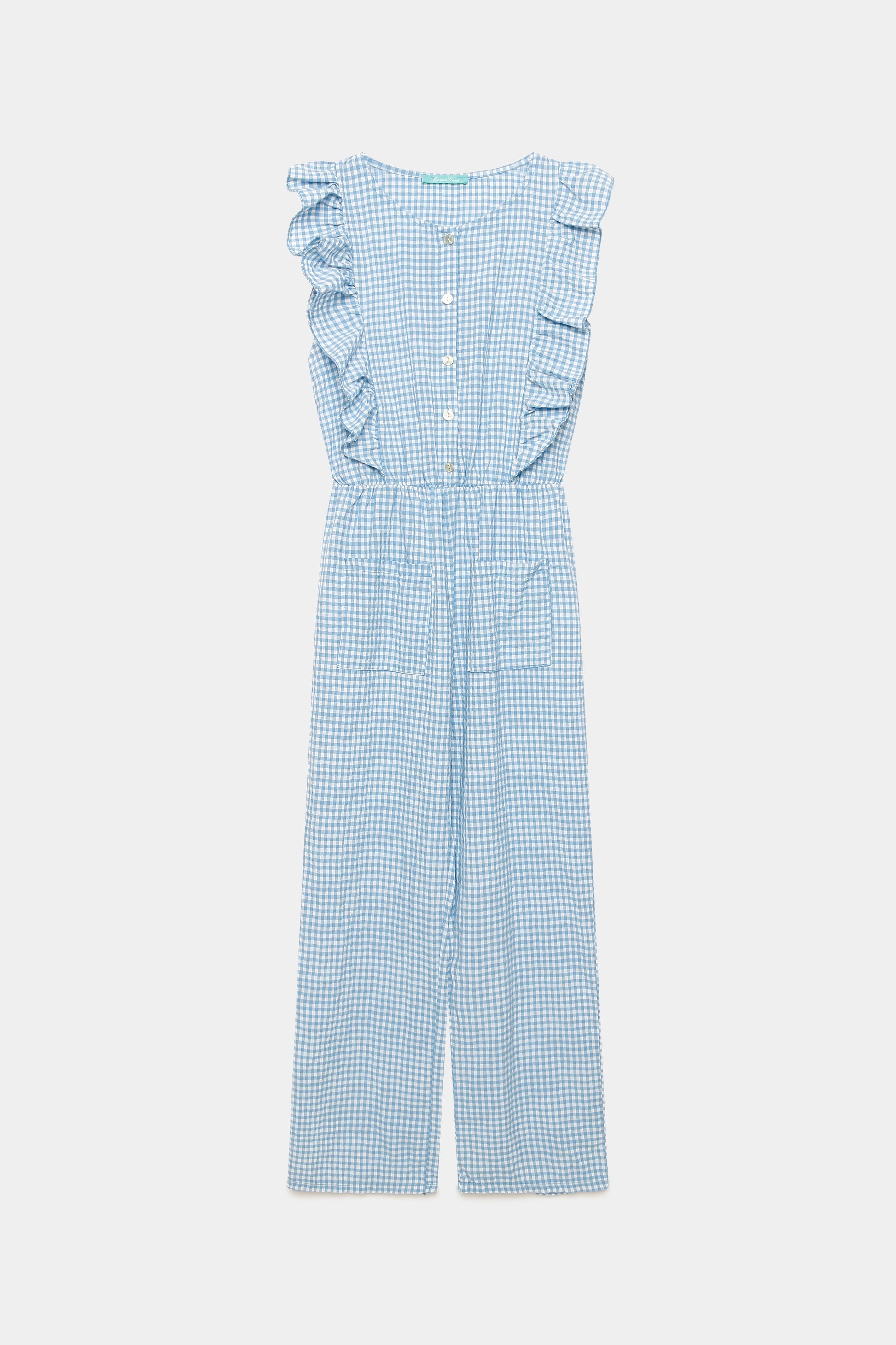 Tejido mezcla de algodón. Diseño estampado vichy. Diseño recto. Escote redondo. Cierre frontal botones. Bolsillos frontal. Cintura elástica.