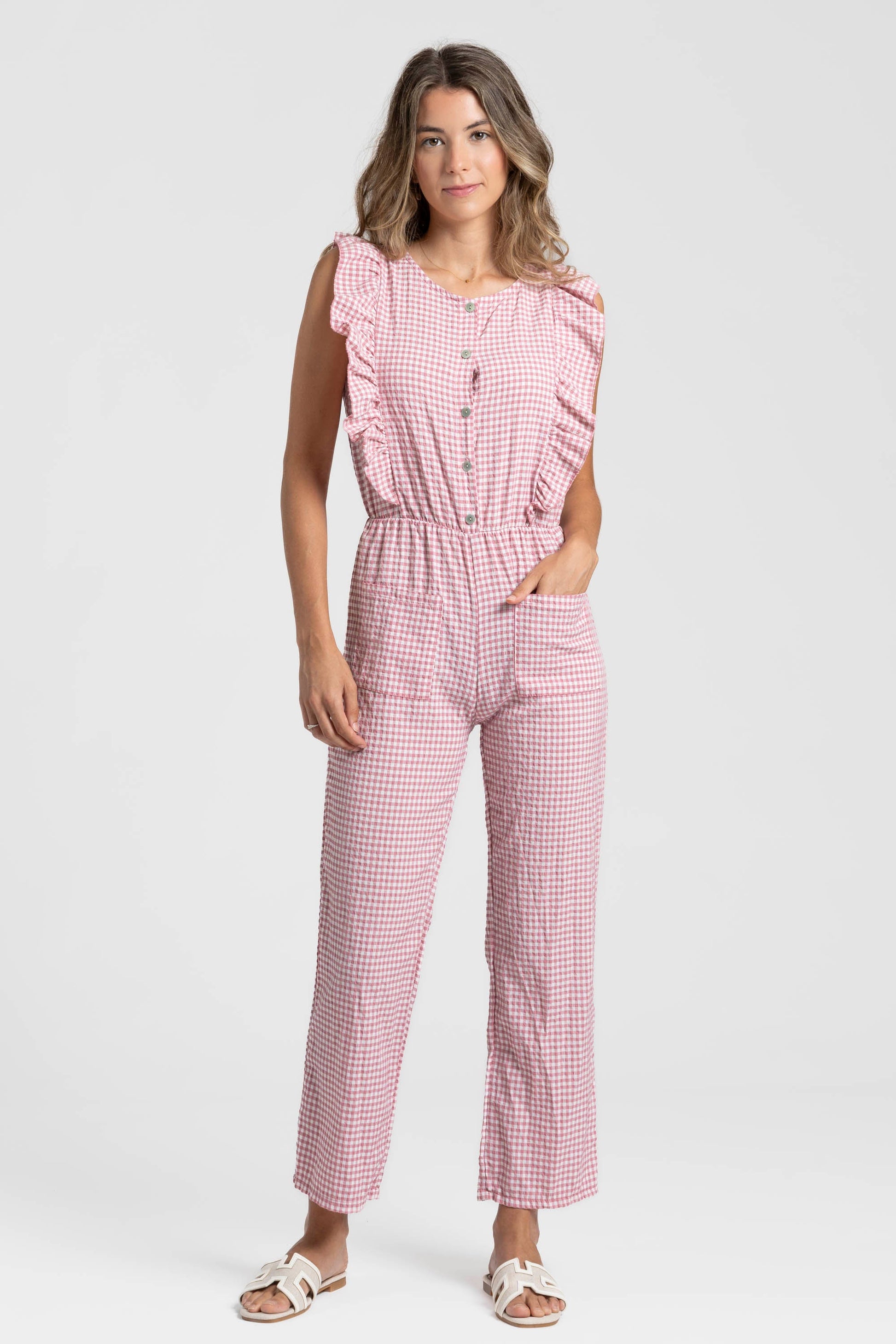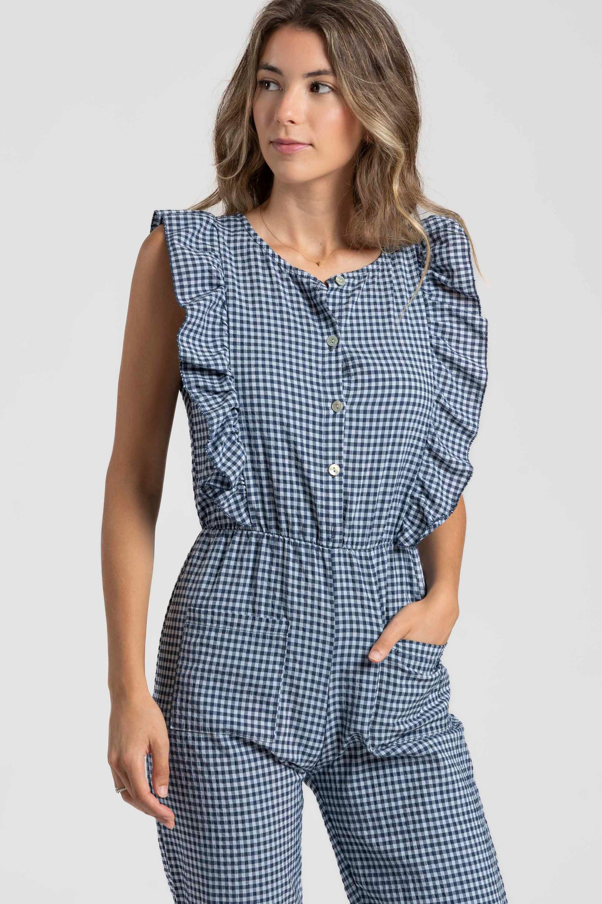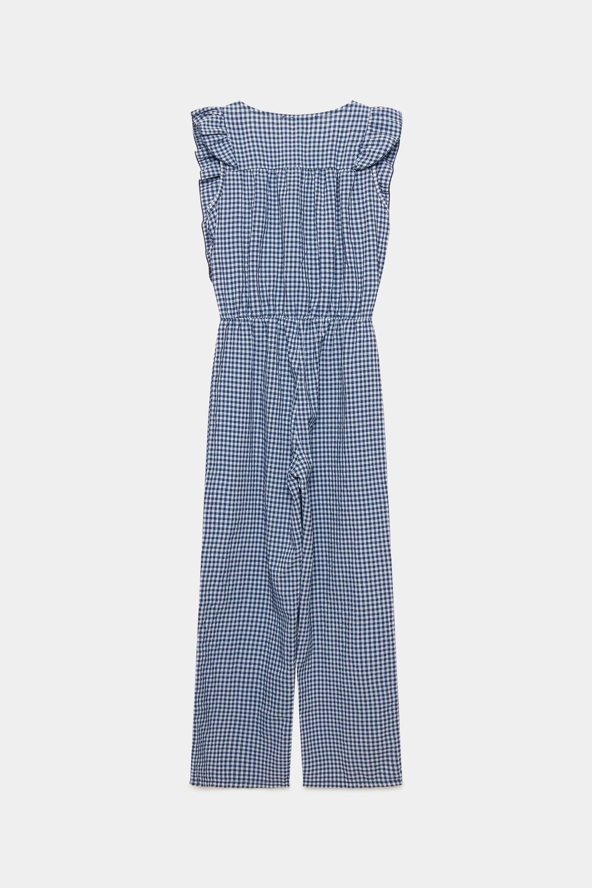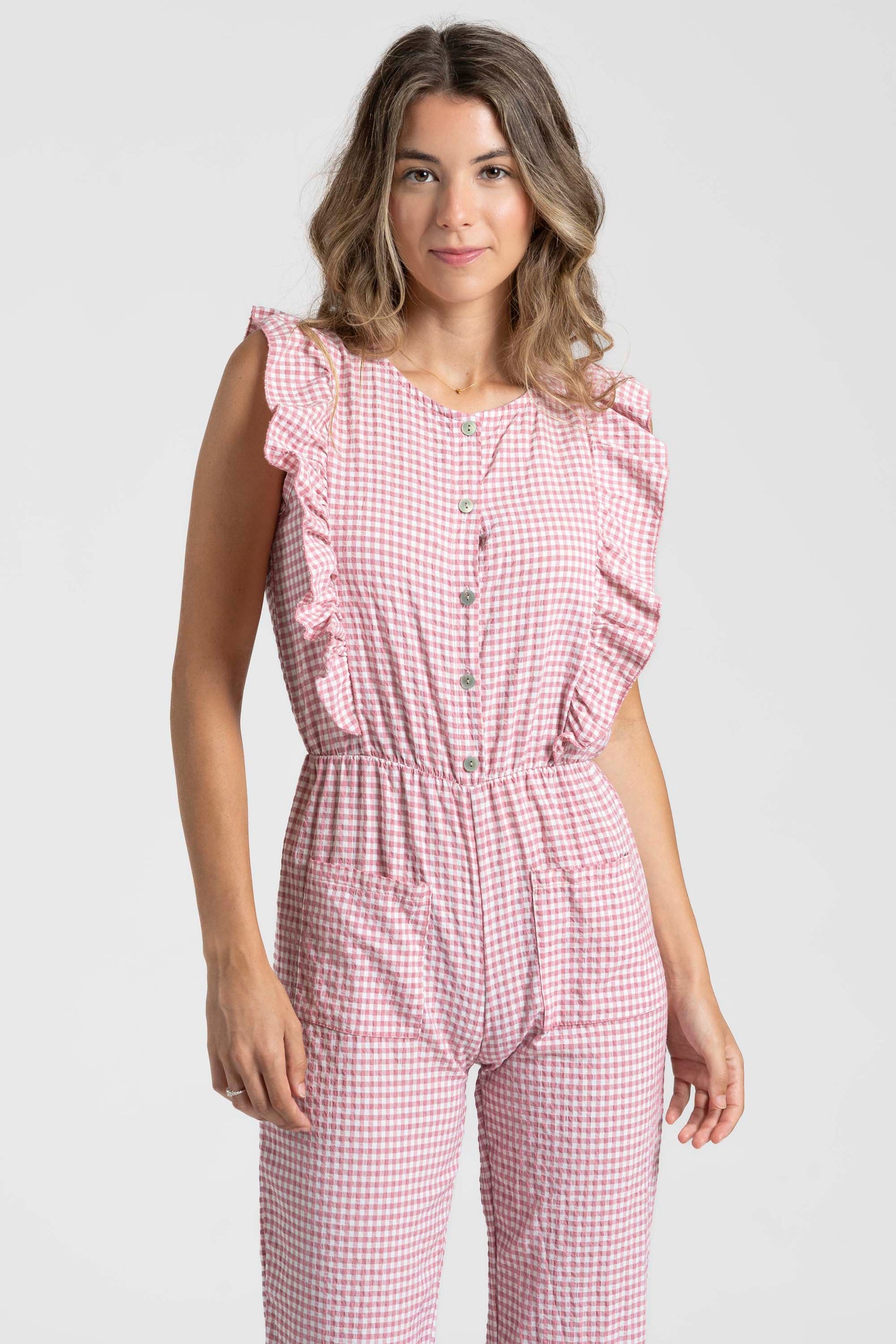 Tejido mezcla de algodón. Diseño estampado vichy. Diseño recto. Escote redondo. Cierre frontal botones. Bolsillos frontal. Cintura elástica.