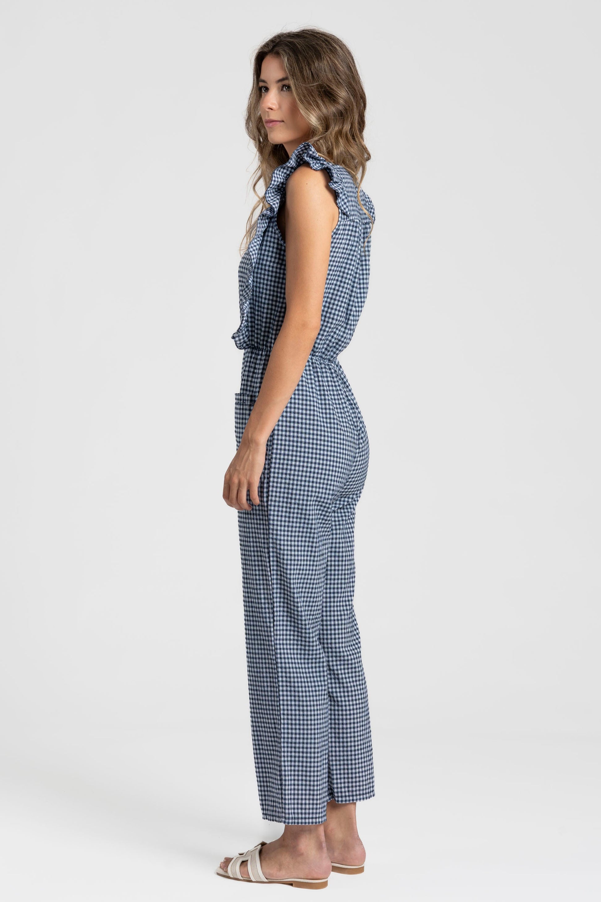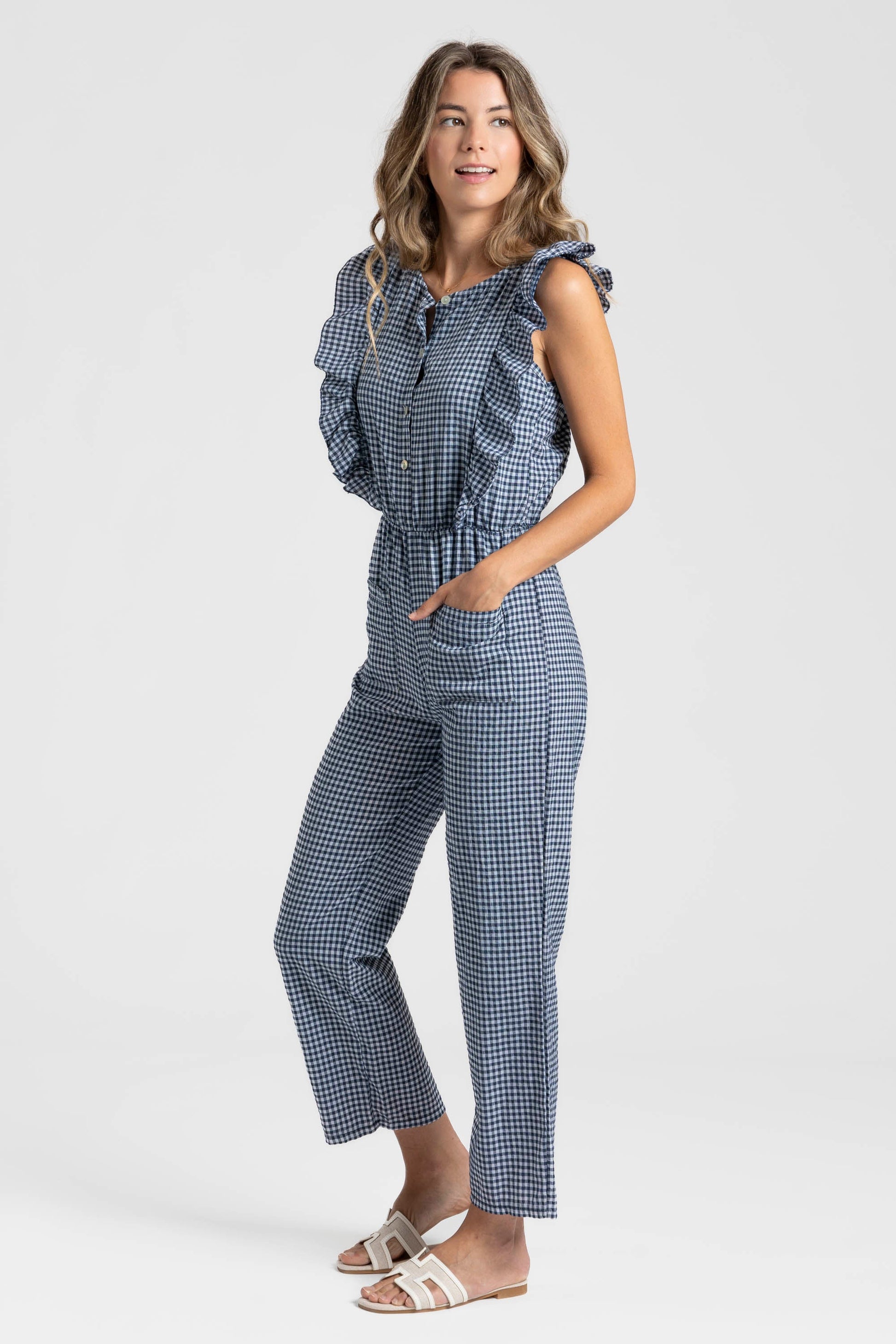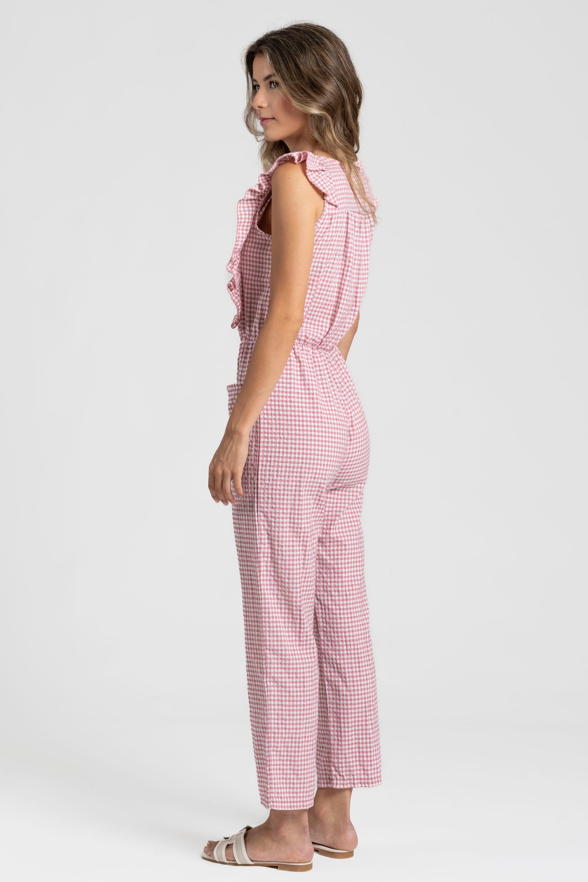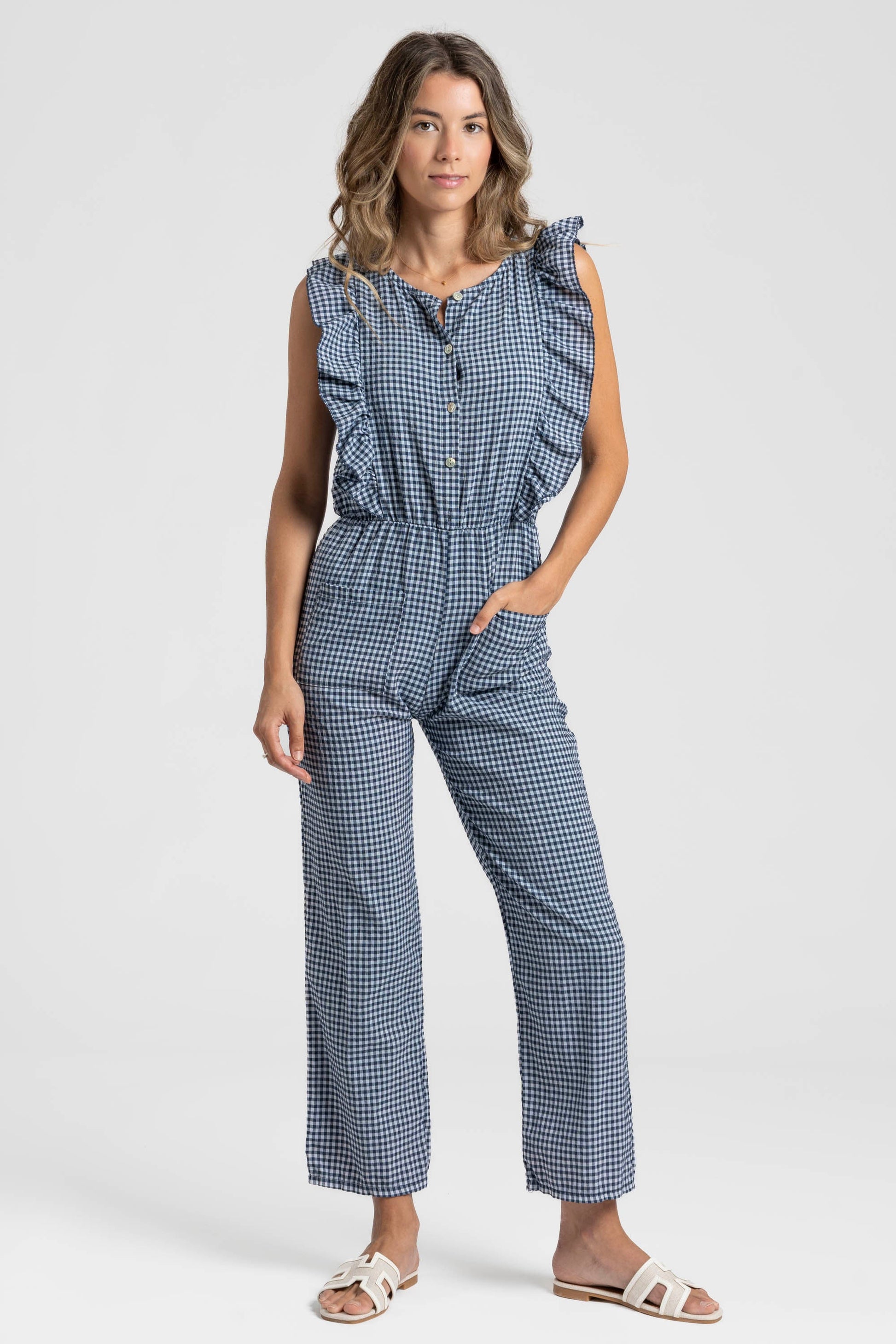 Tejido mezcla de algodón. Diseño estampado vichy. Diseño recto. Escote redondo. Cierre frontal botones. Bolsillos frontal. Cintura elástica.