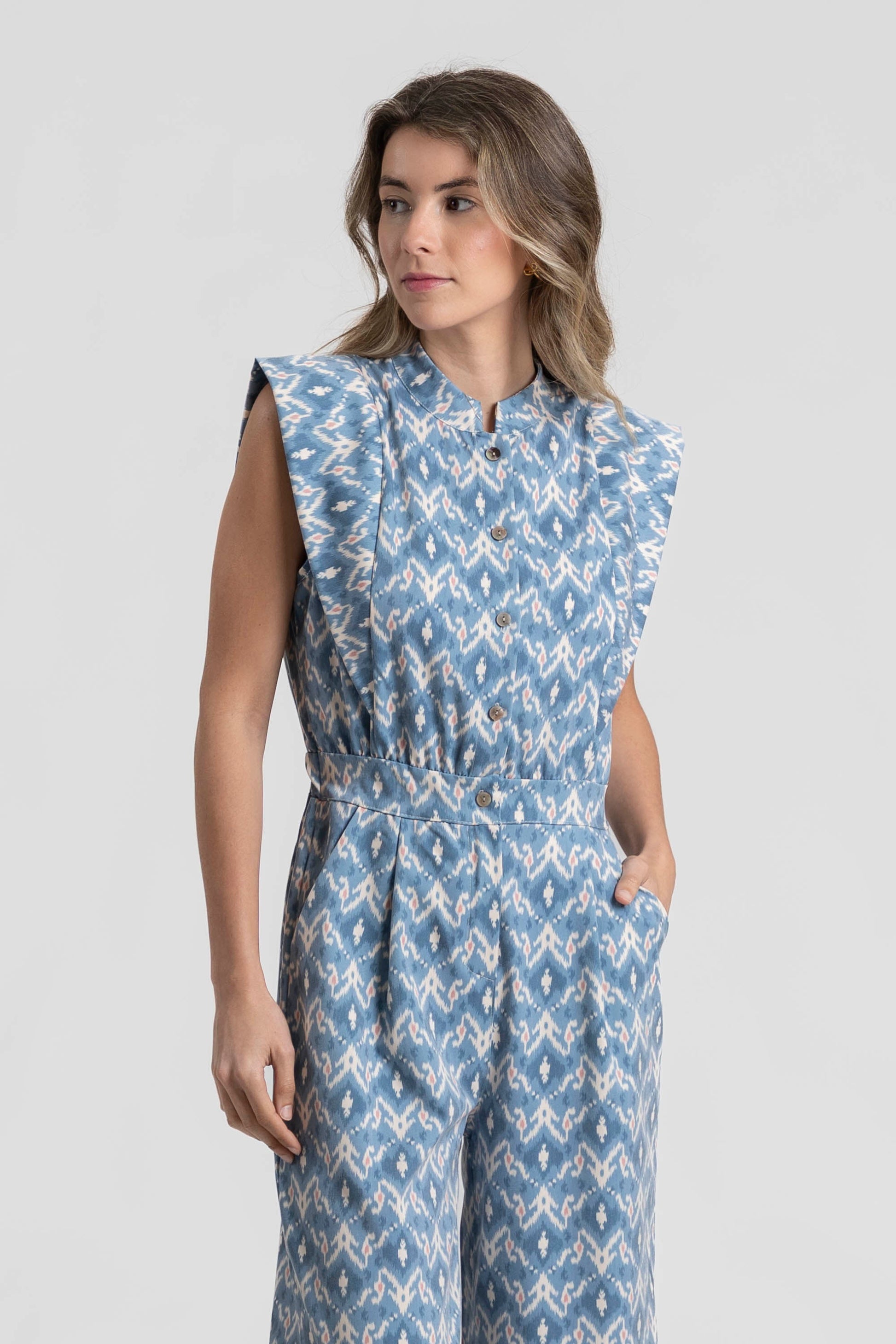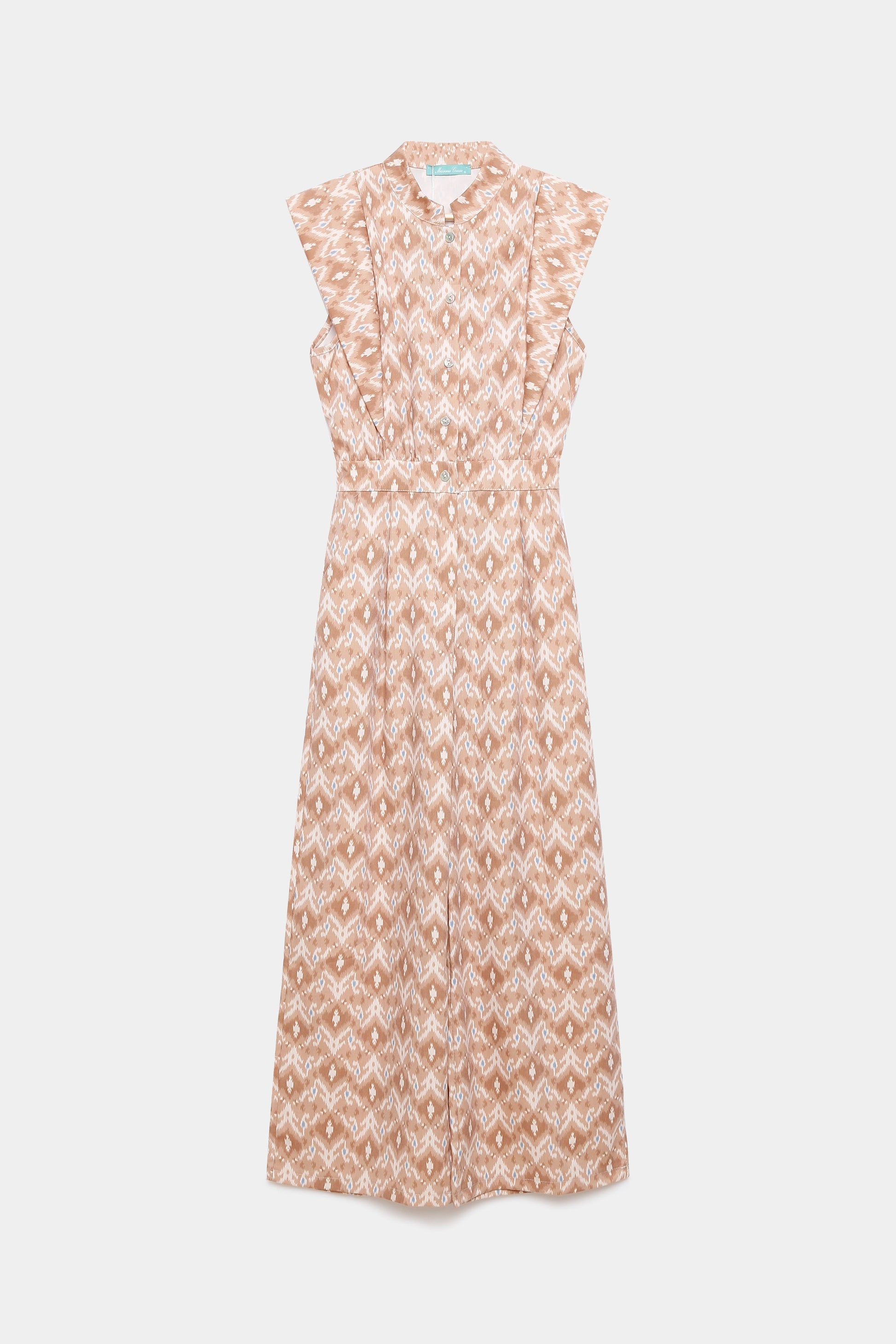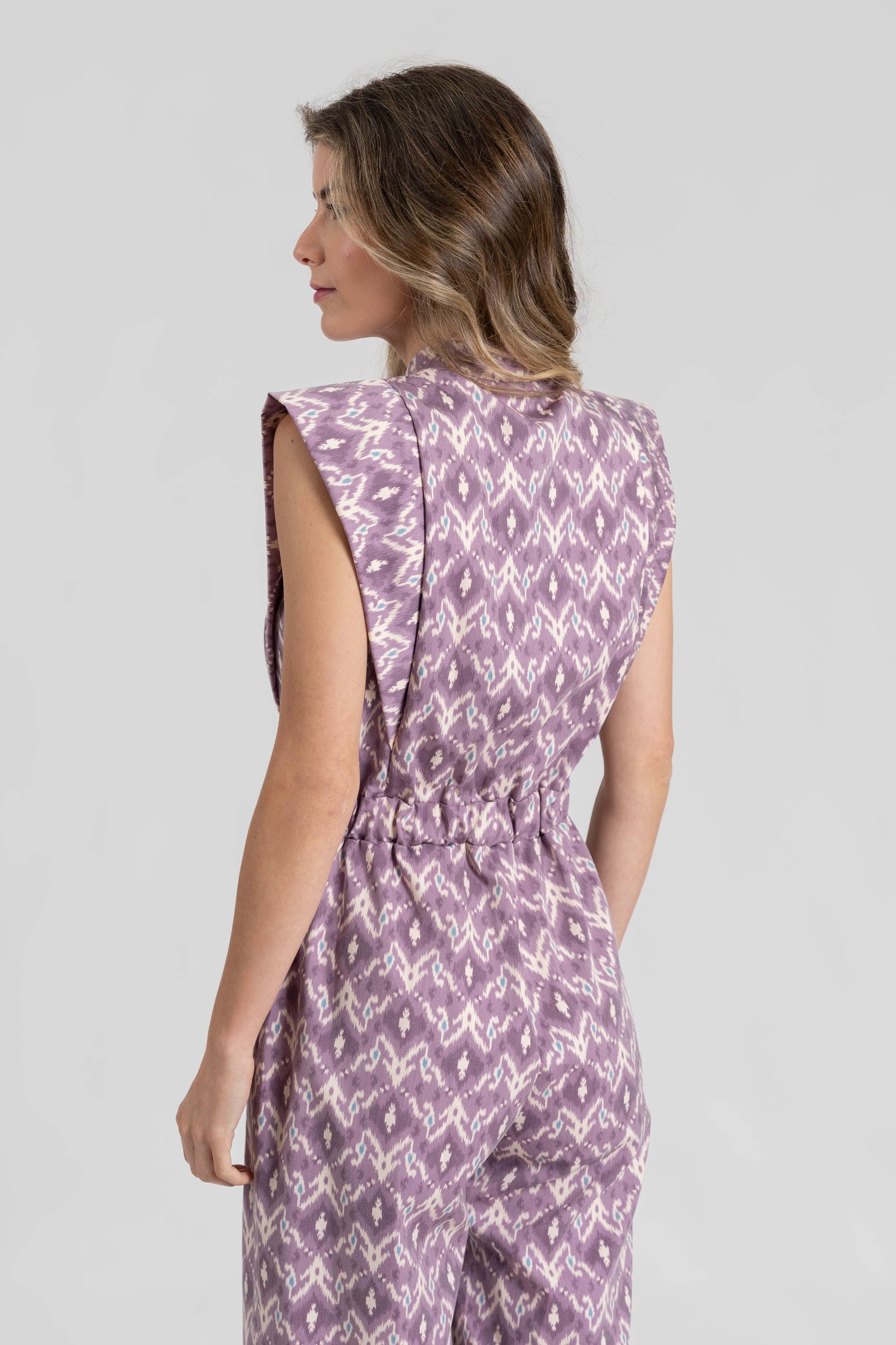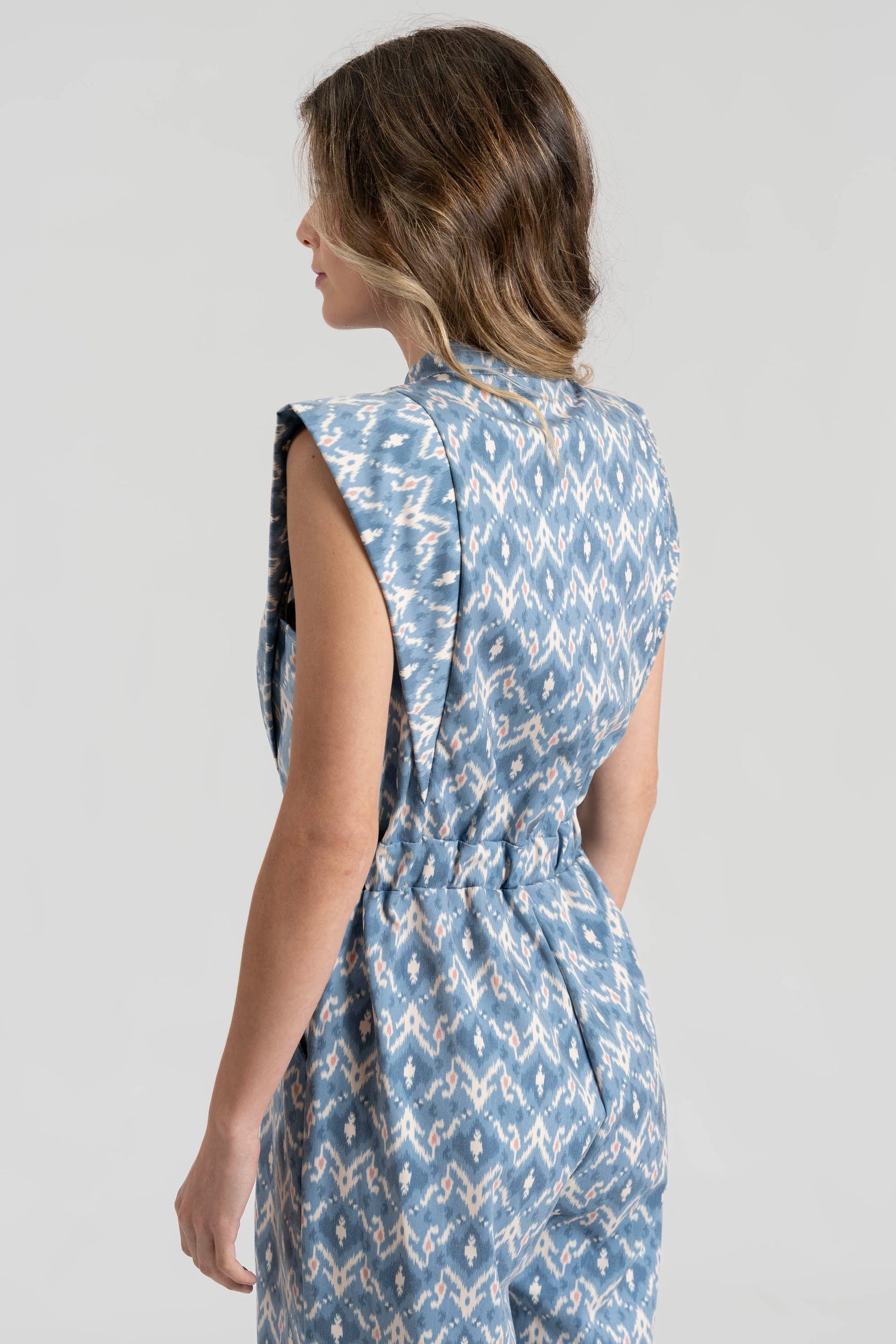 Tejido fluido. Diseño estampado. Diseño largo. Diseño recto. Manga sisa. Bolsillos laterales. Elástico trasero. Abotonado en la nuca.