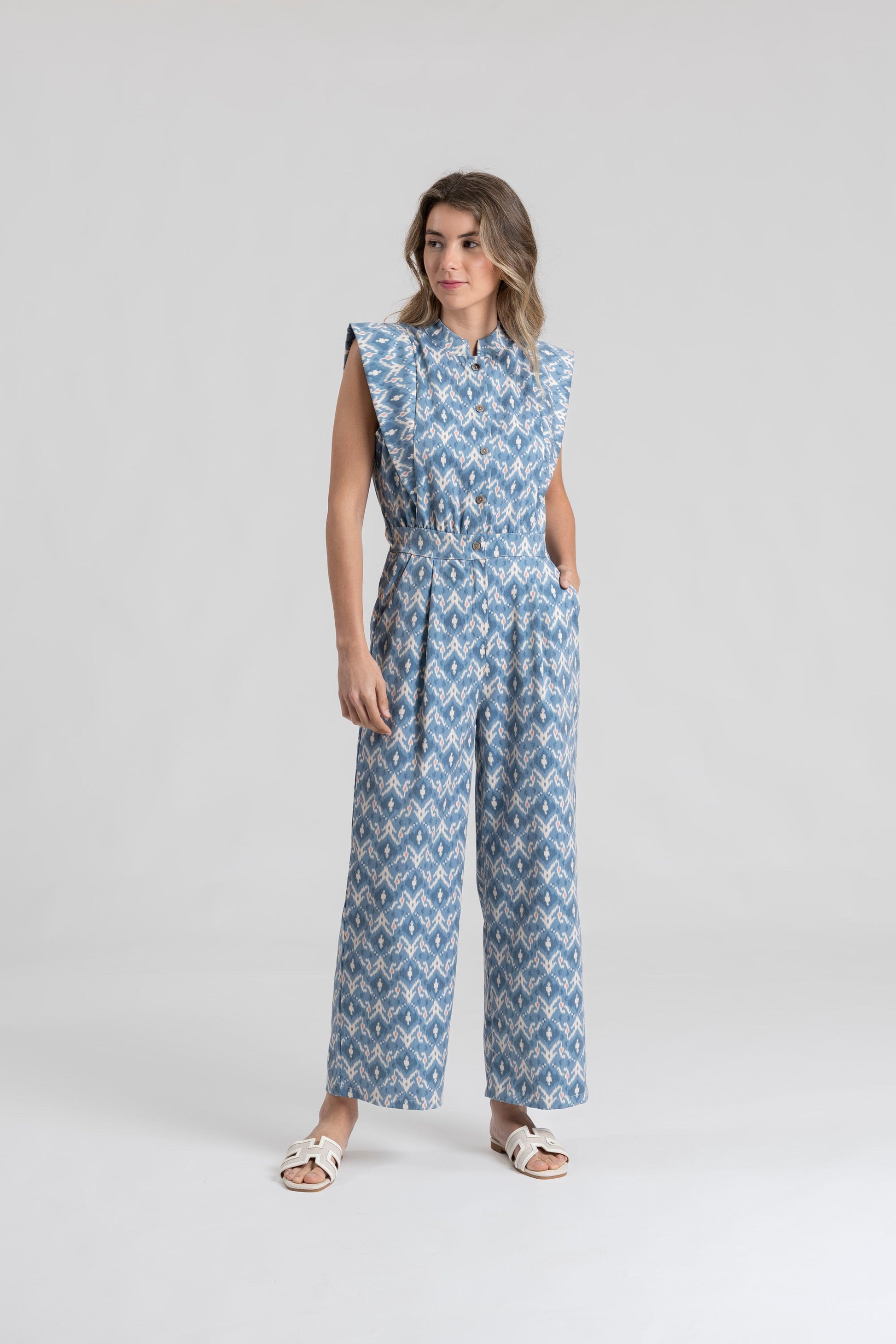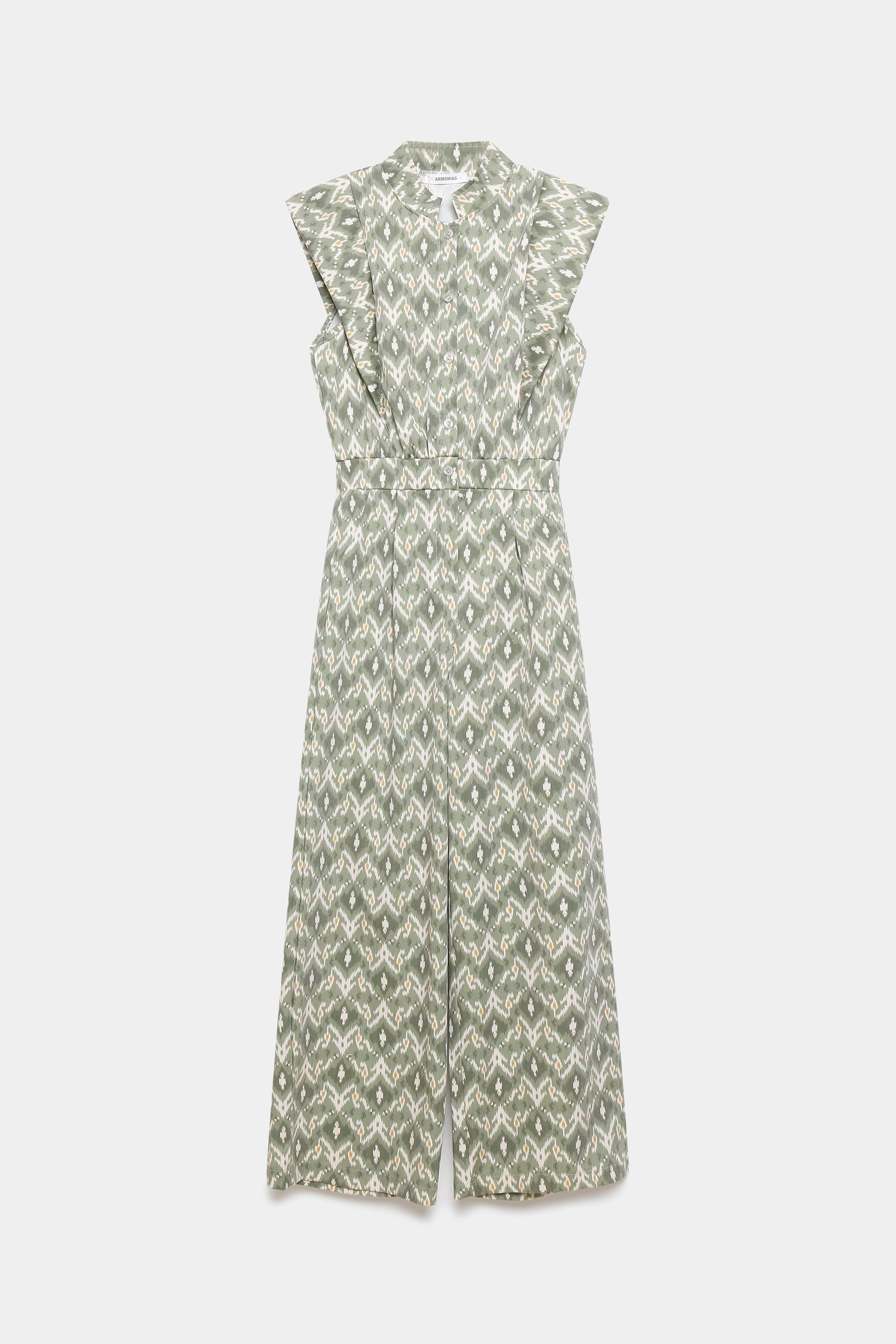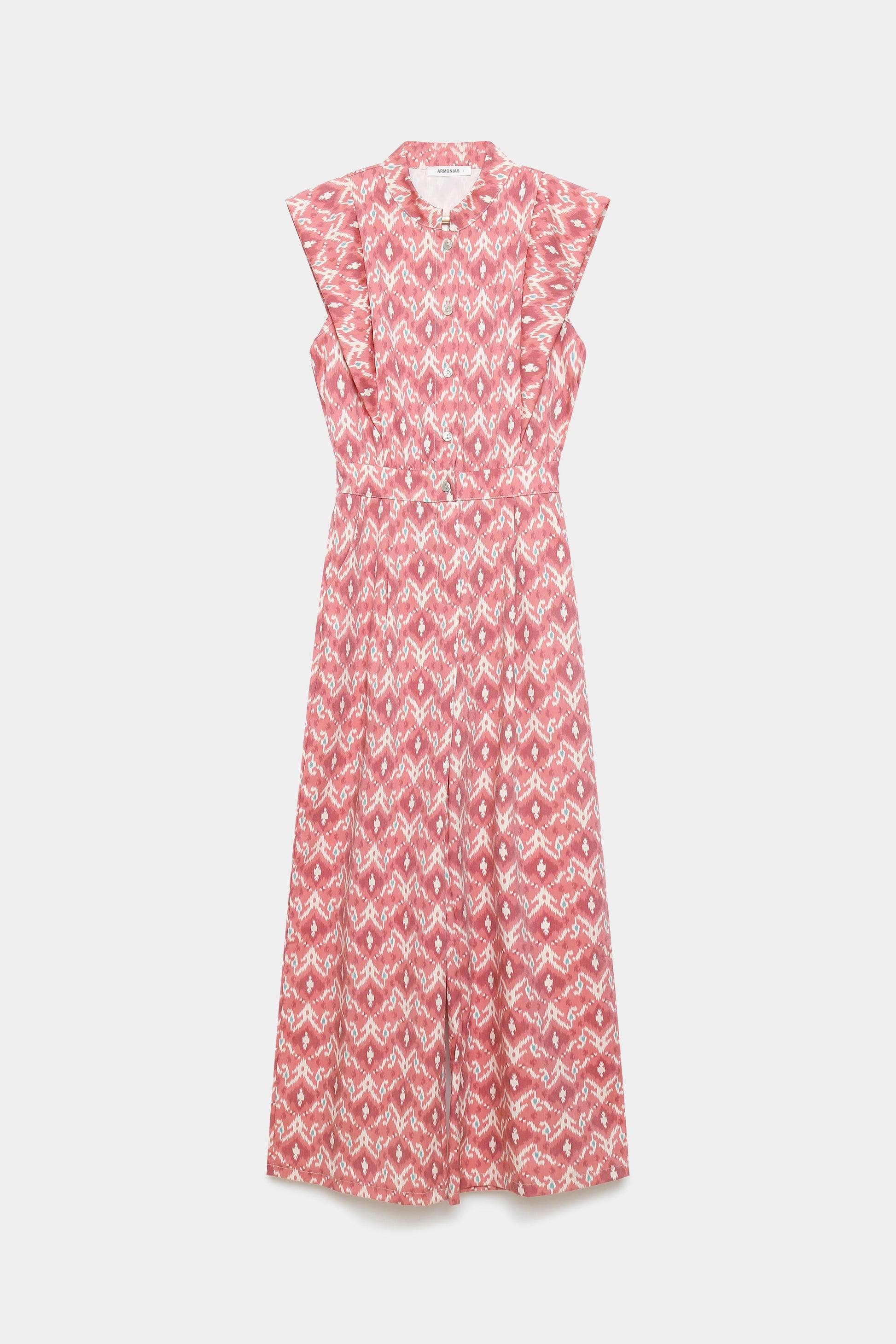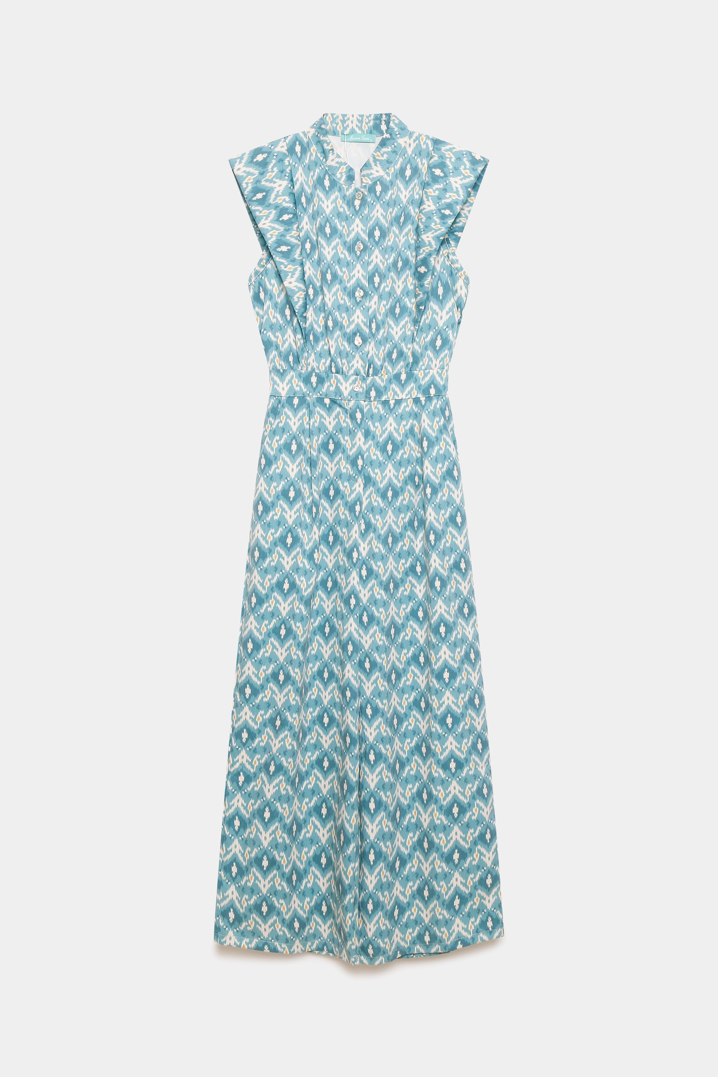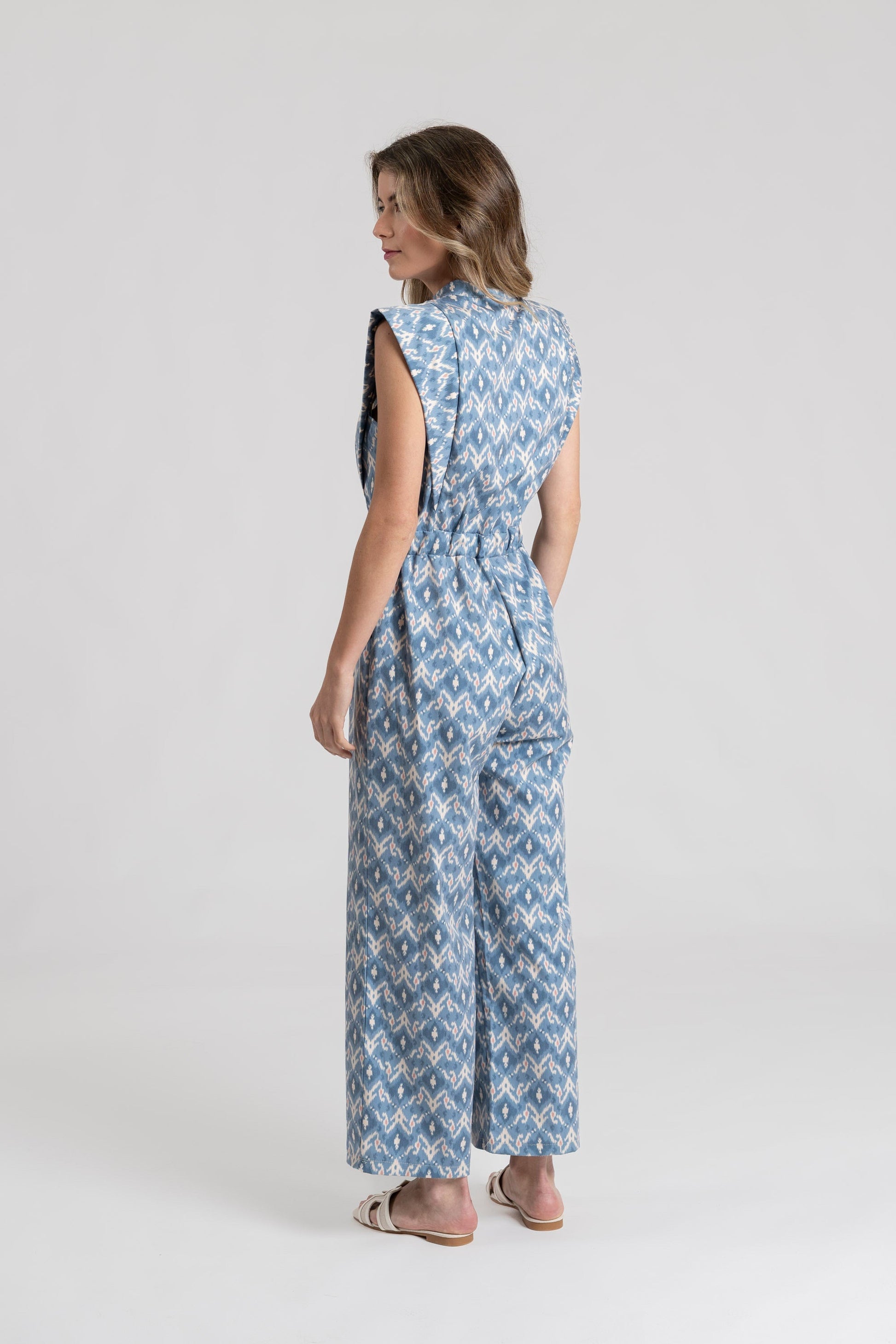 Tejido fluido. Diseño estampado. Diseño largo. Diseño recto. Manga sisa. Bolsillos laterales. Elástico trasero. Abotonado en la nuca.