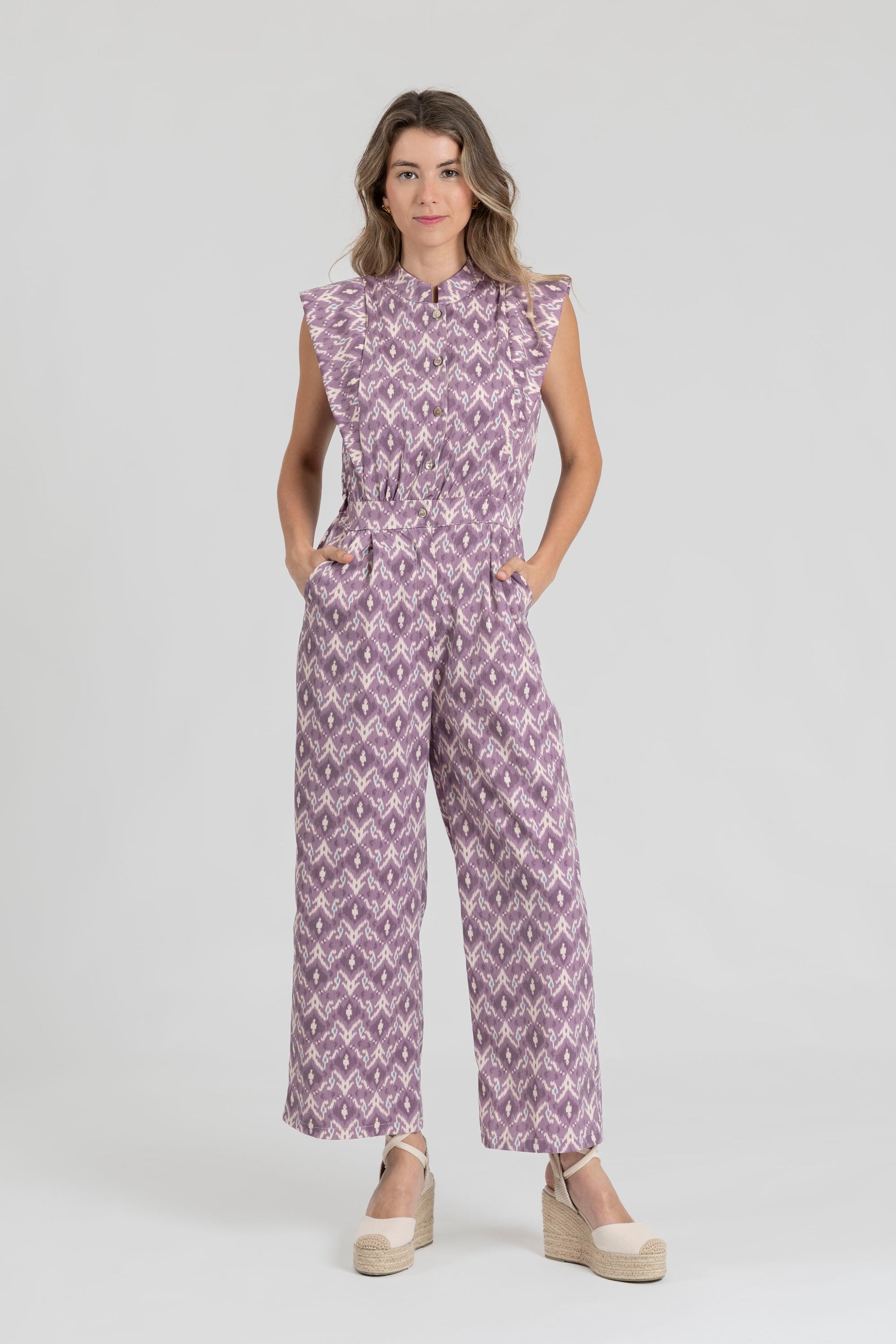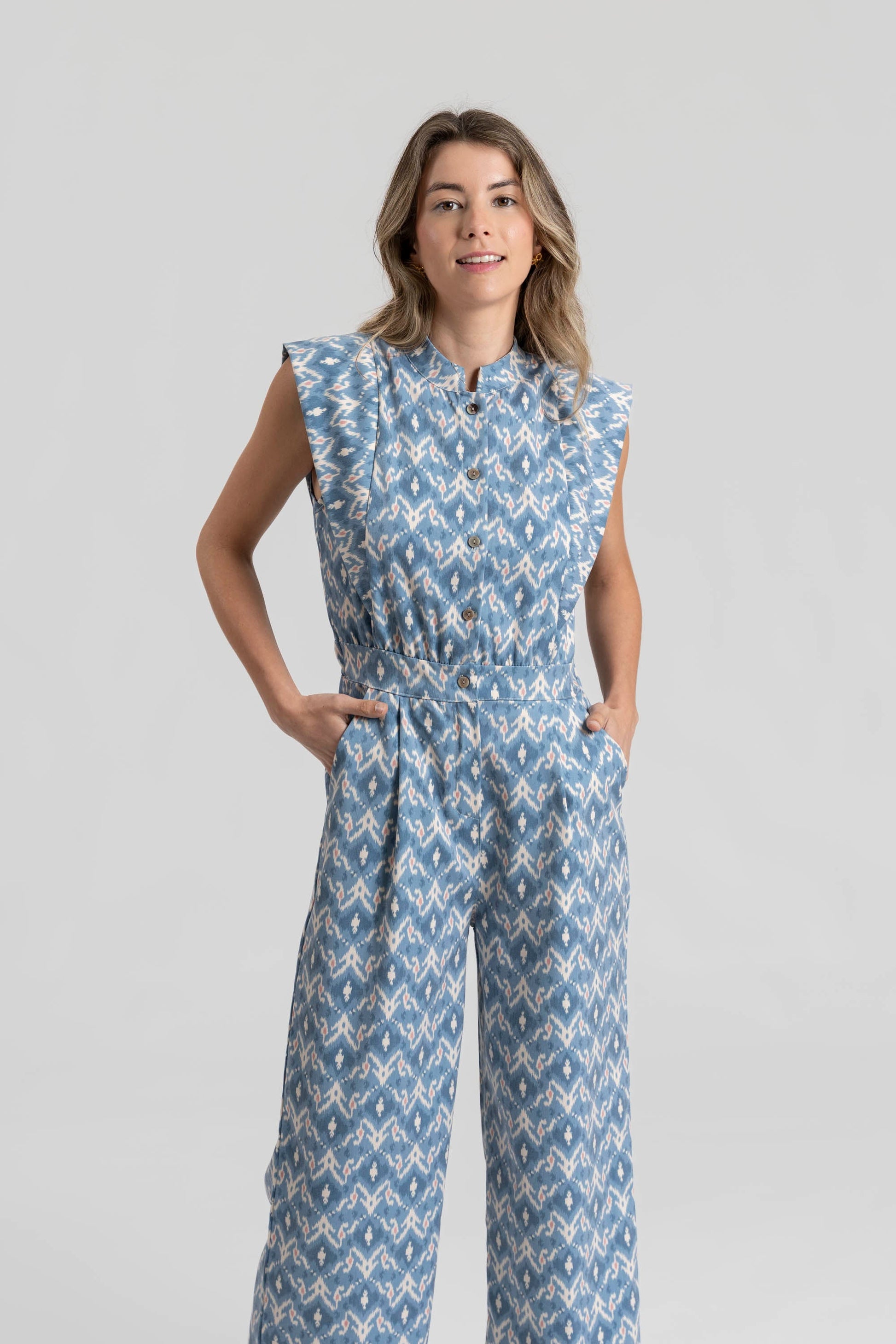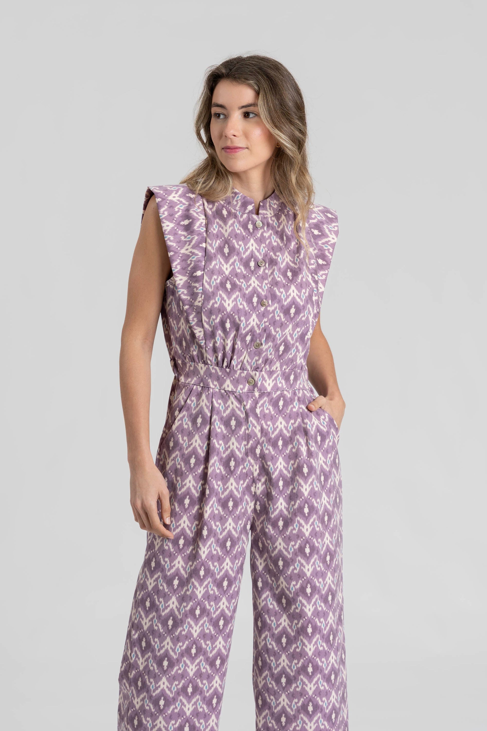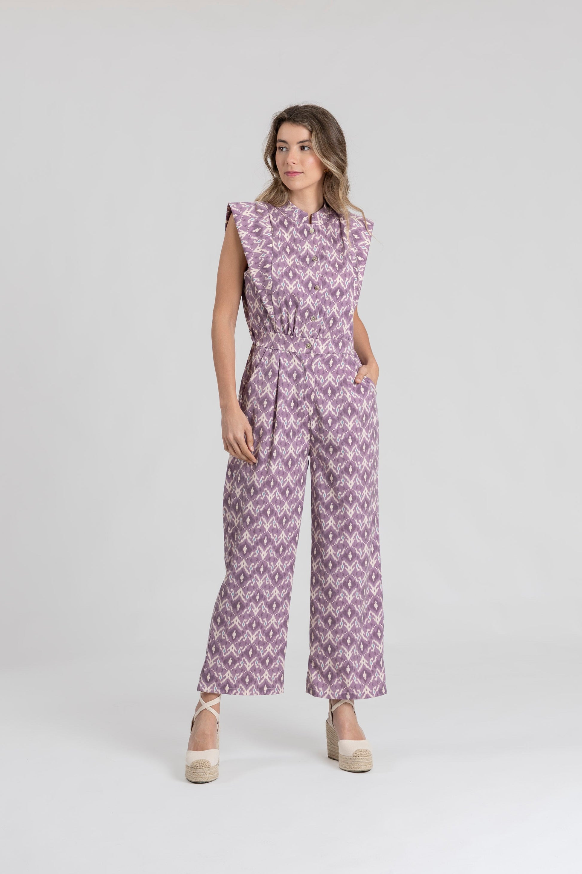 Tejido fluido. Diseño estampado. Diseño largo. Diseño recto. Manga sisa. Bolsillos laterales. Elástico trasero. Abotonado en la nuca.