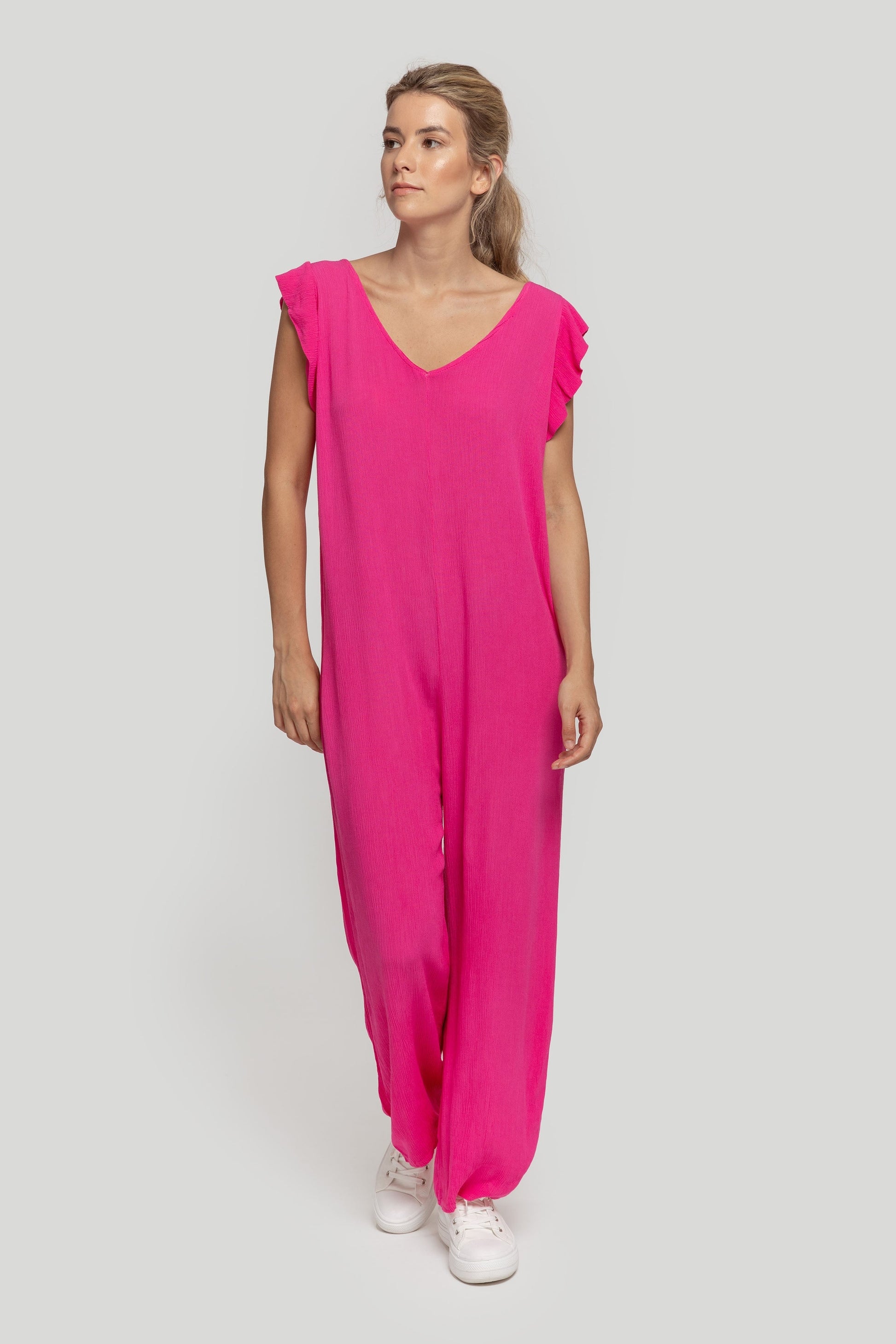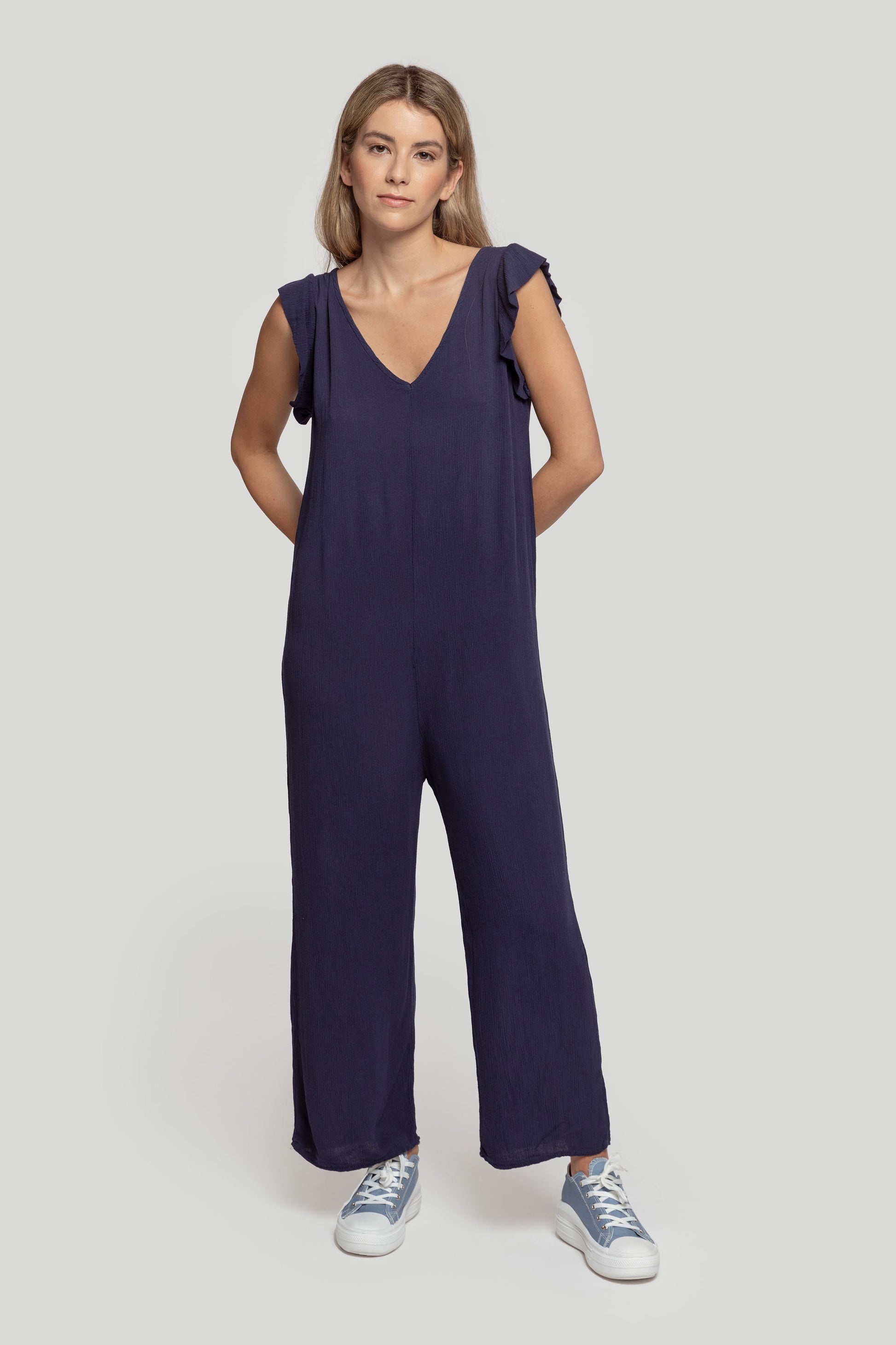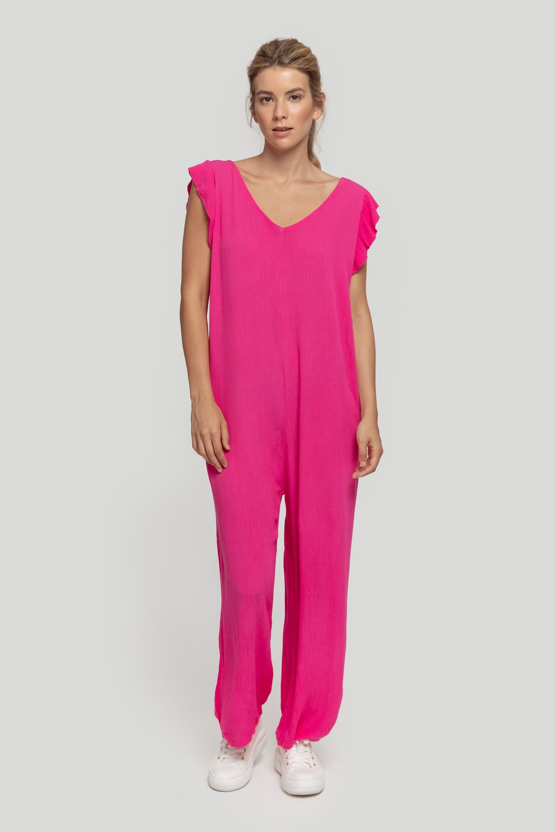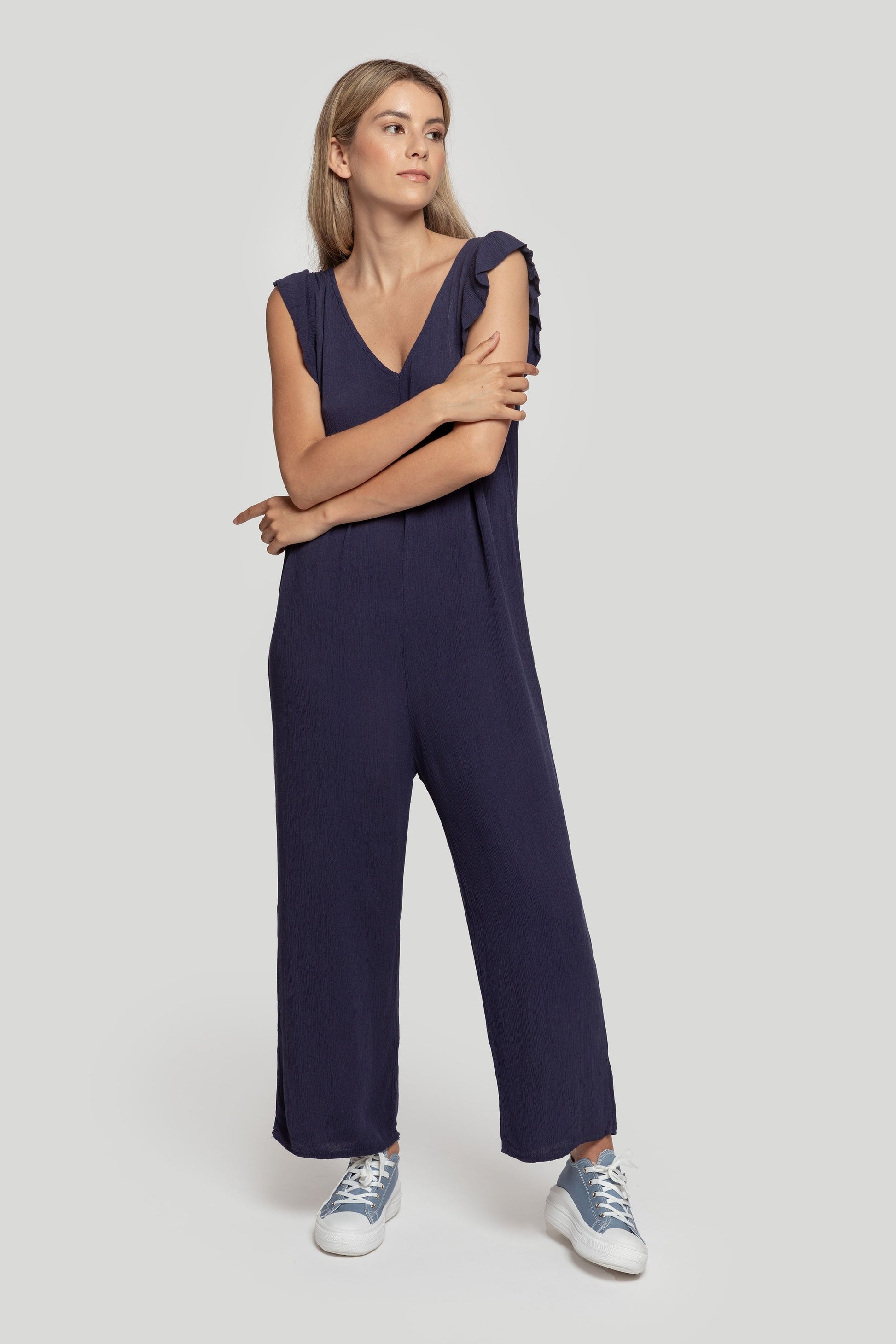 Mono largo. Tejido efecto arrugado. Diseño fluido. Diseño recto. Cuello pico. Sin mangas. Tirante en la espalda. Talla modelo: S. Altura modelo 1,70 m.