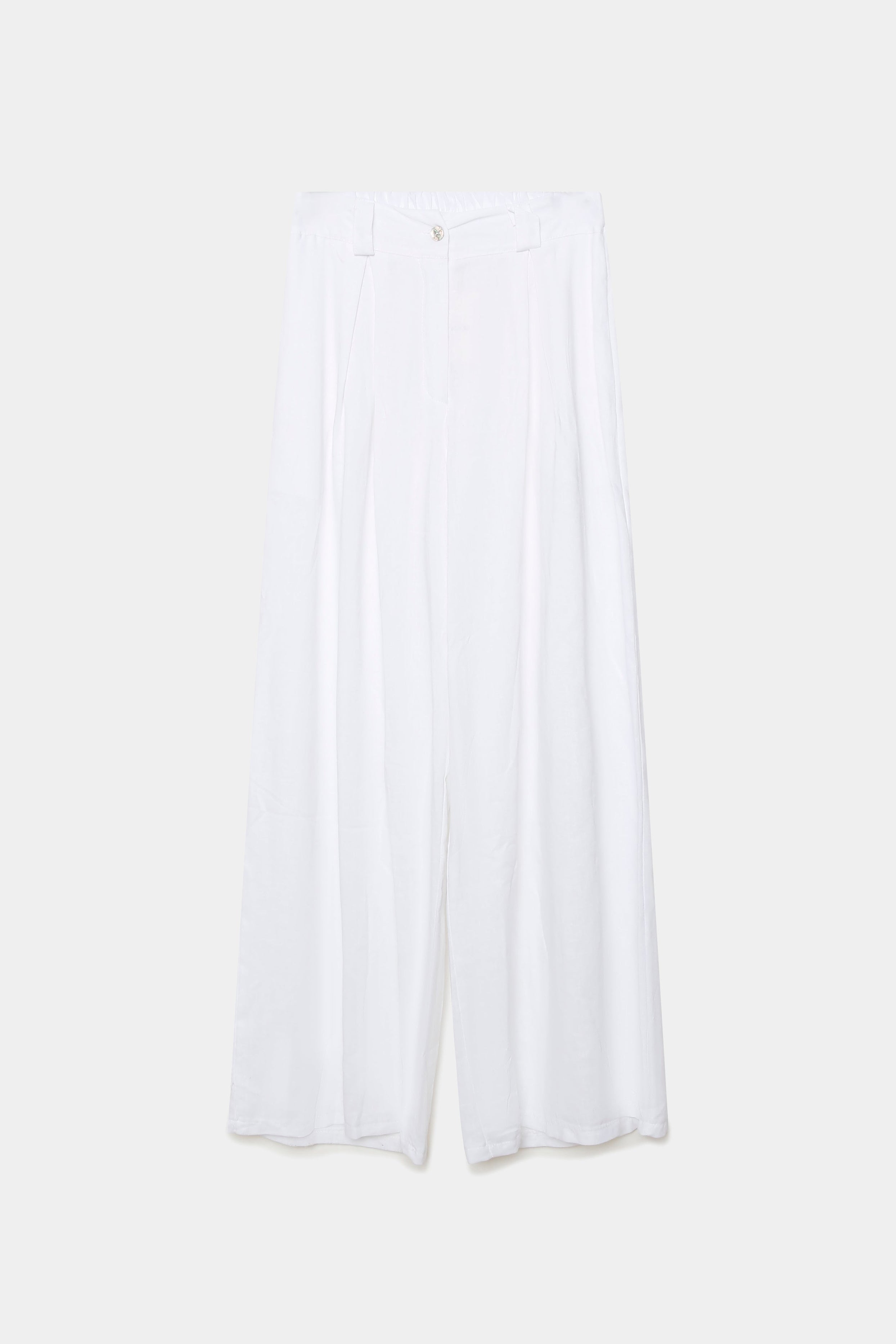 Tejido mezcla de lino. Diseño recto. Diseño largo. Diseño amplio. Cierre de botón y cremallera. Bolsillos laterales. Elástico en espalda. Trabillas.