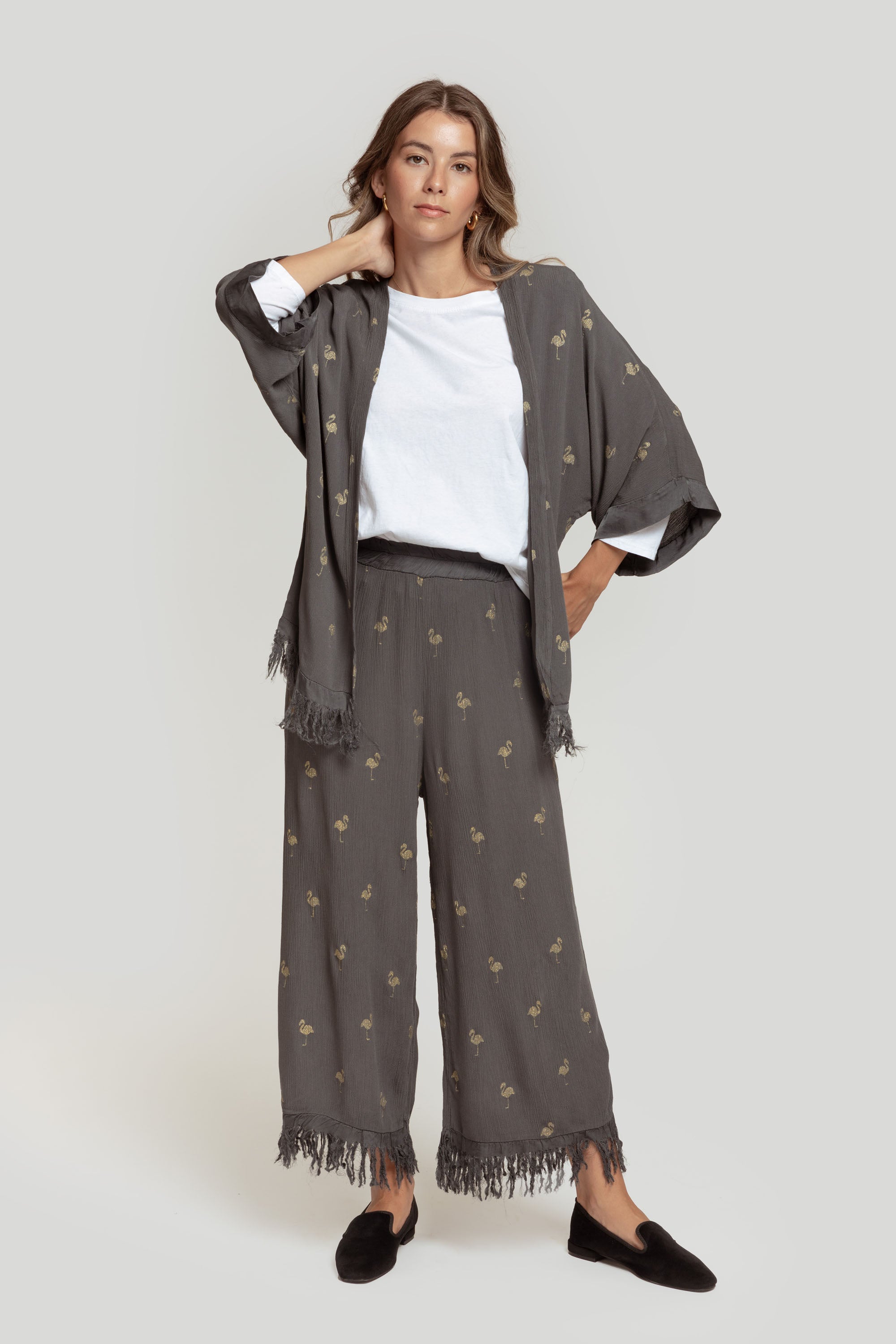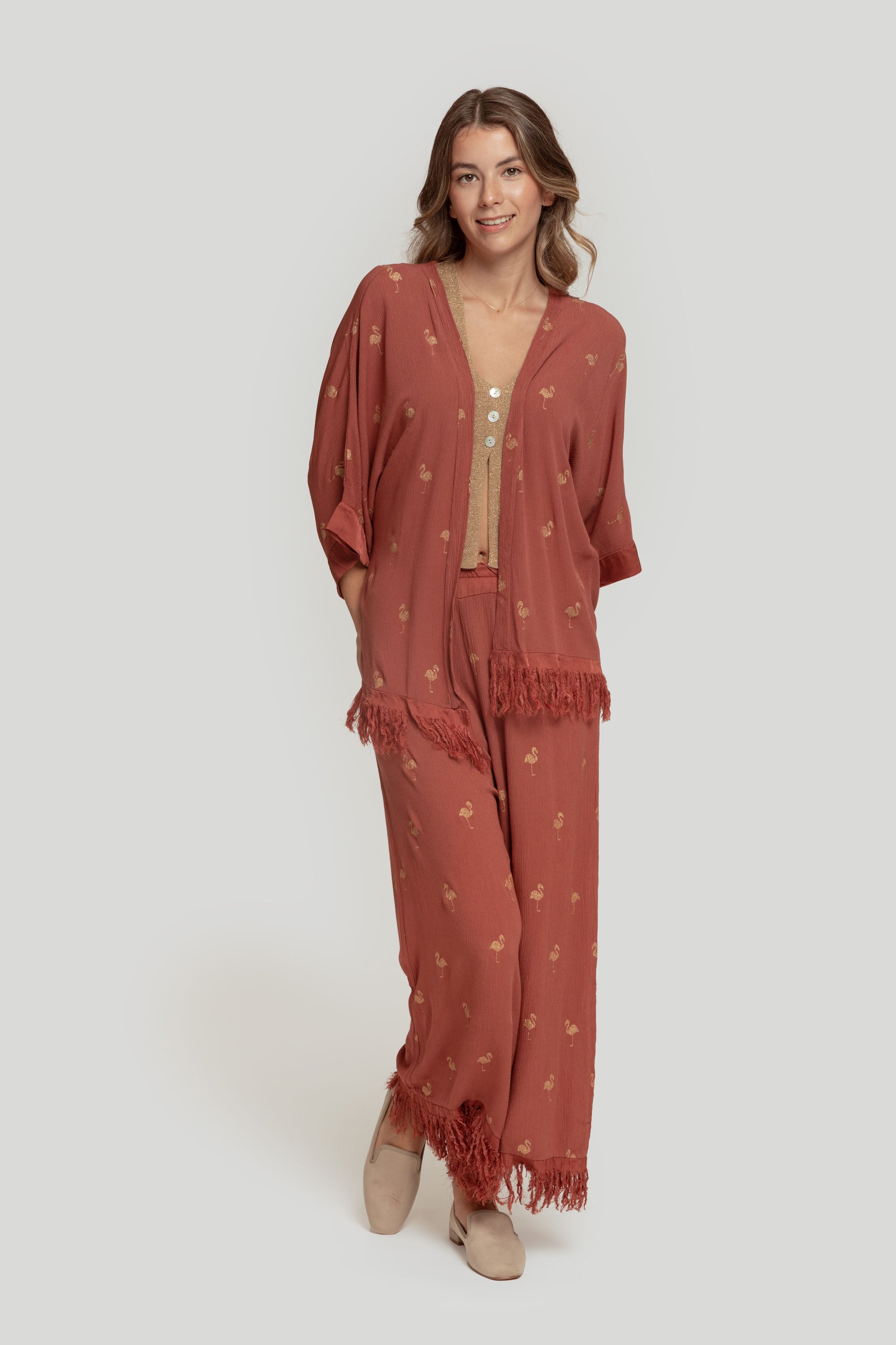 Tejido efecto arrugado. Diseño estampado. Diseño fluido. Diseño culotte. Talle medio. Cintura elástica. Perneras amplias. Bajo flecos. Talla modelo: S. Altura modelo: 1,70 m.