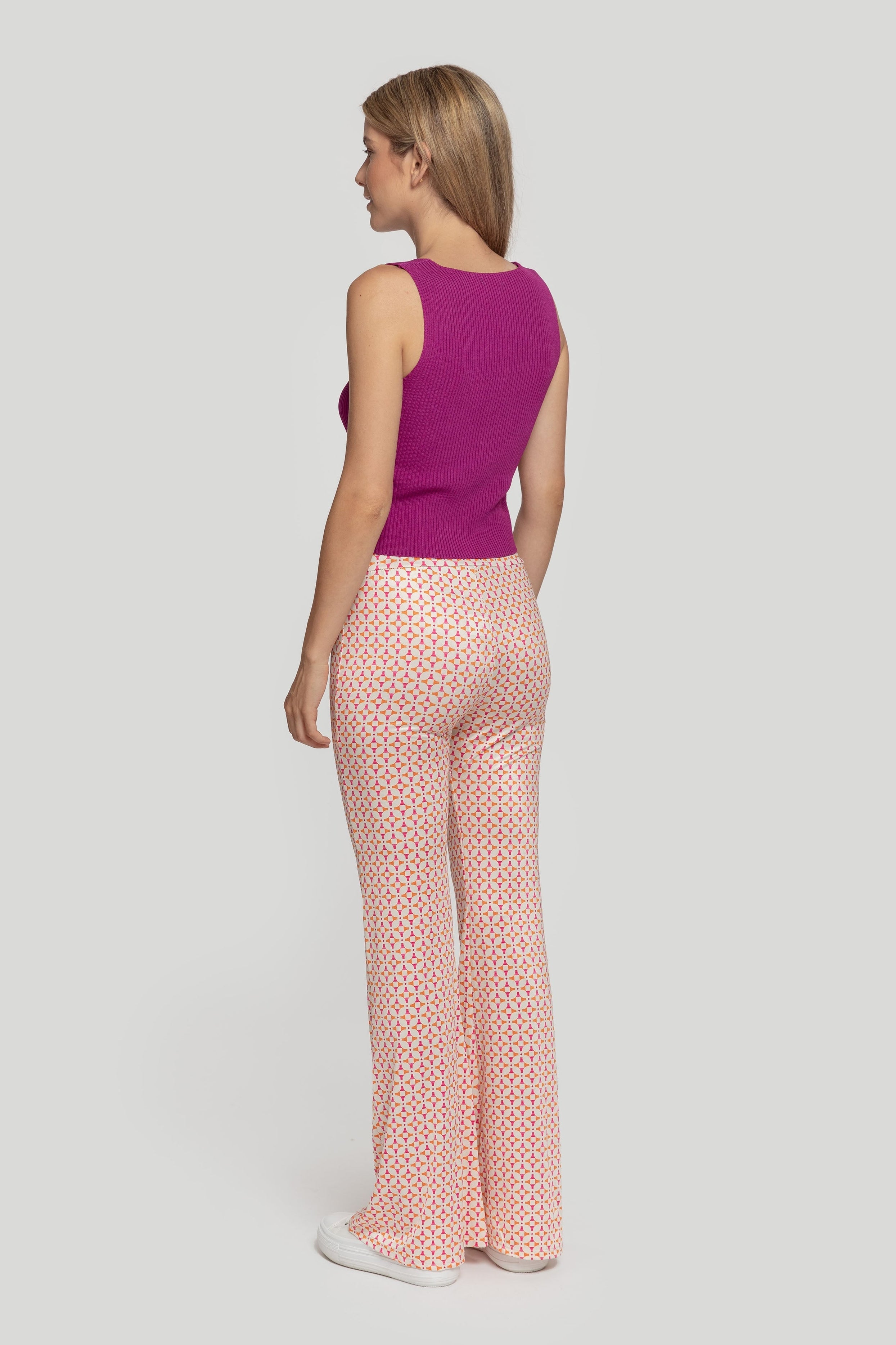 Pantalón estampado. Tejido satinado. Diseño flare. Talle bajo. Cintura elástica. Talla modelo: S. Altura modelo: 1,70 m.