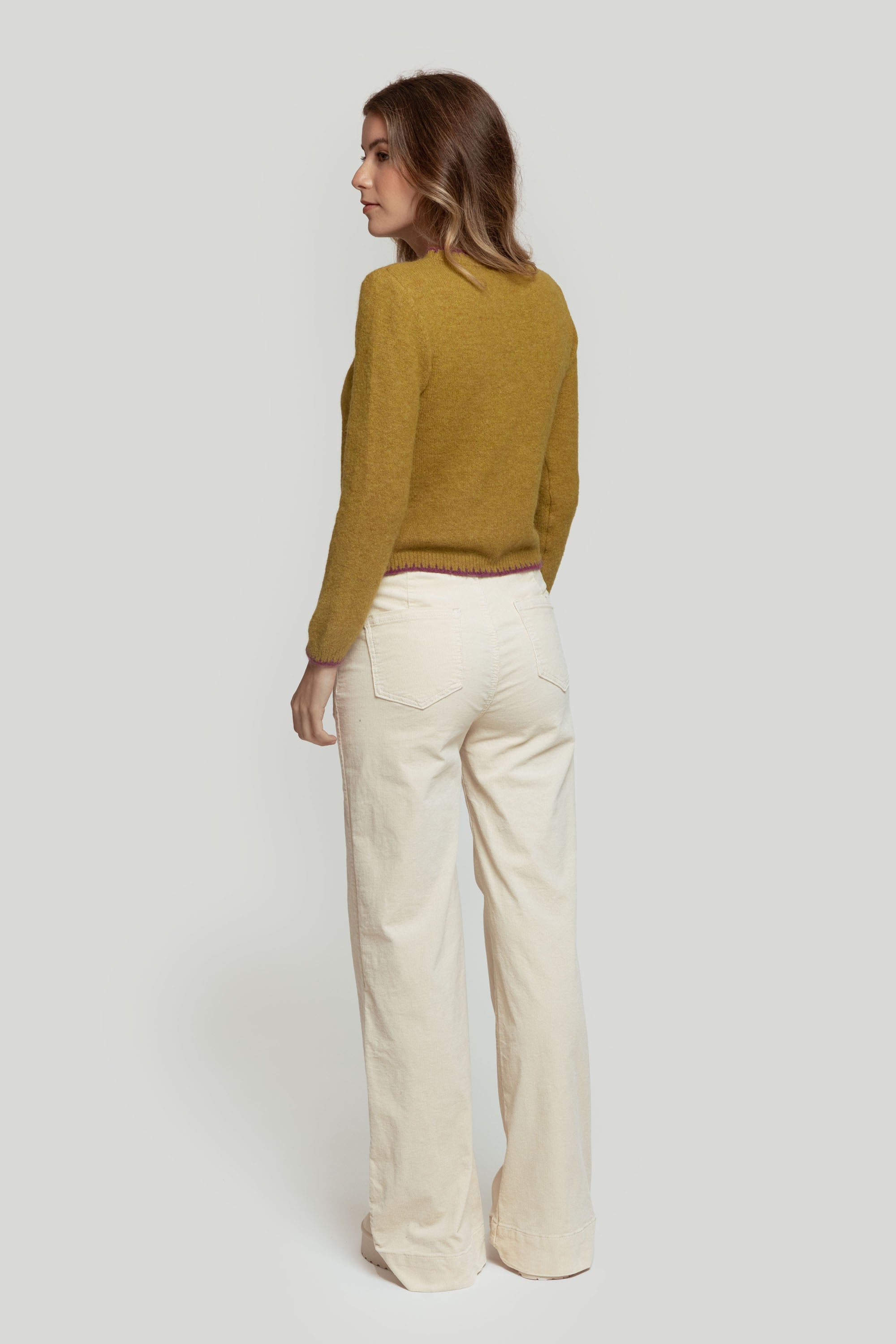 Tejido pana. Tejido mezcla de algodón. Diseño recto. Diseño culotte. Tiro alto. Bolsillos frontales de solapa. Cierre de cremallera y botón. Trabillas. Talla modelo: 36. Altura modelo 1,70 m.