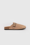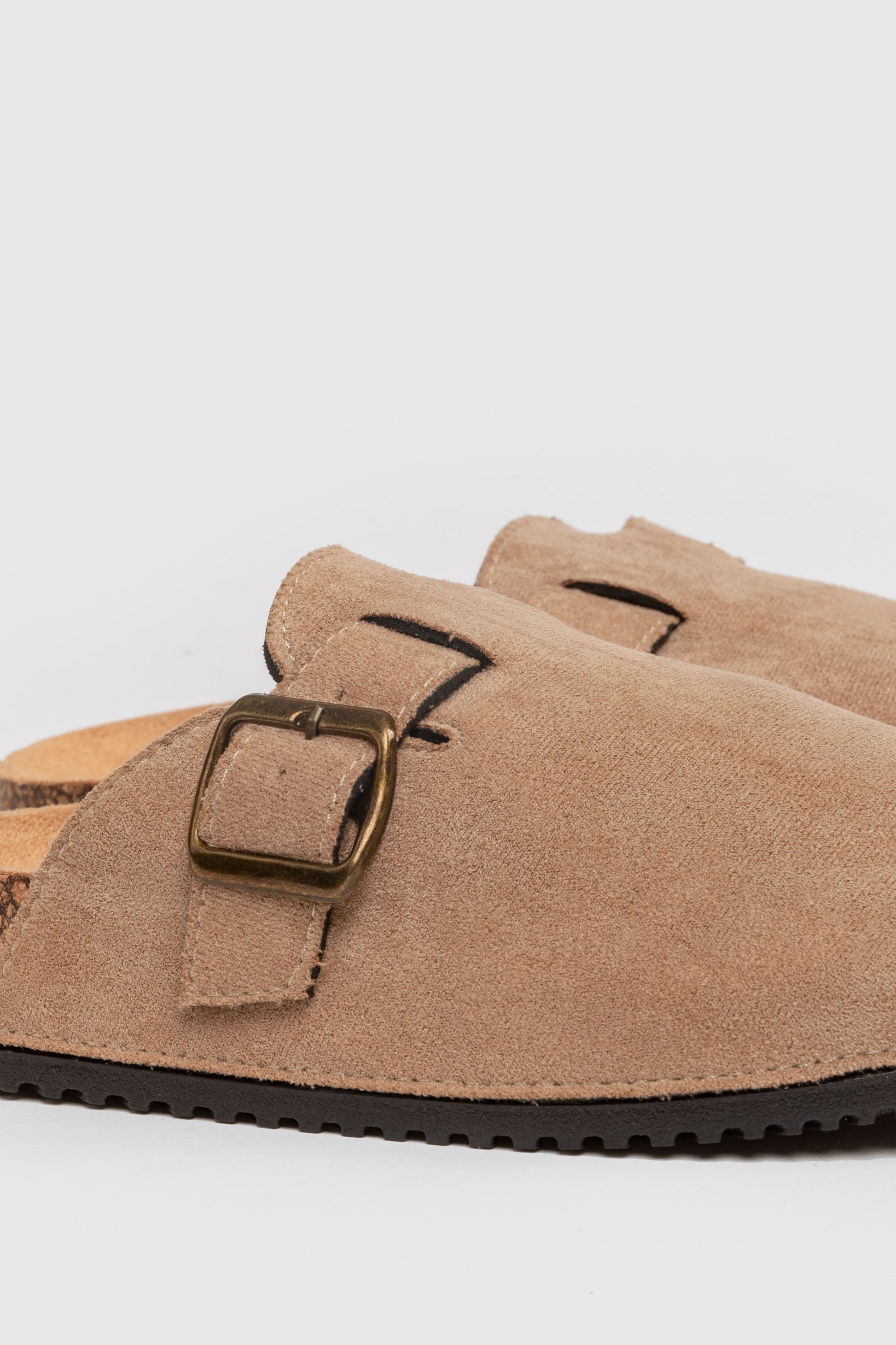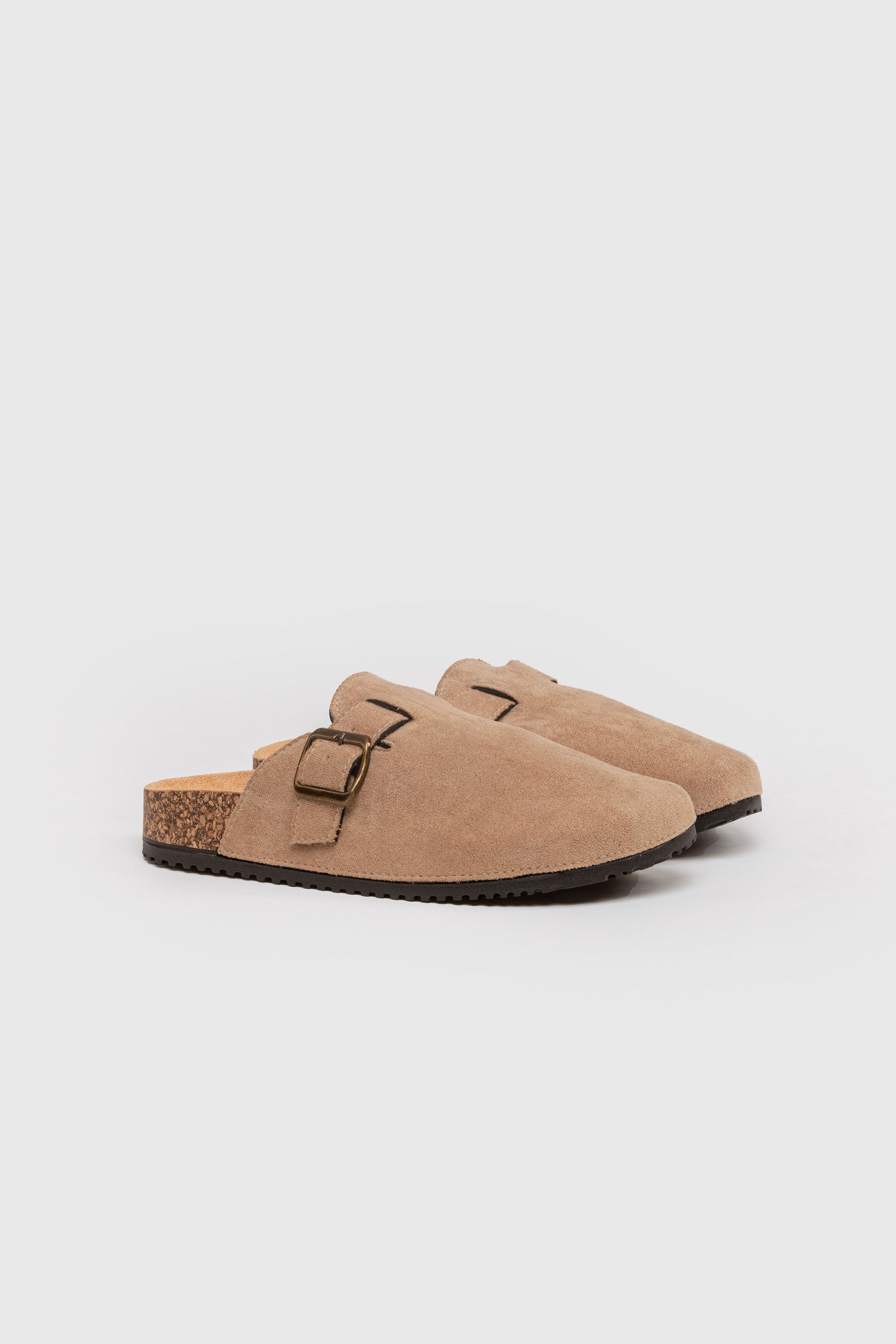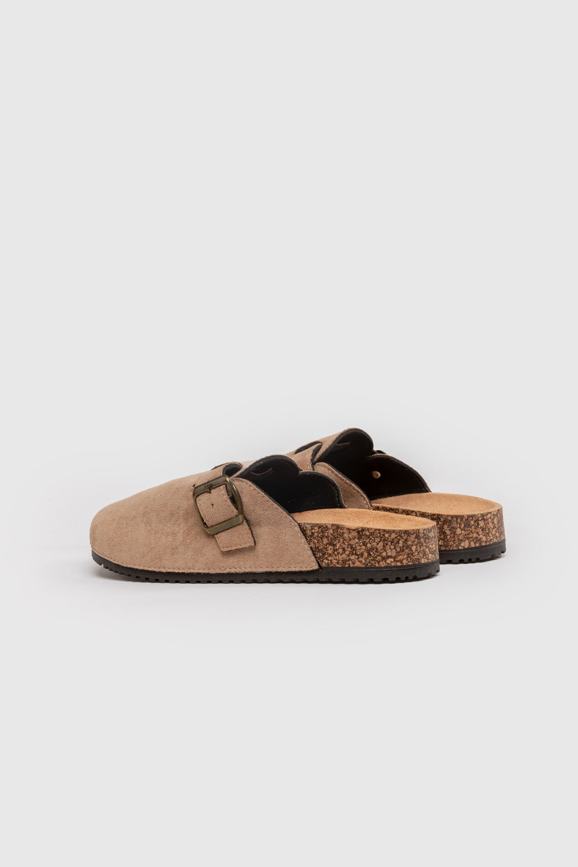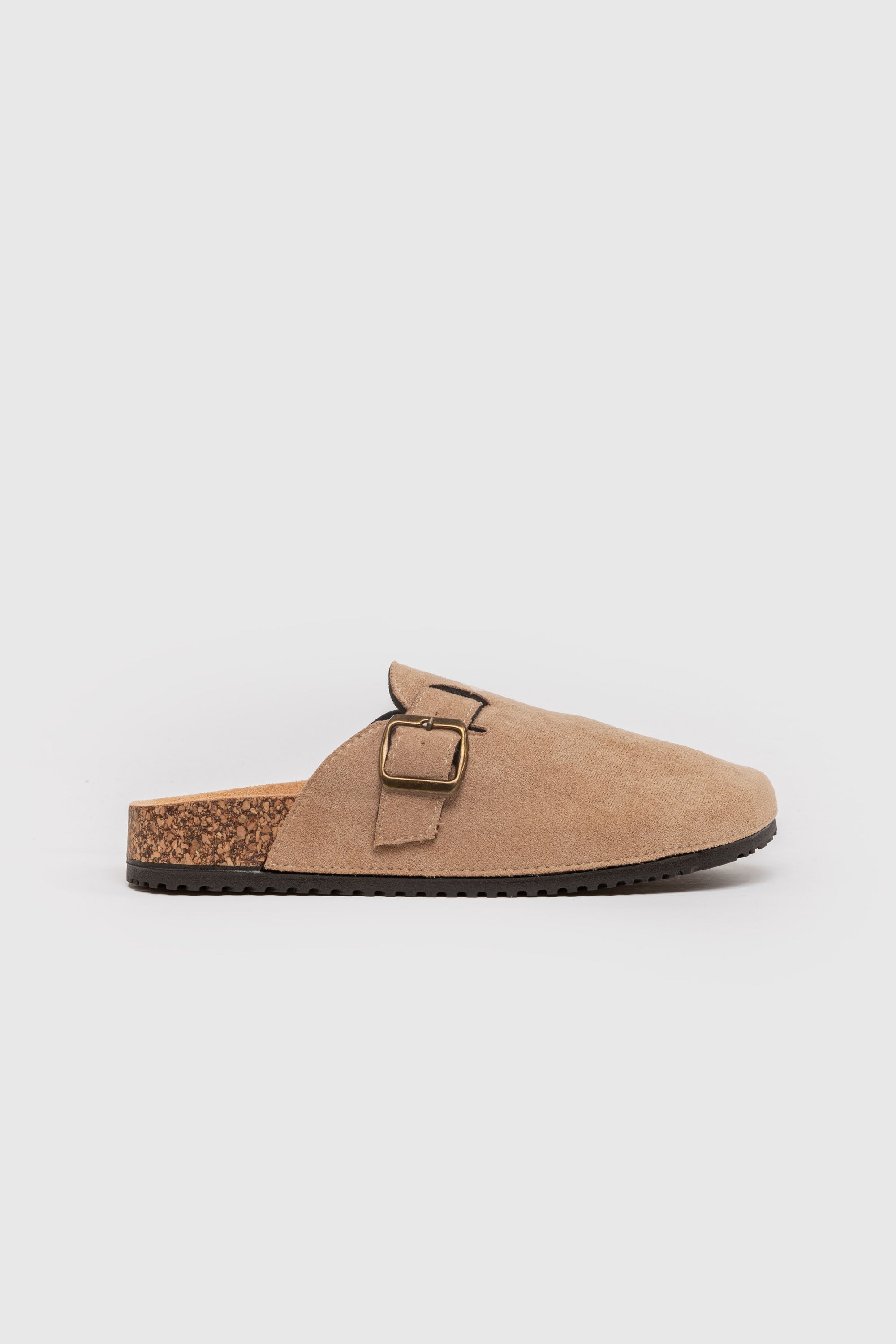 Zapato tipo zuecos. Tejido de antelina. Diseño destalonado. Suela bio de corcho. Plantilla confort. Suela plana y antideslizante. Detalle hebilla.