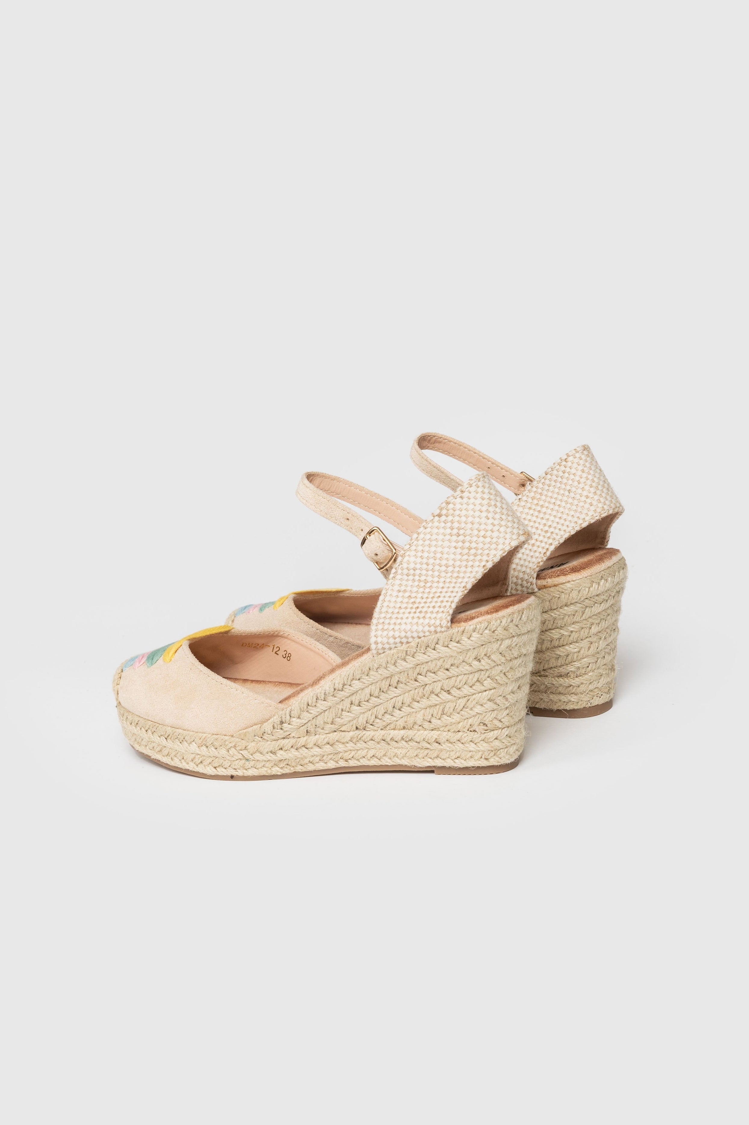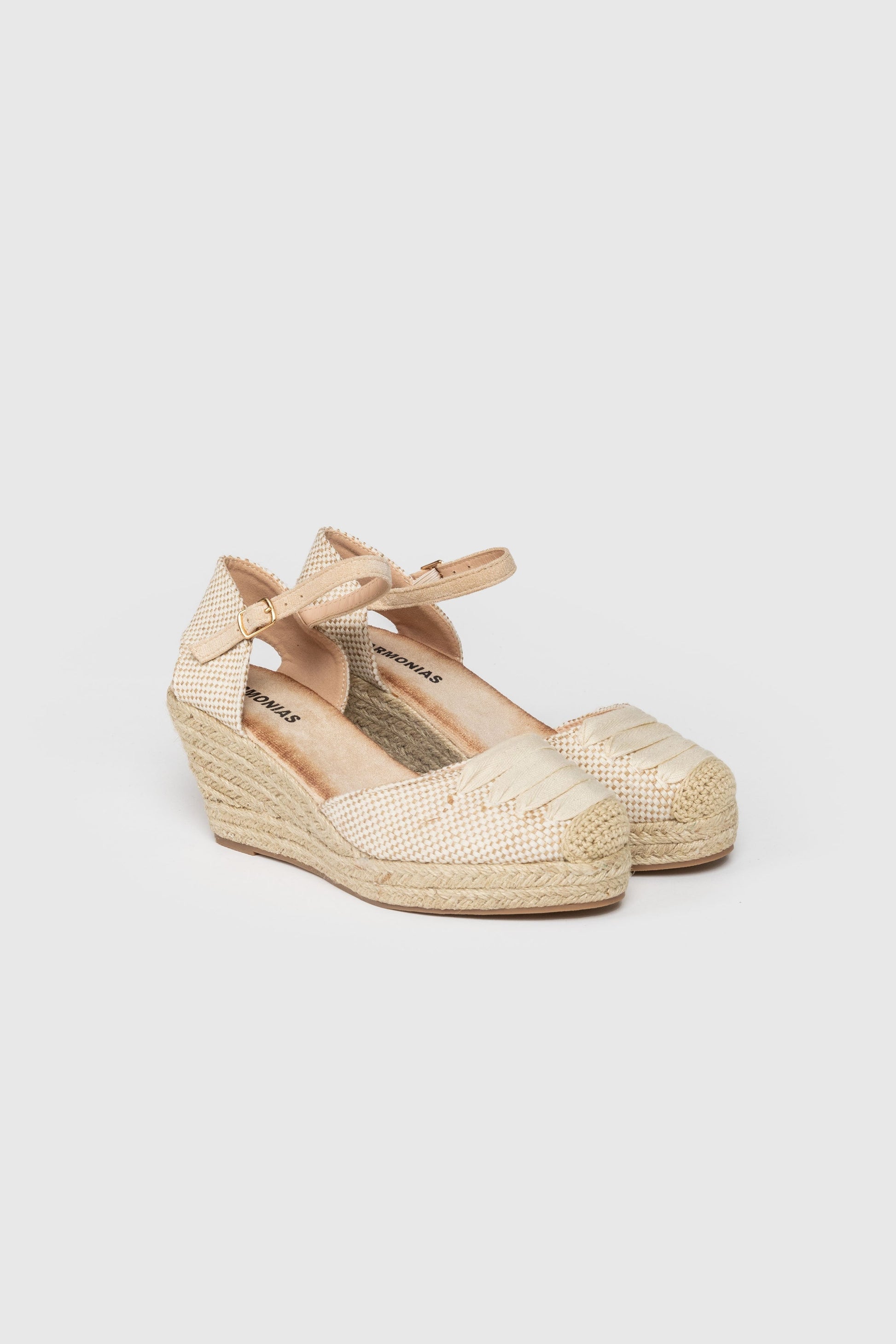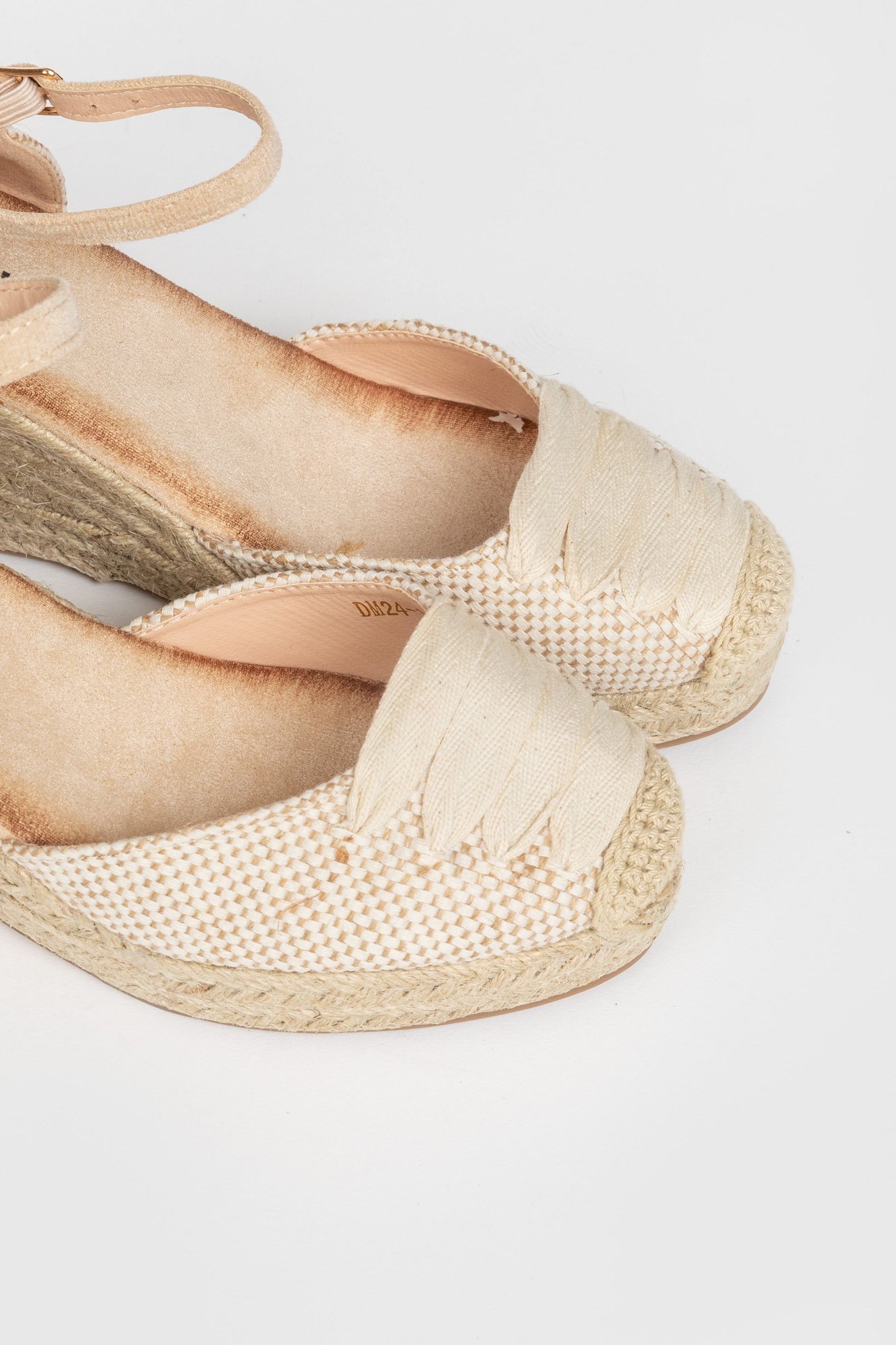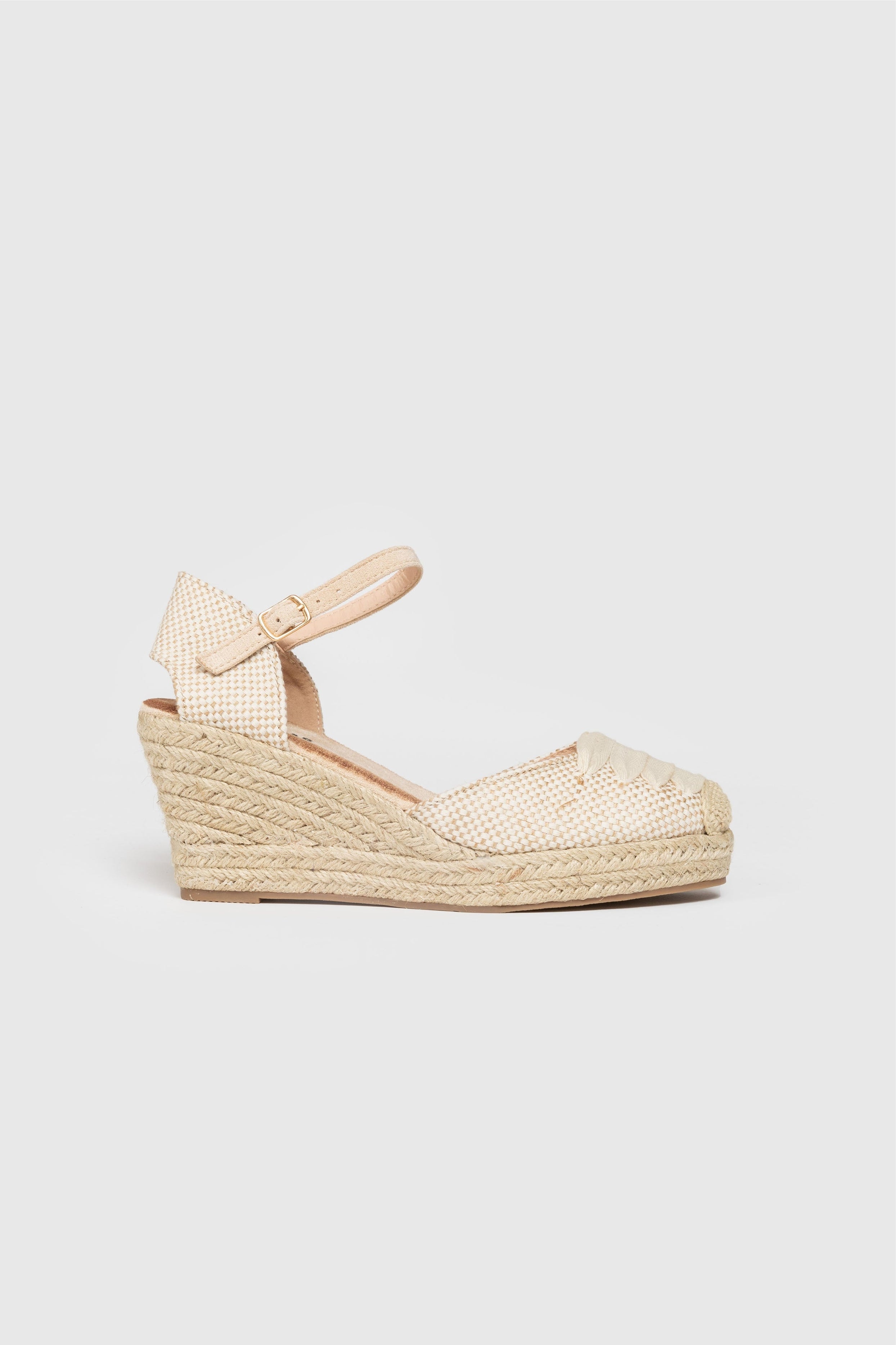 Sandalia cuña. Tejido lona. Diseño cordones. Punta redondeada. Cuña de esparto. Cierre de hebilla. Atada al tobillo. Suela de contacto antideslizante. Altura cuña: 8.0 cm.