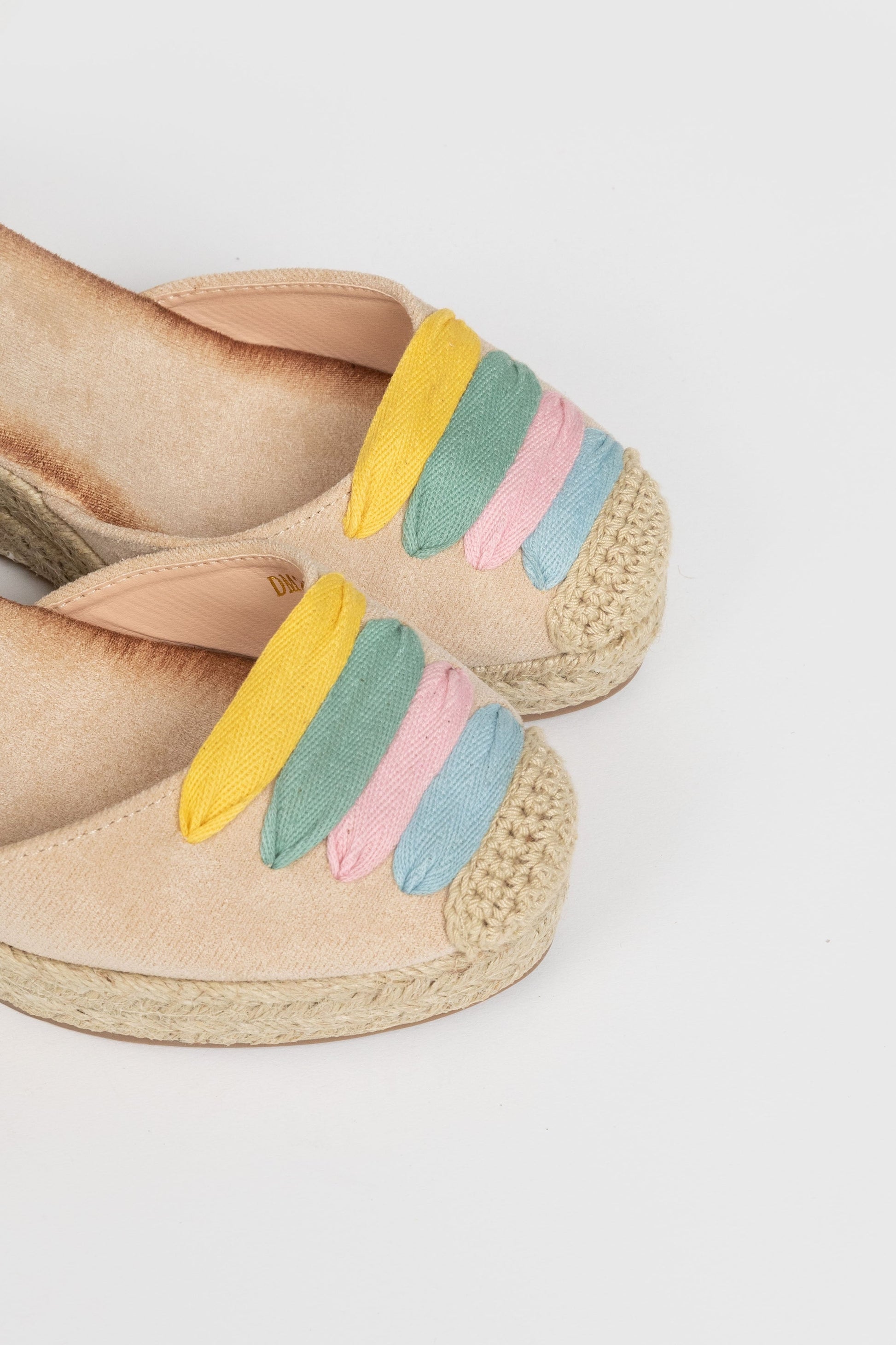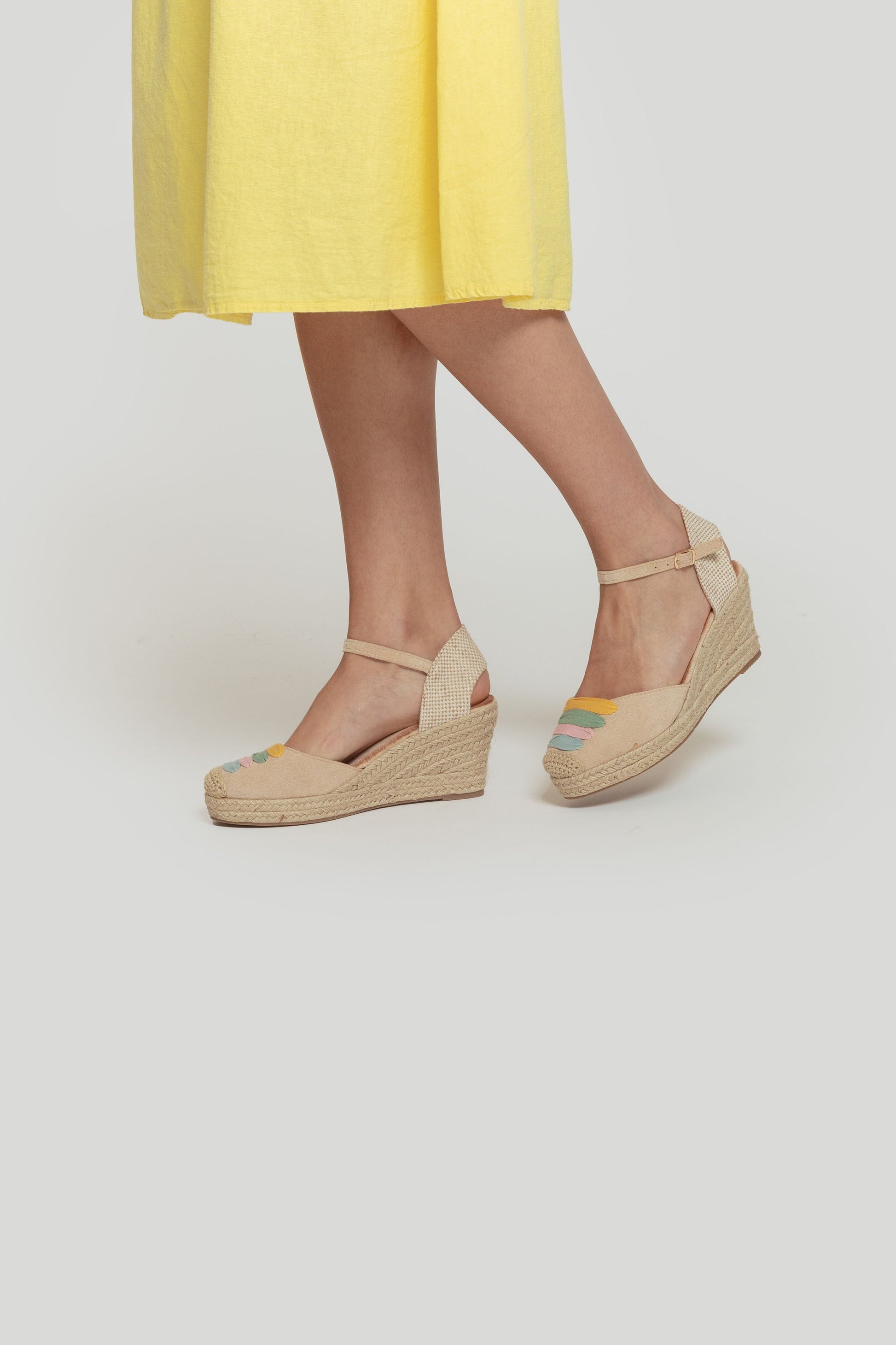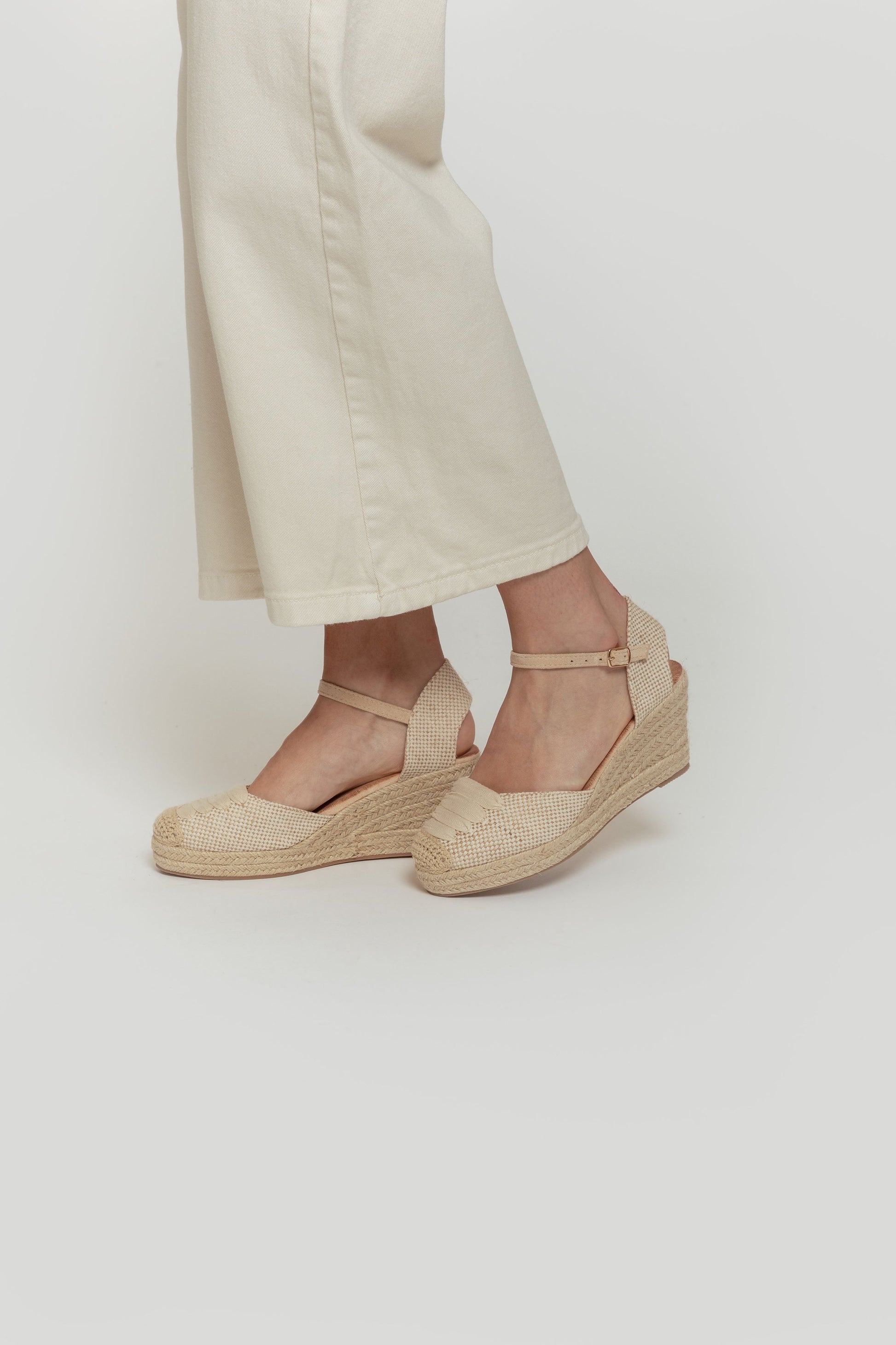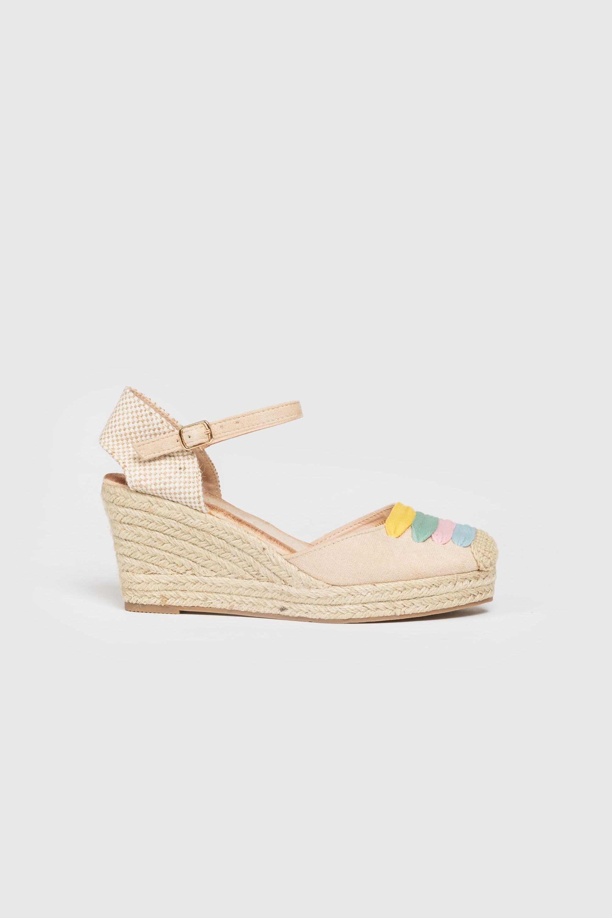 Sandalia cuña. Tejido lona. Diseño cordones. Punta redondeada. Cuña de esparto. Cierre de hebilla. Atada al tobillo. Suela de contacto antideslizante. Altura cuña: 8.0 cm.